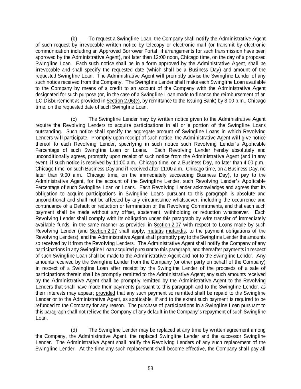 53 (b) To request a Swingline Loan, the Company shall notify the Administrative Agent of such request by irrevocable written notice by telecopy or electronic mail (or transmit by electronic communication including an Approved Borrower Portal, if arrangements for such transmission have been approved by the Administrative Agent), not later than 12:00 noon, Chicago time, on the day of a proposed Swingline Loan. Each such notice shall be in a form approved by the Administrative Agent, shall be irrevocable and shall specify the requested date (which shall be a Business Day) and amount of the requested Swingline Loan. The Administrative Agent will promptly advise the Swingline Lender of any such notice received from the Company. The Swingline Lender shall make each Swingline Loan available to the Company by means of a credit to an account of the Company with the Administrative Agent designated for such purpose (or, in the case of a Swingline Loan made to finance the reimbursement of an LC Disbursement as provided in Section 2.06(e), by remittance to the Issuing Bank) by 3:00 p.m., Chicago time, on the requested date of such Swingline Loan. (c) The Swingline Lender may by written notice given to the Administrative Agent require the Revolving Lenders to acquire participations in all or a portion of the Swingline Loans outstanding. Such notice shall specify the aggregate amount of Swingline Loans in which Revolving Lenders will participate. Promptly upon receipt of such notice, the Administrative Agent will give notice thereof to each Revolving Lender, specifying in such notice such Revolving Lender’s Applicable Percentage of such Swingline Loan or Loans. Each Revolving Lender hereby absolutely and unconditionally agrees, promptly upon receipt of such notice from the Administrative Agent (and in any event, if such notice is received by 11:00 a.m., Chicago time, on a Business Day, no later than 4:00 p.m., Chicago time, on such Business Day and if received after 11:00 a.m., Chicago time, on a Business Day, no later than 9:00 a.m., Chicago time, on the immediately succeeding Business Day), to pay to the Administrative Agent, for the account of the Swingline Lender, such Revolving Lender’s Applicable Percentage of such Swingline Loan or Loans. Each Revolving Lender acknowledges and agrees that its obligation to acquire participations in Swingline Loans pursuant to this paragraph is absolute and unconditional and shall not be affected by any circumstance whatsoever, including the occurrence and continuance of a Default or reduction or termination of the Revolving Commitments, and that each such payment shall be made without any offset, abatement, withholding or reduction whatsoever. Each Revolving Lender shall comply with its obligation under this paragraph by wire transfer of immediately available funds, in the same manner as provided in Section 2.07 with respect to Loans made by such Revolving Lender (and Section 2.07 shall apply, mutatis mutandis, to the payment obligations of the Revolving Lenders), and the Administrative Agent shall promptly pay to the Swingline Lender the amounts so received by it from the Revolving Lenders. The Administrative Agent shall notify the Company of any participations in any Swingline Loan acquired pursuant to this paragraph, and thereafter payments in respect of such Swingline Loan shall be made to the Administrative Agent and not to the Swingline Lender. Any amounts received by the Swingline Lender from the Company (or other party on behalf of the Company) in respect of a Swingline Loan after receipt by the Swingline Lender of the proceeds of a sale of participations therein shall be promptly remitted to the Administrative Agent; any such amounts received by the Administrative Agent shall be promptly remitted by the Administrative Agent to the Revolving Lenders that shall have made their payments pursuant to this paragraph and to the Swingline Lender, as their interests may appear; provided that any such payment so remitted shall be repaid to the Swingline Lender or to the Administrative Agent, as applicable, if and to the extent such payment is required to be refunded to the Company for any reason. The purchase of participations in a Swingline Loan pursuant to this paragraph shall not relieve the Company of any default in the Company’s repayment of such Swingline Loan. (d) The Swingline Lender may be replaced at any time by written agreement among the Company, the Administrative Agent, the replaced Swingline Lender and the successor Swingline Lender. The Administrative Agent shall notify the Revolving Lenders of any such replacement of the Swingline Lender. At the time any such replacement shall become effective, the Company shall pay all