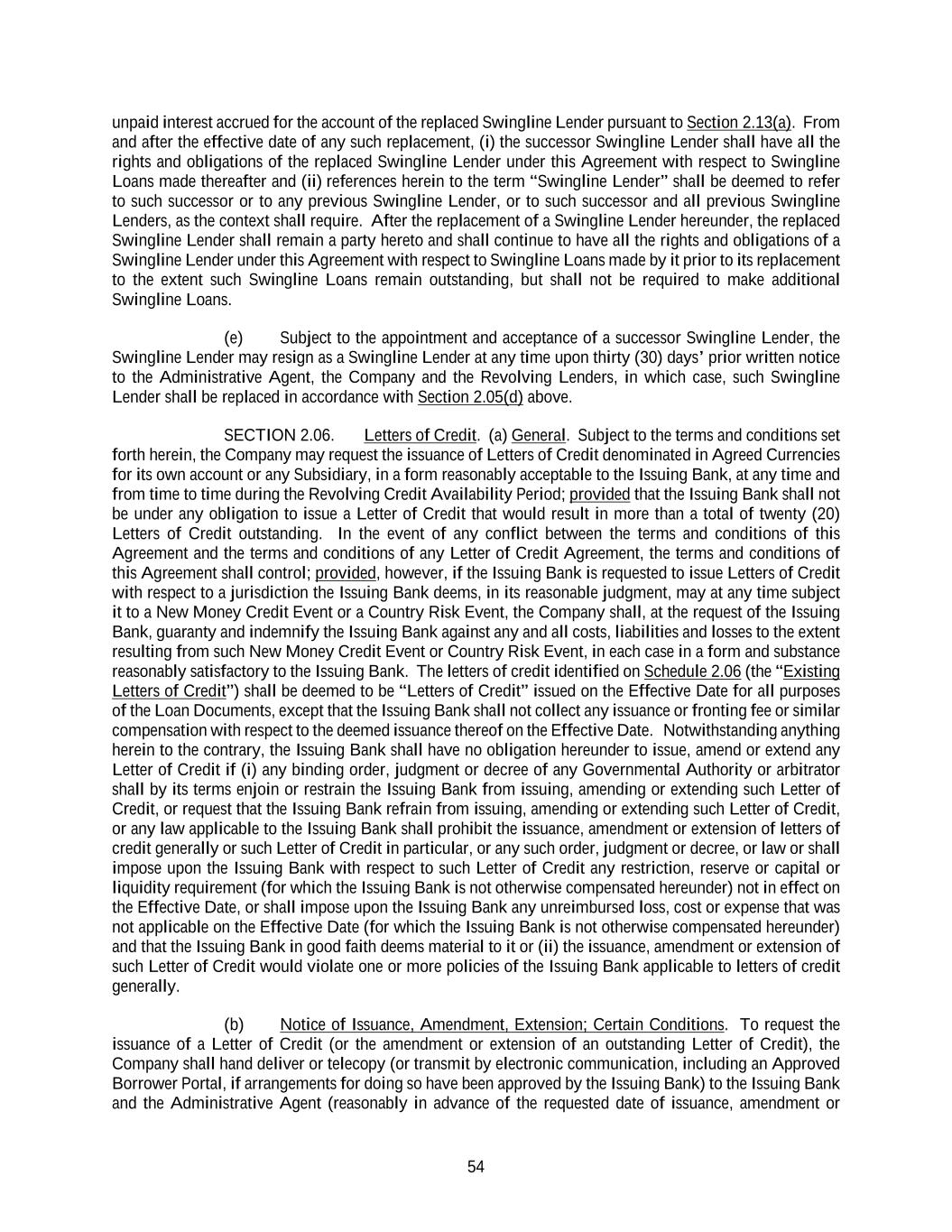 54 unpaid interest accrued for the account of the replaced Swingline Lender pursuant to Section 2.13(a). From and after the effective date of any such replacement, (i) the successor Swingline Lender shall have all the rights and obligations of the replaced Swingline Lender under this Agreement with respect to Swingline Loans made thereafter and (ii) references herein to the term “Swingline Lender” shall be deemed to refer to such successor or to any previous Swingline Lender, or to such successor and all previous Swingline Lenders, as the context shall require. After the replacement of a Swingline Lender hereunder, the replaced Swingline Lender shall remain a party hereto and shall continue to have all the rights and obligations of a Swingline Lender under this Agreement with respect to Swingline Loans made by it prior to its replacement to the extent such Swingline Loans remain outstanding, but shall not be required to make additional Swingline Loans. (e) Subject to the appointment and acceptance of a successor Swingline Lender, the Swingline Lender may resign as a Swingline Lender at any time upon thirty (30) days’ prior written notice to the Administrative Agent, the Company and the Revolving Lenders, in which case, such Swingline Lender shall be replaced in accordance with Section 2.05(d) above. SECTION 2.06. Letters of Credit. (a) General. Subject to the terms and conditions set forth herein, the Company may request the issuance of Letters of Credit denominated in Agreed Currencies for its own account or any Subsidiary, in a form reasonably acceptable to the Issuing Bank, at any time and from time to time during the Revolving Credit Availability Period; provided that the Issuing Bank shall not be under any obligation to issue a Letter of Credit that would result in more than a total of twenty (20) Letters of Credit outstanding. In the event of any conflict between the terms and conditions of this Agreement and the terms and conditions of any Letter of Credit Agreement, the terms and conditions of this Agreement shall control; provided, however, if the Issuing Bank is requested to issue Letters of Credit with respect to a jurisdiction the Issuing Bank deems, in its reasonable judgment, may at any time subject it to a New Money Credit Event or a Country Risk Event, the Company shall, at the request of the Issuing Bank, guaranty and indemnify the Issuing Bank against any and all costs, liabilities and losses to the extent resulting from such New Money Credit Event or Country Risk Event, in each case in a form and substance reasonably satisfactory to the Issuing Bank. The letters of credit identified on Schedule 2.06 (the “Existing Letters of Credit”) shall be deemed to be “Letters of Credit” issued on the Effective Date for all purposes of the Loan Documents, except that the Issuing Bank shall not collect any issuance or fronting fee or similar compensation with respect to the deemed issuance thereof on the Effective Date. Notwithstanding anything herein to the contrary, the Issuing Bank shall have no obligation hereunder to issue, amend or extend any Letter of Credit if (i) any binding order, judgment or decree of any Governmental Authority or arbitrator shall by its terms enjoin or restrain the Issuing Bank from issuing, amending or extending such Letter of Credit, or request that the Issuing Bank refrain from issuing, amending or extending such Letter of Credit, or any law applicable to the Issuing Bank shall prohibit the issuance, amendment or extension of letters of credit generally or such Letter of Credit in particular, or any such order, judgment or decree, or law or shall impose upon the Issuing Bank with respect to such Letter of Credit any restriction, reserve or capital or liquidity requirement (for which the Issuing Bank is not otherwise compensated hereunder) not in effect on the Effective Date, or shall impose upon the Issuing Bank any unreimbursed loss, cost or expense that was not applicable on the Effective Date (for which the Issuing Bank is not otherwise compensated hereunder) and that the Issuing Bank in good faith deems material to it or (ii) the issuance, amendment or extension of such Letter of Credit would violate one or more policies of the Issuing Bank applicable to letters of credit generally. (b) Notice of Issuance, Amendment, Extension; Certain Conditions. To request the issuance of a Letter of Credit (or the amendment or extension of an outstanding Letter of Credit), the Company shall hand deliver or telecopy (or transmit by electronic communication, including an Approved Borrower Portal, if arrangements for doing so have been approved by the Issuing Bank) to the Issuing Bank and the Administrative Agent (reasonably in advance of the requested date of issuance, amendment or