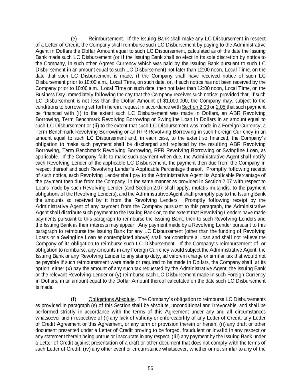 56 (e) Reimbursement. If the Issuing Bank shall make any LC Disbursement in respect of a Letter of Credit, the Company shall reimburse such LC Disbursement by paying to the Administrative Agent in Dollars the Dollar Amount equal to such LC Disbursement, calculated as of the date the Issuing Bank made such LC Disbursement (or if the Issuing Bank shall so elect in its sole discretion by notice to the Company, in such other Agreed Currency which was paid by the Issuing Bank pursuant to such LC Disbursement in an amount equal to such LC Disbursement) not later than 12:00 noon, Local Time, on the date that such LC Disbursement is made, if the Company shall have received notice of such LC Disbursement prior to 10:00 a.m., Local Time, on such date, or, if such notice has not been received by the Company prior to 10:00 a.m., Local Time on such date, then not later than 12:00 noon, Local Time, on the Business Day immediately following the day that the Company receives such notice; provided that, if such LC Disbursement is not less than the Dollar Amount of $1,000,000, the Company may, subject to the conditions to borrowing set forth herein, request in accordance with Section 2.03 or 2.05 that such payment be financed with (i) to the extent such LC Disbursement was made in Dollars, an ABR Revolving Borrowing, Term Benchmark Revolving Borrowing or Swingline Loan in Dollars in an amount equal to such LC Disbursement or (ii) to the extent that such LC Disbursement was made in a Foreign Currency, a Term Benchmark Revolving Borrowing or an RFR Revolving Borrowing in such Foreign Currency in an amount equal to such LC Disbursement and, in each case, to the extent so financed, the Company’s obligation to make such payment shall be discharged and replaced by the resulting ABR Revolving Borrowing, Term Benchmark Revolving Borrowing, RFR Revolving Borrowing or Swingline Loan, as applicable. If the Company fails to make such payment when due, the Administrative Agent shall notify each Revolving Lender of the applicable LC Disbursement, the payment then due from the Company in respect thereof and such Revolving Lender’s Applicable Percentage thereof. Promptly following receipt of such notice, each Revolving Lender shall pay to the Administrative Agent its Applicable Percentage of the payment then due from the Company, in the same manner as provided in Section 2.07 with respect to Loans made by such Revolving Lender (and Section 2.07 shall apply, mutatis mutandis, to the payment obligations of the Revolving Lenders), and the Administrative Agent shall promptly pay to the Issuing Bank the amounts so received by it from the Revolving Lenders. Promptly following receipt by the Administrative Agent of any payment from the Company pursuant to this paragraph, the Administrative Agent shall distribute such payment to the Issuing Bank or, to the extent that Revolving Lenders have made payments pursuant to this paragraph to reimburse the Issuing Bank, then to such Revolving Lenders and the Issuing Bank as their interests may appear. Any payment made by a Revolving Lender pursuant to this paragraph to reimburse the Issuing Bank for any LC Disbursement (other than the funding of Revolving Loans or a Swingline Loan as contemplated above) shall not constitute a Loan and shall not relieve the Company of its obligation to reimburse such LC Disbursement. If the Company’s reimbursement of, or obligation to reimburse, any amounts in any Foreign Currency would subject the Administrative Agent, the Issuing Bank or any Revolving Lender to any stamp duty, ad valorem charge or similar tax that would not be payable if such reimbursement were made or required to be made in Dollars, the Company shall, at its option, either (x) pay the amount of any such tax requested by the Administrative Agent, the Issuing Bank or the relevant Revolving Lender or (y) reimburse each LC Disbursement made in such Foreign Currency in Dollars, in an amount equal to the Dollar Amount thereof calculated on the date such LC Disbursement is made. (f) Obligations Absolute. The Company’s obligation to reimburse LC Disbursements as provided in paragraph (e) of this Section shall be absolute, unconditional and irrevocable, and shall be performed strictly in accordance with the terms of this Agreement under any and all circumstances whatsoever and irrespective of (i) any lack of validity or enforceability of any Letter of Credit, any Letter of Credit Agreement or this Agreement, or any term or provision therein or herein, (ii) any draft or other document presented under a Letter of Credit proving to be forged, fraudulent or invalid in any respect or any statement therein being untrue or inaccurate in any respect, (iii) any payment by the Issuing Bank under a Letter of Credit against presentation of a draft or other document that does not comply with the terms of such Letter of Credit, (iv) any other event or circumstance whatsoever, whether or not similar to any of the