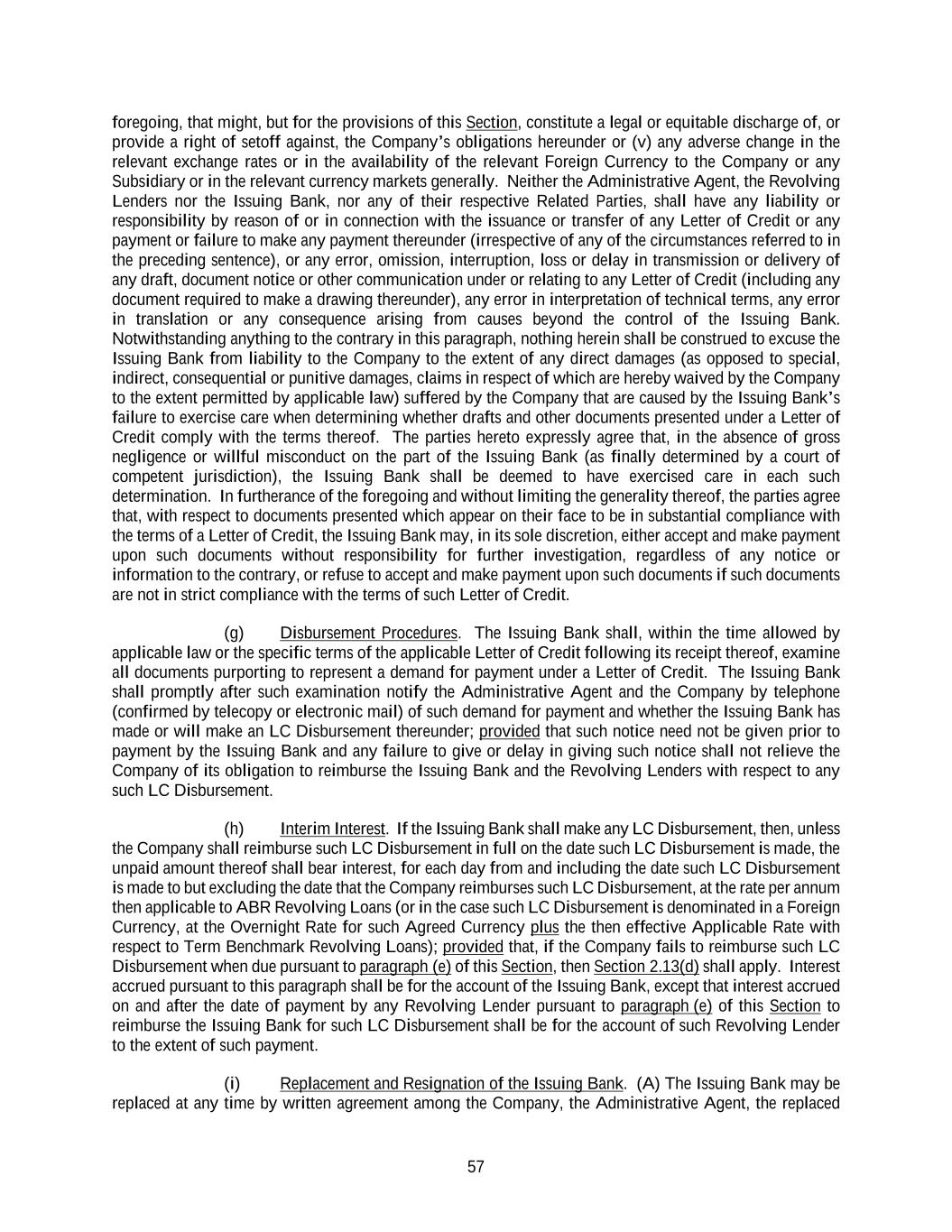 57 foregoing, that might, but for the provisions of this Section, constitute a legal or equitable discharge of, or provide a right of setoff against, the Company’s obligations hereunder or (v) any adverse change in the relevant exchange rates or in the availability of the relevant Foreign Currency to the Company or any Subsidiary or in the relevant currency markets generally. Neither the Administrative Agent, the Revolving Lenders nor the Issuing Bank, nor any of their respective Related Parties, shall have any liability or responsibility by reason of or in connection with the issuance or transfer of any Letter of Credit or any payment or failure to make any payment thereunder (irrespective of any of the circumstances referred to in the preceding sentence), or any error, omission, interruption, loss or delay in transmission or delivery of any draft, document notice or other communication under or relating to any Letter of Credit (including any document required to make a drawing thereunder), any error in interpretation of technical terms, any error in translation or any consequence arising from causes beyond the control of the Issuing Bank. Notwithstanding anything to the contrary in this paragraph, nothing herein shall be construed to excuse the Issuing Bank from liability to the Company to the extent of any direct damages (as opposed to special, indirect, consequential or punitive damages, claims in respect of which are hereby waived by the Company to the extent permitted by applicable law) suffered by the Company that are caused by the Issuing Bank’s failure to exercise care when determining whether drafts and other documents presented under a Letter of Credit comply with the terms thereof. The parties hereto expressly agree that, in the absence of gross negligence or willful misconduct on the part of the Issuing Bank (as finally determined by a court of competent jurisdiction), the Issuing Bank shall be deemed to have exercised care in each such determination. In furtherance of the foregoing and without limiting the generality thereof, the parties agree that, with respect to documents presented which appear on their face to be in substantial compliance with the terms of a Letter of Credit, the Issuing Bank may, in its sole discretion, either accept and make payment upon such documents without responsibility for further investigation, regardless of any notice or information to the contrary, or refuse to accept and make payment upon such documents if such documents are not in strict compliance with the terms of such Letter of Credit. (g) Disbursement Procedures. The Issuing Bank shall, within the time allowed by applicable law or the specific terms of the applicable Letter of Credit following its receipt thereof, examine all documents purporting to represent a demand for payment under a Letter of Credit. The Issuing Bank shall promptly after such examination notify the Administrative Agent and the Company by telephone (confirmed by telecopy or electronic mail) of such demand for payment and whether the Issuing Bank has made or will make an LC Disbursement thereunder; provided that such notice need not be given prior to payment by the Issuing Bank and any failure to give or delay in giving such notice shall not relieve the Company of its obligation to reimburse the Issuing Bank and the Revolving Lenders with respect to any such LC Disbursement. (h) Interim Interest. If the Issuing Bank shall make any LC Disbursement, then, unless the Company shall reimburse such LC Disbursement in full on the date such LC Disbursement is made, the unpaid amount thereof shall bear interest, for each day from and including the date such LC Disbursement is made to but excluding the date that the Company reimburses such LC Disbursement, at the rate per annum then applicable to ABR Revolving Loans (or in the case such LC Disbursement is denominated in a Foreign Currency, at the Overnight Rate for such Agreed Currency plus the then effective Applicable Rate with respect to Term Benchmark Revolving Loans); provided that, if the Company fails to reimburse such LC Disbursement when due pursuant to paragraph (e) of this Section, then Section 2.13(d) shall apply. Interest accrued pursuant to this paragraph shall be for the account of the Issuing Bank, except that interest accrued on and after the date of payment by any Revolving Lender pursuant to paragraph (e) of this Section to reimburse the Issuing Bank for such LC Disbursement shall be for the account of such Revolving Lender to the extent of such payment. (i) Replacement and Resignation of the Issuing Bank. (A) The Issuing Bank may be replaced at any time by written agreement among the Company, the Administrative Agent, the replaced