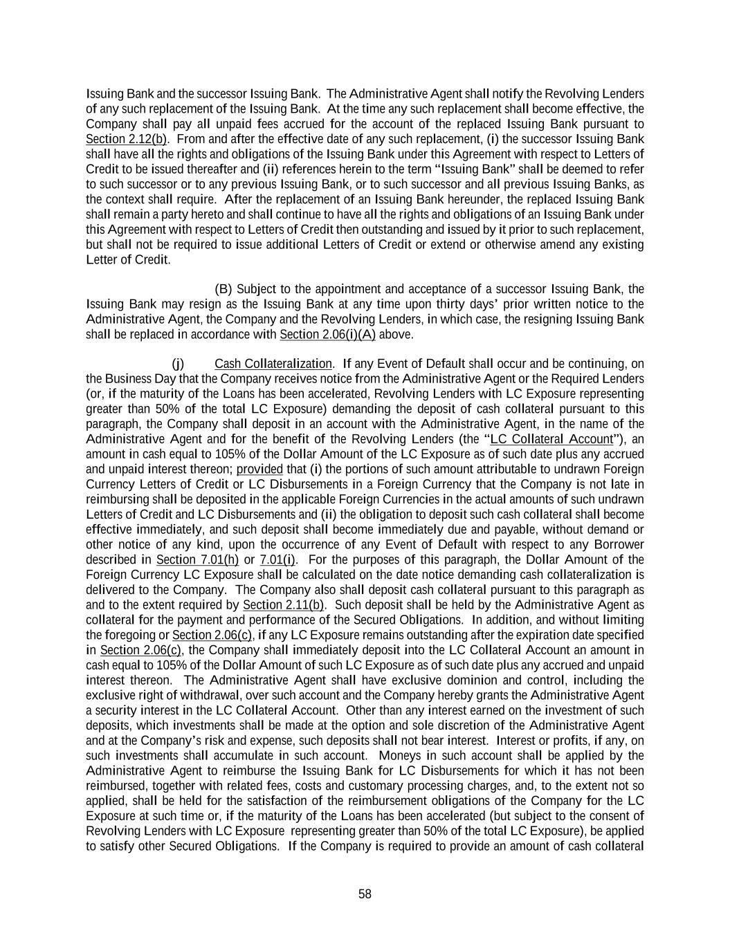 58 Issuing Bank and the successor Issuing Bank. The Administrative Agent shall notify the Revolving Lenders of any such replacement of the Issuing Bank. At the time any such replacement shall become effective, the Company shall pay all unpaid fees accrued for the account of the replaced Issuing Bank pursuant to Section 2.12(b). From and after the effective date of any such replacement, (i) the successor Issuing Bank shall have all the rights and obligations of the Issuing Bank under this Agreement with respect to Letters of Credit to be issued thereafter and (ii) references herein to the term “Issuing Bank” shall be deemed to refer to such successor or to any previous Issuing Bank, or to such successor and all previous Issuing Banks, as the context shall require. After the replacement of an Issuing Bank hereunder, the replaced Issuing Bank shall remain a party hereto and shall continue to have all the rights and obligations of an Issuing Bank under this Agreement with respect to Letters of Credit then outstanding and issued by it prior to such replacement, but shall not be required to issue additional Letters of Credit or extend or otherwise amend any existing Letter of Credit. (B) Subject to the appointment and acceptance of a successor Issuing Bank, the Issuing Bank may resign as the Issuing Bank at any time upon thirty days’ prior written notice to the Administrative Agent, the Company and the Revolving Lenders, in which case, the resigning Issuing Bank shall be replaced in accordance with Section 2.06(i)(A) above. (j) Cash Collateralization. If any Event of Default shall occur and be continuing, on the Business Day that the Company receives notice from the Administrative Agent or the Required Lenders (or, if the maturity of the Loans has been accelerated, Revolving Lenders with LC Exposure representing greater than 50% of the total LC Exposure) demanding the deposit of cash collateral pursuant to this paragraph, the Company shall deposit in an account with the Administrative Agent, in the name of the Administrative Agent and for the benefit of the Revolving Lenders (the “LC Collateral Account”), an amount in cash equal to 105% of the Dollar Amount of the LC Exposure as of such date plus any accrued and unpaid interest thereon; provided that (i) the portions of such amount attributable to undrawn Foreign Currency Letters of Credit or LC Disbursements in a Foreign Currency that the Company is not late in reimbursing shall be deposited in the applicable Foreign Currencies in the actual amounts of such undrawn Letters of Credit and LC Disbursements and (ii) the obligation to deposit such cash collateral shall become effective immediately, and such deposit shall become immediately due and payable, without demand or other notice of any kind, upon the occurrence of any Event of Default with respect to any Borrower described in Section 7.01(h) or 7.01(i). For the purposes of this paragraph, the Dollar Amount of the Foreign Currency LC Exposure shall be calculated on the date notice demanding cash collateralization is delivered to the Company. The Company also shall deposit cash collateral pursuant to this paragraph as and to the extent required by Section 2.11(b). Such deposit shall be held by the Administrative Agent as collateral for the payment and performance of the Secured Obligations. In addition, and without limiting the foregoing or Section 2.06(c), if any LC Exposure remains outstanding after the expiration date specified in Section 2.06(c), the Company shall immediately deposit into the LC Collateral Account an amount in cash equal to 105% of the Dollar Amount of such LC Exposure as of such date plus any accrued and unpaid interest thereon. The Administrative Agent shall have exclusive dominion and control, including the exclusive right of withdrawal, over such account and the Company hereby grants the Administrative Agent a security interest in the LC Collateral Account. Other than any interest earned on the investment of such deposits, which investments shall be made at the option and sole discretion of the Administrative Agent and at the Company’s risk and expense, such deposits shall not bear interest. Interest or profits, if any, on such investments shall accumulate in such account. Moneys in such account shall be applied by the Administrative Agent to reimburse the Issuing Bank for LC Disbursements for which it has not been reimbursed, together with related fees, costs and customary processing charges, and, to the extent not so applied, shall be held for the satisfaction of the reimbursement obligations of the Company for the LC Exposure at such time or, if the maturity of the Loans has been accelerated (but subject to the consent of Revolving Lenders with LC Exposure representing greater than 50% of the total LC Exposure), be applied to satisfy other Secured Obligations. If the Company is required to provide an amount of cash collateral