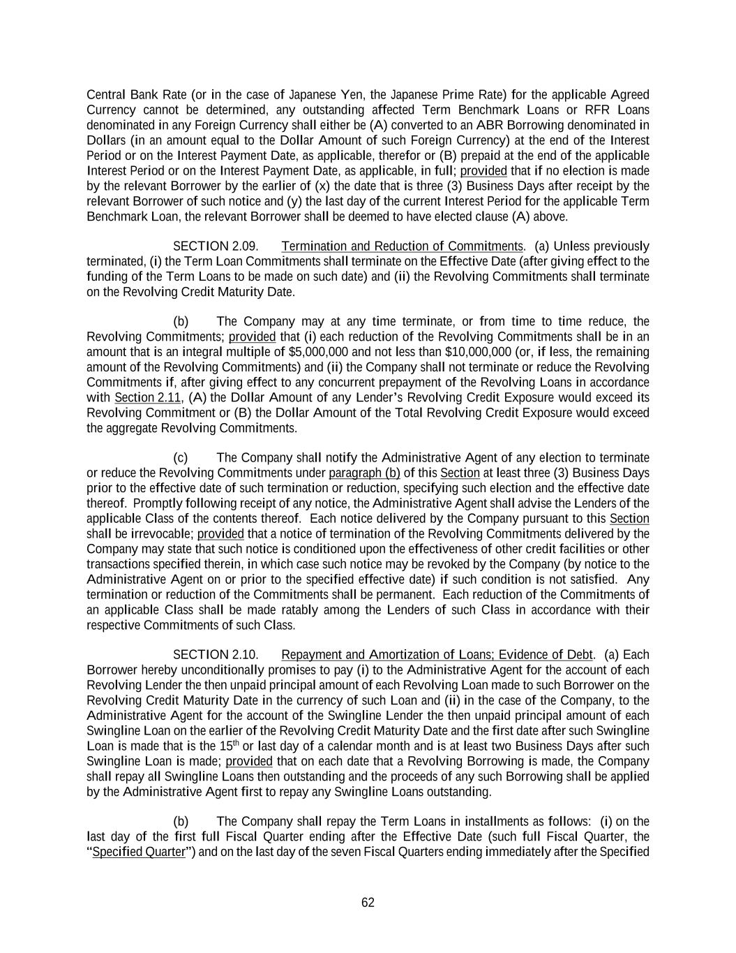 62 Central Bank Rate (or in the case of Japanese Yen, the Japanese Prime Rate) for the applicable Agreed Currency cannot be determined, any outstanding affected Term Benchmark Loans or RFR Loans denominated in any Foreign Currency shall either be (A) converted to an ABR Borrowing denominated in Dollars (in an amount equal to the Dollar Amount of such Foreign Currency) at the end of the Interest Period or on the Interest Payment Date, as applicable, therefor or (B) prepaid at the end of the applicable Interest Period or on the Interest Payment Date, as applicable, in full; provided that if no election is made by the relevant Borrower by the earlier of (x) the date that is three (3) Business Days after receipt by the relevant Borrower of such notice and (y) the last day of the current Interest Period for the applicable Term Benchmark Loan, the relevant Borrower shall be deemed to have elected clause (A) above. SECTION 2.09. Termination and Reduction of Commitments. (a) Unless previously terminated, (i) the Term Loan Commitments shall terminate on the Effective Date (after giving effect to the funding of the Term Loans to be made on such date) and (ii) the Revolving Commitments shall terminate on the Revolving Credit Maturity Date. (b) The Company may at any time terminate, or from time to time reduce, the Revolving Commitments; provided that (i) each reduction of the Revolving Commitments shall be in an amount that is an integral multiple of $5,000,000 and not less than $10,000,000 (or, if less, the remaining amount of the Revolving Commitments) and (ii) the Company shall not terminate or reduce the Revolving Commitments if, after giving effect to any concurrent prepayment of the Revolving Loans in accordance with Section 2.11, (A) the Dollar Amount of any Lender’s Revolving Credit Exposure would exceed its Revolving Commitment or (B) the Dollar Amount of the Total Revolving Credit Exposure would exceed the aggregate Revolving Commitments. (c) The Company shall notify the Administrative Agent of any election to terminate or reduce the Revolving Commitments under paragraph (b) of this Section at least three (3) Business Days prior to the effective date of such termination or reduction, specifying such election and the effective date thereof. Promptly following receipt of any notice, the Administrative Agent shall advise the Lenders of the applicable Class of the contents thereof. Each notice delivered by the Company pursuant to this Section shall be irrevocable; provided that a notice of termination of the Revolving Commitments delivered by the Company may state that such notice is conditioned upon the effectiveness of other credit facilities or other transactions specified therein, in which case such notice may be revoked by the Company (by notice to the Administrative Agent on or prior to the specified effective date) if such condition is not satisfied. Any termination or reduction of the Commitments shall be permanent. Each reduction of the Commitments of an applicable Class shall be made ratably among the Lenders of such Class in accordance with their respective Commitments of such Class. SECTION 2.10. Repayment and Amortization of Loans; Evidence of Debt. (a) Each Borrower hereby unconditionally promises to pay (i) to the Administrative Agent for the account of each Revolving Lender the then unpaid principal amount of each Revolving Loan made to such Borrower on the Revolving Credit Maturity Date in the currency of such Loan and (ii) in the case of the Company, to the Administrative Agent for the account of the Swingline Lender the then unpaid principal amount of each Swingline Loan on the earlier of the Revolving Credit Maturity Date and the first date after such Swingline Loan is made that is the 15th or last day of a calendar month and is at least two Business Days after such Swingline Loan is made; provided that on each date that a Revolving Borrowing is made, the Company shall repay all Swingline Loans then outstanding and the proceeds of any such Borrowing shall be applied by the Administrative Agent first to repay any Swingline Loans outstanding. (b) The Company shall repay the Term Loans in installments as follows: (i) on the last day of the first full Fiscal Quarter ending after the Effective Date (such full Fiscal Quarter, the “Specified Quarter”) and on the last day of the seven Fiscal Quarters ending immediately after the Specified