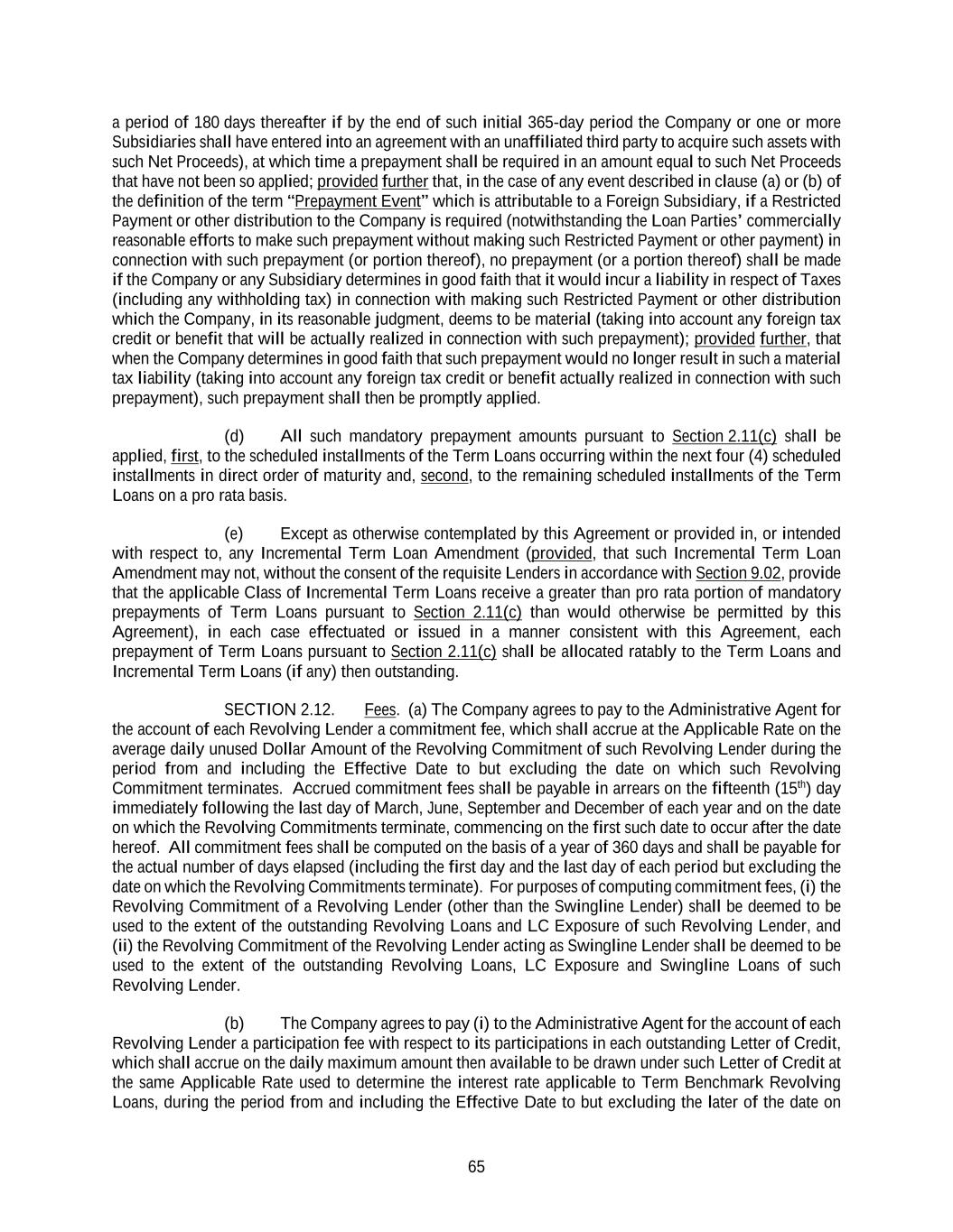 65 a period of 180 days thereafter if by the end of such initial 365-day period the Company or one or more Subsidiaries shall have entered into an agreement with an unaffiliated third party to acquire such assets with such Net Proceeds), at which time a prepayment shall be required in an amount equal to such Net Proceeds that have not been so applied; provided further that, in the case of any event described in clause (a) or (b) of the definition of the term “Prepayment Event” which is attributable to a Foreign Subsidiary, if a Restricted Payment or other distribution to the Company is required (notwithstanding the Loan Parties’ commercially reasonable efforts to make such prepayment without making such Restricted Payment or other payment) in connection with such prepayment (or portion thereof), no prepayment (or a portion thereof) shall be made if the Company or any Subsidiary determines in good faith that it would incur a liability in respect of Taxes (including any withholding tax) in connection with making such Restricted Payment or other distribution which the Company, in its reasonable judgment, deems to be material (taking into account any foreign tax credit or benefit that will be actually realized in connection with such prepayment); provided further, that when the Company determines in good faith that such prepayment would no longer result in such a material tax liability (taking into account any foreign tax credit or benefit actually realized in connection with such prepayment), such prepayment shall then be promptly applied. (d) All such mandatory prepayment amounts pursuant to Section 2.11(c) shall be applied, first, to the scheduled installments of the Term Loans occurring within the next four (4) scheduled installments in direct order of maturity and, second, to the remaining scheduled installments of the Term Loans on a pro rata basis. (e) Except as otherwise contemplated by this Agreement or provided in, or intended with respect to, any Incremental Term Loan Amendment (provided, that such Incremental Term Loan Amendment may not, without the consent of the requisite Lenders in accordance with Section 9.02, provide that the applicable Class of Incremental Term Loans receive a greater than pro rata portion of mandatory prepayments of Term Loans pursuant to Section 2.11(c) than would otherwise be permitted by this Agreement), in each case effectuated or issued in a manner consistent with this Agreement, each prepayment of Term Loans pursuant to Section 2.11(c) shall be allocated ratably to the Term Loans and Incremental Term Loans (if any) then outstanding. SECTION 2.12. Fees. (a) The Company agrees to pay to the Administrative Agent for the account of each Revolving Lender a commitment fee, which shall accrue at the Applicable Rate on the average daily unused Dollar Amount of the Revolving Commitment of such Revolving Lender during the period from and including the Effective Date to but excluding the date on which such Revolving Commitment terminates. Accrued commitment fees shall be payable in arrears on the fifteenth (15th) day immediately following the last day of March, June, September and December of each year and on the date on which the Revolving Commitments terminate, commencing on the first such date to occur after the date hereof. All commitment fees shall be computed on the basis of a year of 360 days and shall be payable for the actual number of days elapsed (including the first day and the last day of each period but excluding the date on which the Revolving Commitments terminate). For purposes of computing commitment fees, (i) the Revolving Commitment of a Revolving Lender (other than the Swingline Lender) shall be deemed to be used to the extent of the outstanding Revolving Loans and LC Exposure of such Revolving Lender, and (ii) the Revolving Commitment of the Revolving Lender acting as Swingline Lender shall be deemed to be used to the extent of the outstanding Revolving Loans, LC Exposure and Swingline Loans of such Revolving Lender. (b) The Company agrees to pay (i) to the Administrative Agent for the account of each Revolving Lender a participation fee with respect to its participations in each outstanding Letter of Credit, which shall accrue on the daily maximum amount then available to be drawn under such Letter of Credit at the same Applicable Rate used to determine the interest rate applicable to Term Benchmark Revolving Loans, during the period from and including the Effective Date to but excluding the later of the date on