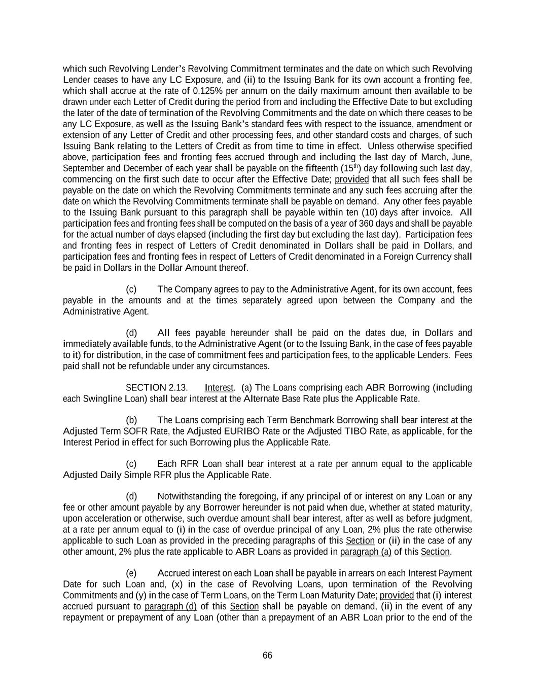 66 which such Revolving Lender’s Revolving Commitment terminates and the date on which such Revolving Lender ceases to have any LC Exposure, and (ii) to the Issuing Bank for its own account a fronting fee, which shall accrue at the rate of 0.125% per annum on the daily maximum amount then available to be drawn under each Letter of Credit during the period from and including the Effective Date to but excluding the later of the date of termination of the Revolving Commitments and the date on which there ceases to be any LC Exposure, as well as the Issuing Bank’s standard fees with respect to the issuance, amendment or extension of any Letter of Credit and other processing fees, and other standard costs and charges, of such Issuing Bank relating to the Letters of Credit as from time to time in effect. Unless otherwise specified above, participation fees and fronting fees accrued through and including the last day of March, June, September and December of each year shall be payable on the fifteenth (15th) day following such last day, commencing on the first such date to occur after the Effective Date; provided that all such fees shall be payable on the date on which the Revolving Commitments terminate and any such fees accruing after the date on which the Revolving Commitments terminate shall be payable on demand. Any other fees payable to the Issuing Bank pursuant to this paragraph shall be payable within ten (10) days after invoice. All participation fees and fronting fees shall be computed on the basis of a year of 360 days and shall be payable for the actual number of days elapsed (including the first day but excluding the last day). Participation fees and fronting fees in respect of Letters of Credit denominated in Dollars shall be paid in Dollars, and participation fees and fronting fees in respect of Letters of Credit denominated in a Foreign Currency shall be paid in Dollars in the Dollar Amount thereof. (c) The Company agrees to pay to the Administrative Agent, for its own account, fees payable in the amounts and at the times separately agreed upon between the Company and the Administrative Agent. (d) All fees payable hereunder shall be paid on the dates due, in Dollars and immediately available funds, to the Administrative Agent (or to the Issuing Bank, in the case of fees payable to it) for distribution, in the case of commitment fees and participation fees, to the applicable Lenders. Fees paid shall not be refundable under any circumstances. SECTION 2.13. Interest. (a) The Loans comprising each ABR Borrowing (including each Swingline Loan) shall bear interest at the Alternate Base Rate plus the Applicable Rate. (b) The Loans comprising each Term Benchmark Borrowing shall bear interest at the Adjusted Term SOFR Rate, the Adjusted EURIBO Rate or the Adjusted TIBO Rate, as applicable, for the Interest Period in effect for such Borrowing plus the Applicable Rate. (c) Each RFR Loan shall bear interest at a rate per annum equal to the applicable Adjusted Daily Simple RFR plus the Applicable Rate. (d) Notwithstanding the foregoing, if any principal of or interest on any Loan or any fee or other amount payable by any Borrower hereunder is not paid when due, whether at stated maturity, upon acceleration or otherwise, such overdue amount shall bear interest, after as well as before judgment, at a rate per annum equal to (i) in the case of overdue principal of any Loan, 2% plus the rate otherwise applicable to such Loan as provided in the preceding paragraphs of this Section or (ii) in the case of any other amount, 2% plus the rate applicable to ABR Loans as provided in paragraph (a) of this Section. (e) Accrued interest on each Loan shall be payable in arrears on each Interest Payment Date for such Loan and, (x) in the case of Revolving Loans, upon termination of the Revolving Commitments and (y) in the case of Term Loans, on the Term Loan Maturity Date; provided that (i) interest accrued pursuant to paragraph (d) of this Section shall be payable on demand, (ii) in the event of any repayment or prepayment of any Loan (other than a prepayment of an ABR Loan prior to the end of the