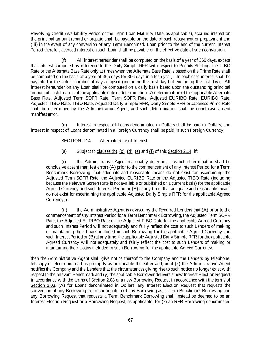 67 Revolving Credit Availability Period or the Term Loan Maturity Date, as applicable), accrued interest on the principal amount repaid or prepaid shall be payable on the date of such repayment or prepayment and (iii) in the event of any conversion of any Term Benchmark Loan prior to the end of the current Interest Period therefor, accrued interest on such Loan shall be payable on the effective date of such conversion. (f) All interest hereunder shall be computed on the basis of a year of 360 days, except that interest computed by reference to the Daily Simple RFR with respect to Pounds Sterling, the TIBO Rate or the Alternate Base Rate only at times when the Alternate Base Rate is based on the Prime Rate shall be computed on the basis of a year of 365 days (or 366 days in a leap year). In each case interest shall be payable for the actual number of days elapsed (including the first day but excluding the last day). All interest hereunder on any Loan shall be computed on a daily basis based upon the outstanding principal amount of such Loan as of the applicable date of determination. A determination of the applicable Alternate Base Rate, Adjusted Term SOFR Rate, Term SOFR Rate, Adjusted EURIBO Rate, EURIBO Rate, Adjusted TIBO Rate, TIBO Rate, Adjusted Daily Simple RFR, Daily Simple RFR or Japanese Prime Rate shall be determined by the Administrative Agent, and such determination shall be conclusive absent manifest error. (g) Interest in respect of Loans denominated in Dollars shall be paid in Dollars, and interest in respect of Loans denominated in a Foreign Currency shall be paid in such Foreign Currency. SECTION 2.14. Alternate Rate of Interest. (a) Subject to clauses (b), (c), (d), (e) and (f) of this Section 2.14, if: (i) the Administrative Agent reasonably determines (which determination shall be conclusive absent manifest error) (A) prior to the commencement of any Interest Period for a Term Benchmark Borrowing, that adequate and reasonable means do not exist for ascertaining the Adjusted Term SOFR Rate, the Adjusted EURIBO Rate or the Adjusted TIBO Rate (including because the Relevant Screen Rate is not available or published on a current basis) for the applicable Agreed Currency and such Interest Period or (B) at any time, that adequate and reasonable means do not exist for ascertaining the applicable Adjusted Daily Simple RFR for the applicable Agreed Currency; or (ii) the Administrative Agent is advised by the Required Lenders that (A) prior to the commencement of any Interest Period for a Term Benchmark Borrowing, the Adjusted Term SOFR Rate, the Adjusted EURIBO Rate or the Adjusted TIBO Rate for the applicable Agreed Currency and such Interest Period will not adequately and fairly reflect the cost to such Lenders of making or maintaining their Loans included in such Borrowing for the applicable Agreed Currency and such Interest Period or (B) at any time, the applicable Adjusted Daily Simple RFR for the applicable Agreed Currency will not adequately and fairly reflect the cost to such Lenders of making or maintaining their Loans included in such Borrowing for the applicable Agreed Currency; then the Administrative Agent shall give notice thereof to the Company and the Lenders by telephone, telecopy or electronic mail as promptly as practicable thereafter and, until (x) the Administrative Agent notifies the Company and the Lenders that the circumstances giving rise to such notice no longer exist with respect to the relevant Benchmark and (y) the applicable Borrower delivers a new Interest Election Request in accordance with the terms of Section 2.08 or a new Borrowing Request in accordance with the terms of Section 2.03, (A) for Loans denominated in Dollars, any Interest Election Request that requests the conversion of any Borrowing to, or continuation of any Borrowing as, a Term Benchmark Borrowing and any Borrowing Request that requests a Term Benchmark Borrowing shall instead be deemed to be an Interest Election Request or a Borrowing Request, as applicable, for (x) an RFR Borrowing denominated
