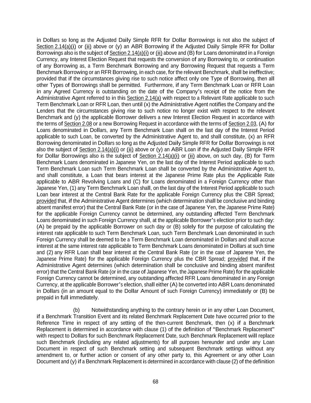 68 in Dollars so long as the Adjusted Daily Simple RFR for Dollar Borrowings is not also the subject of Section 2.14(a)(i) or (ii) above or (y) an ABR Borrowing if the Adjusted Daily Simple RFR for Dollar Borrowings also is the subject of Section 2.14(a)(i) or (ii) above and (B) for Loans denominated in a Foreign Currency, any Interest Election Request that requests the conversion of any Borrowing to, or continuation of any Borrowing as, a Term Benchmark Borrowing and any Borrowing Request that requests a Term Benchmark Borrowing or an RFR Borrowing, in each case, for the relevant Benchmark, shall be ineffective; provided that if the circumstances giving rise to such notice affect only one Type of Borrowing, then all other Types of Borrowings shall be permitted. Furthermore, if any Term Benchmark Loan or RFR Loan in any Agreed Currency is outstanding on the date of the Company’s receipt of the notice from the Administrative Agent referred to in this Section 2.14(a) with respect to a Relevant Rate applicable to such Term Benchmark Loan or RFR Loan, then until (x) the Administrative Agent notifies the Company and the Lenders that the circumstances giving rise to such notice no longer exist with respect to the relevant Benchmark and (y) the applicable Borrower delivers a new Interest Election Request in accordance with the terms of Section 2.08 or a new Borrowing Request in accordance with the terms of Section 2.03, (A) for Loans denominated in Dollars, any Term Benchmark Loan shall on the last day of the Interest Period applicable to such Loan, be converted by the Administrative Agent to, and shall constitute, (x) an RFR Borrowing denominated in Dollars so long as the Adjusted Daily Simple RFR for Dollar Borrowings is not also the subject of Section 2.14(a)(i) or (ii) above or (y) an ABR Loan if the Adjusted Daily Simple RFR for Dollar Borrowings also is the subject of Section 2.14(a)(i) or (ii) above, on such day, (B) for Term Benchmark Loans denominated in Japanese Yen, on the last day of the Interest Period applicable to such Term Benchmark Loan such Term Benchmark Loan shall be converted by the Administrative Agent to, and shall constitute, a Loan that bears interest at the Japanese Prime Rate plus the Applicable Rate applicable to ABR Revolving Loans and (C) for Loans denominated in a Foreign Currency other than Japanese Yen, (1) any Term Benchmark Loan shall, on the last day of the Interest Period applicable to such Loan bear interest at the Central Bank Rate for the applicable Foreign Currency plus the CBR Spread; provided that, if the Administrative Agent determines (which determination shall be conclusive and binding absent manifest error) that the Central Bank Rate (or in the case of Japanese Yen, the Japanese Prime Rate) for the applicable Foreign Currency cannot be determined, any outstanding affected Term Benchmark Loans denominated in such Foreign Currency shall, at the applicable Borrower’s election prior to such day: (A) be prepaid by the applicable Borrower on such day or (B) solely for the purpose of calculating the interest rate applicable to such Term Benchmark Loan, such Term Benchmark Loan denominated in such Foreign Currency shall be deemed to be a Term Benchmark Loan denominated in Dollars and shall accrue interest at the same interest rate applicable to Term Benchmark Loans denominated in Dollars at such time and (2) any RFR Loan shall bear interest at the Central Bank Rate (or in the case of Japanese Yen, the Japanese Prime Rate) for the applicable Foreign Currency plus the CBR Spread; provided that, if the Administrative Agent determines (which determination shall be conclusive and binding absent manifest error) that the Central Bank Rate (or in the case of Japanese Yen, the Japanese Prime Rate) for the applicable Foreign Currency cannot be determined, any outstanding affected RFR Loans denominated in any Foreign Currency, at the applicable Borrower’s election, shall either (A) be converted into ABR Loans denominated in Dollars (in an amount equal to the Dollar Amount of such Foreign Currency) immediately or (B) be prepaid in full immediately. (b) Notwithstanding anything to the contrary herein or in any other Loan Document, if a Benchmark Transition Event and its related Benchmark Replacement Date have occurred prior to the Reference Time in respect of any setting of the then-current Benchmark, then (x) if a Benchmark Replacement is determined in accordance with clause (1) of the definition of “Benchmark Replacement” with respect to Dollars for such Benchmark Replacement Date, such Benchmark Replacement will replace such Benchmark (including any related adjustments) for all purposes hereunder and under any Loan Document in respect of such Benchmark setting and subsequent Benchmark settings without any amendment to, or further action or consent of any other party to, this Agreement or any other Loan Document and (y) if a Benchmark Replacement is determined in accordance with clause (2) of the definition
