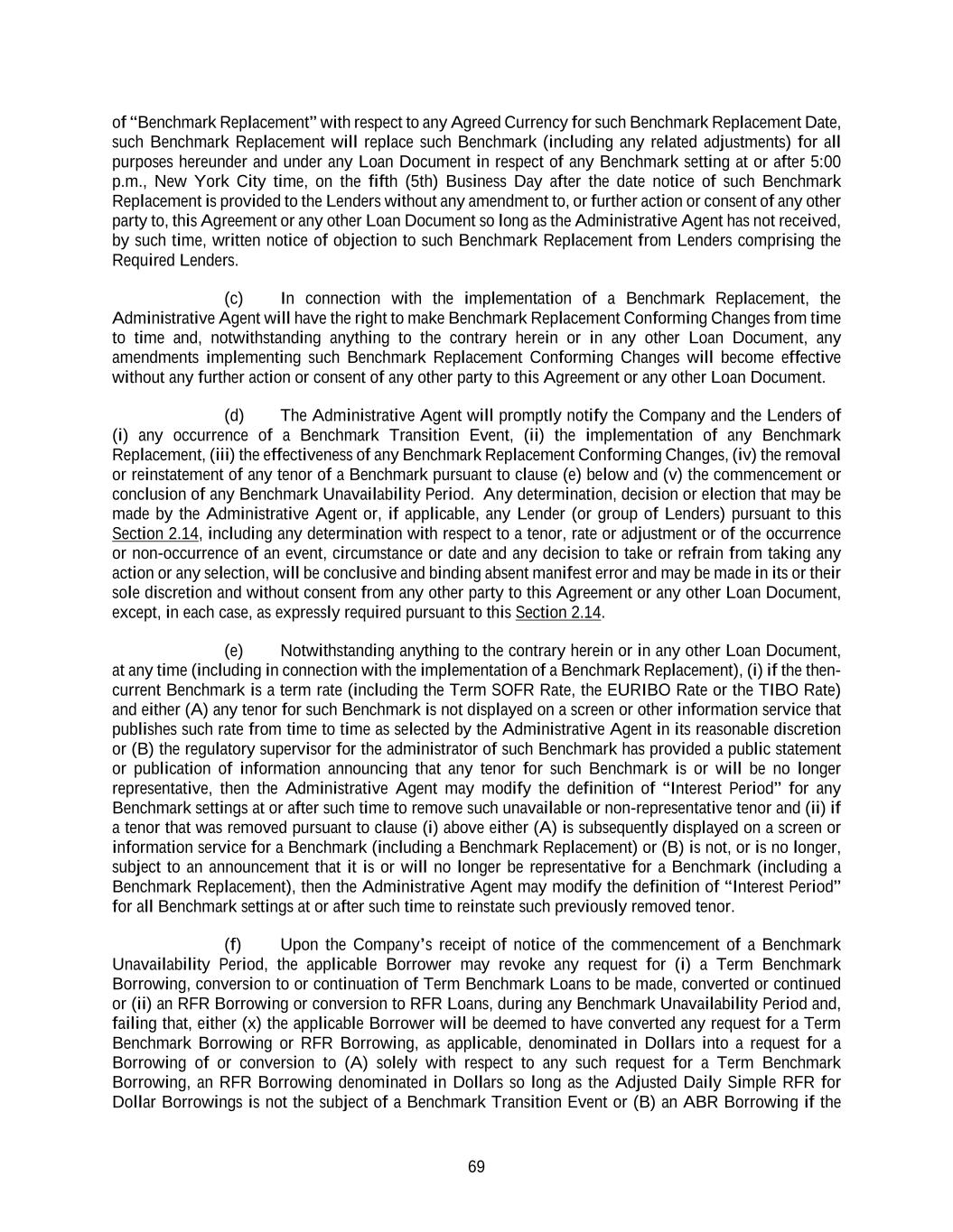 69 of “Benchmark Replacement” with respect to any Agreed Currency for such Benchmark Replacement Date, such Benchmark Replacement will replace such Benchmark (including any related adjustments) for all purposes hereunder and under any Loan Document in respect of any Benchmark setting at or after 5:00 p.m., New York City time, on the fifth (5th) Business Day after the date notice of such Benchmark Replacement is provided to the Lenders without any amendment to, or further action or consent of any other party to, this Agreement or any other Loan Document so long as the Administrative Agent has not received, by such time, written notice of objection to such Benchmark Replacement from Lenders comprising the Required Lenders. (c) In connection with the implementation of a Benchmark Replacement, the Administrative Agent will have the right to make Benchmark Replacement Conforming Changes from time to time and, notwithstanding anything to the contrary herein or in any other Loan Document, any amendments implementing such Benchmark Replacement Conforming Changes will become effective without any further action or consent of any other party to this Agreement or any other Loan Document. (d) The Administrative Agent will promptly notify the Company and the Lenders of (i) any occurrence of a Benchmark Transition Event, (ii) the implementation of any Benchmark Replacement, (iii) the effectiveness of any Benchmark Replacement Conforming Changes, (iv) the removal or reinstatement of any tenor of a Benchmark pursuant to clause (e) below and (v) the commencement or conclusion of any Benchmark Unavailability Period. Any determination, decision or election that may be made by the Administrative Agent or, if applicable, any Lender (or group of Lenders) pursuant to this Section 2.14, including any determination with respect to a tenor, rate or adjustment or of the occurrence or non-occurrence of an event, circumstance or date and any decision to take or refrain from taking any action or any selection, will be conclusive and binding absent manifest error and may be made in its or their sole discretion and without consent from any other party to this Agreement or any other Loan Document, except, in each case, as expressly required pursuant to this Section 2.14. (e) Notwithstanding anything to the contrary herein or in any other Loan Document, at any time (including in connection with the implementation of a Benchmark Replacement), (i) if the then- current Benchmark is a term rate (including the Term SOFR Rate, the EURIBO Rate or the TIBO Rate) and either (A) any tenor for such Benchmark is not displayed on a screen or other information service that publishes such rate from time to time as selected by the Administrative Agent in its reasonable discretion or (B) the regulatory supervisor for the administrator of such Benchmark has provided a public statement or publication of information announcing that any tenor for such Benchmark is or will be no longer representative, then the Administrative Agent may modify the definition of “Interest Period” for any Benchmark settings at or after such time to remove such unavailable or non-representative tenor and (ii) if a tenor that was removed pursuant to clause (i) above either (A) is subsequently displayed on a screen or information service for a Benchmark (including a Benchmark Replacement) or (B) is not, or is no longer, subject to an announcement that it is or will no longer be representative for a Benchmark (including a Benchmark Replacement), then the Administrative Agent may modify the definition of “Interest Period” for all Benchmark settings at or after such time to reinstate such previously removed tenor. (f) Upon the Company’s receipt of notice of the commencement of a Benchmark Unavailability Period, the applicable Borrower may revoke any request for (i) a Term Benchmark Borrowing, conversion to or continuation of Term Benchmark Loans to be made, converted or continued or (ii) an RFR Borrowing or conversion to RFR Loans, during any Benchmark Unavailability Period and, failing that, either (x) the applicable Borrower will be deemed to have converted any request for a Term Benchmark Borrowing or RFR Borrowing, as applicable, denominated in Dollars into a request for a Borrowing of or conversion to (A) solely with respect to any such request for a Term Benchmark Borrowing, an RFR Borrowing denominated in Dollars so long as the Adjusted Daily Simple RFR for Dollar Borrowings is not the subject of a Benchmark Transition Event or (B) an ABR Borrowing if the
