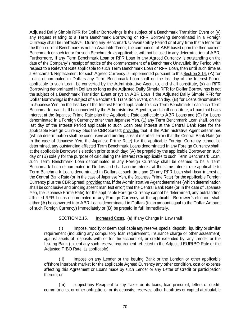 70 Adjusted Daily Simple RFR for Dollar Borrowings is the subject of a Benchmark Transition Event or (y) any request relating to a Term Benchmark Borrowing or RFR Borrowing denominated in a Foreign Currency shall be ineffective. During any Benchmark Unavailability Period or at any time that a tenor for the then-current Benchmark is not an Available Tenor, the component of ABR based upon the then-current Benchmark or such tenor for such Benchmark, as applicable, will not be used in any determination of ABR. Furthermore, if any Term Benchmark Loan or RFR Loan in any Agreed Currency is outstanding on the date of the Company’s receipt of notice of the commencement of a Benchmark Unavailability Period with respect to a Relevant Rate applicable to such Term Benchmark Loan or RFR Loan, then until such time as a Benchmark Replacement for such Agreed Currency is implemented pursuant to this Section 2.14, (A) for Loans denominated in Dollars any Term Benchmark Loan shall on the last day of the Interest Period applicable to such Loan, be converted by the Administrative Agent to, and shall constitute, (x) an RFR Borrowing denominated in Dollars so long as the Adjusted Daily Simple RFR for Dollar Borrowings is not the subject of a Benchmark Transition Event or (y) an ABR Loan if the Adjusted Daily Simple RFR for Dollar Borrowings is the subject of a Benchmark Transition Event, on such day, (B) for Loans denominated in Japanese Yen, on the last day of the Interest Period applicable to such Term Benchmark Loan such Term Benchmark Loan shall be converted by the Administrative Agent to, and shall constitute, a Loan that bears interest at the Japanese Prime Rate plus the Applicable Rate applicable to ABR Loans and (C) for Loans denominated in a Foreign Currency other than Japanese Yen, (1) any Term Benchmark Loan shall, on the last day of the Interest Period applicable to such Loan bear interest at the Central Bank Rate for the applicable Foreign Currency plus the CBR Spread; provided that, if the Administrative Agent determines (which determination shall be conclusive and binding absent manifest error) that the Central Bank Rate (or in the case of Japanese Yen, the Japanese Prime Rate) for the applicable Foreign Currency cannot be determined, any outstanding affected Term Benchmark Loans denominated in any Foreign Currency shall, at the applicable Borrower’s election prior to such day: (A) be prepaid by the applicable Borrower on such day or (B) solely for the purpose of calculating the interest rate applicable to such Term Benchmark Loan, such Term Benchmark Loan denominated in any Foreign Currency shall be deemed to be a Term Benchmark Loan denominated in Dollars and shall accrue interest at the same interest rate applicable to Term Benchmark Loans denominated in Dollars at such time and (2) any RFR Loan shall bear interest at the Central Bank Rate (or in the case of Japanese Yen, the Japanese Prime Rate) for the applicable Foreign Currency plus the CBR Spread; provided that, if the Administrative Agent determines (which determination shall be conclusive and binding absent manifest error) that the Central Bank Rate (or in the case of Japanese Yen, the Japanese Prime Rate) for the applicable Foreign Currency cannot be determined, any outstanding affected RFR Loans denominated in any Foreign Currency, at the applicable Borrower’s election, shall either (A) be converted into ABR Loans denominated in Dollars (in an amount equal to the Dollar Amount of such Foreign Currency) immediately or (B) be prepaid in full immediately. SECTION 2.15. Increased Costs. (a) If any Change in Law shall: (i) impose, modify or deem applicable any reserve, special deposit, liquidity or similar requirement (including any compulsory loan requirement, insurance charge or other assessment) against assets of, deposits with or for the account of, or credit extended by, any Lender or the Issuing Bank (except any such reserve requirement reflected in the Adjusted EURIBO Rate or the Adjusted TIBO Rate, as applicable); (ii) impose on any Lender or the Issuing Bank or the London or other applicable offshore interbank market for the applicable Agreed Currency any other condition, cost or expense affecting this Agreement or Loans made by such Lender or any Letter of Credit or participation therein; or (iii) subject any Recipient to any Taxes on its loans, loan principal, letters of credit, commitments, or other obligations, or its deposits, reserves, other liabilities or capital attributable