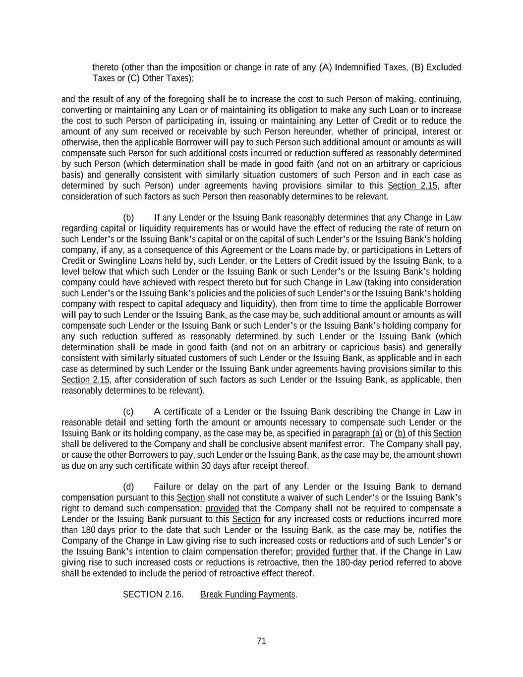 71 thereto (other than the imposition or change in rate of any (A) Indemnified Taxes, (B) Excluded Taxes or (C) Other Taxes); and the result of any of the foregoing shall be to increase the cost to such Person of making, continuing, converting or maintaining any Loan or of maintaining its obligation to make any such Loan or to increase the cost to such Person of participating in, issuing or maintaining any Letter of Credit or to reduce the amount of any sum received or receivable by such Person hereunder, whether of principal, interest or otherwise, then the applicable Borrower will pay to such Person such additional amount or amounts as will compensate such Person for such additional costs incurred or reduction suffered as reasonably determined by such Person (which determination shall be made in good faith (and not on an arbitrary or capricious basis) and generally consistent with similarly situation customers of such Person and in each case as determined by such Person) under agreements having provisions similar to this Section 2.15, after consideration of such factors as such Person then reasonably determines to be relevant. (b) If any Lender or the Issuing Bank reasonably determines that any Change in Law regarding capital or liquidity requirements has or would have the effect of reducing the rate of return on such Lender’s or the Issuing Bank’s capital or on the capital of such Lender’s or the Issuing Bank’s holding company, if any, as a consequence of this Agreement or the Loans made by, or participations in Letters of Credit or Swingline Loans held by, such Lender, or the Letters of Credit issued by the Issuing Bank, to a level below that which such Lender or the Issuing Bank or such Lender’s or the Issuing Bank’s holding company could have achieved with respect thereto but for such Change in Law (taking into consideration such Lender’s or the Issuing Bank’s policies and the policies of such Lender’s or the Issuing Bank’s holding company with respect to capital adequacy and liquidity), then from time to time the applicable Borrower will pay to such Lender or the Issuing Bank, as the case may be, such additional amount or amounts as will compensate such Lender or the Issuing Bank or such Lender’s or the Issuing Bank’s holding company for any such reduction suffered as reasonably determined by such Lender or the Issuing Bank (which determination shall be made in good faith (and not on an arbitrary or capricious basis) and generally consistent with similarly situated customers of such Lender or the Issuing Bank, as applicable and in each case as determined by such Lender or the Issuing Bank under agreements having provisions similar to this Section 2.15, after consideration of such factors as such Lender or the Issuing Bank, as applicable, then reasonably determines to be relevant). (c) A certificate of a Lender or the Issuing Bank describing the Change in Law in reasonable detail and setting forth the amount or amounts necessary to compensate such Lender or the Issuing Bank or its holding company, as the case may be, as specified in paragraph (a) or (b) of this Section shall be delivered to the Company and shall be conclusive absent manifest error. The Company shall pay, or cause the other Borrowers to pay, such Lender or the Issuing Bank, as the case may be, the amount shown as due on any such certificate within 30 days after receipt thereof. (d) Failure or delay on the part of any Lender or the Issuing Bank to demand compensation pursuant to this Section shall not constitute a waiver of such Lender’s or the Issuing Bank’s right to demand such compensation; provided that the Company shall not be required to compensate a Lender or the Issuing Bank pursuant to this Section for any increased costs or reductions incurred more than 180 days prior to the date that such Lender or the Issuing Bank, as the case may be, notifies the Company of the Change in Law giving rise to such increased costs or reductions and of such Lender’s or the Issuing Bank’s intention to claim compensation therefor; provided further that, if the Change in Law giving rise to such increased costs or reductions is retroactive, then the 180-day period referred to above shall be extended to include the period of retroactive effect thereof. SECTION 2.16. Break Funding Payments.