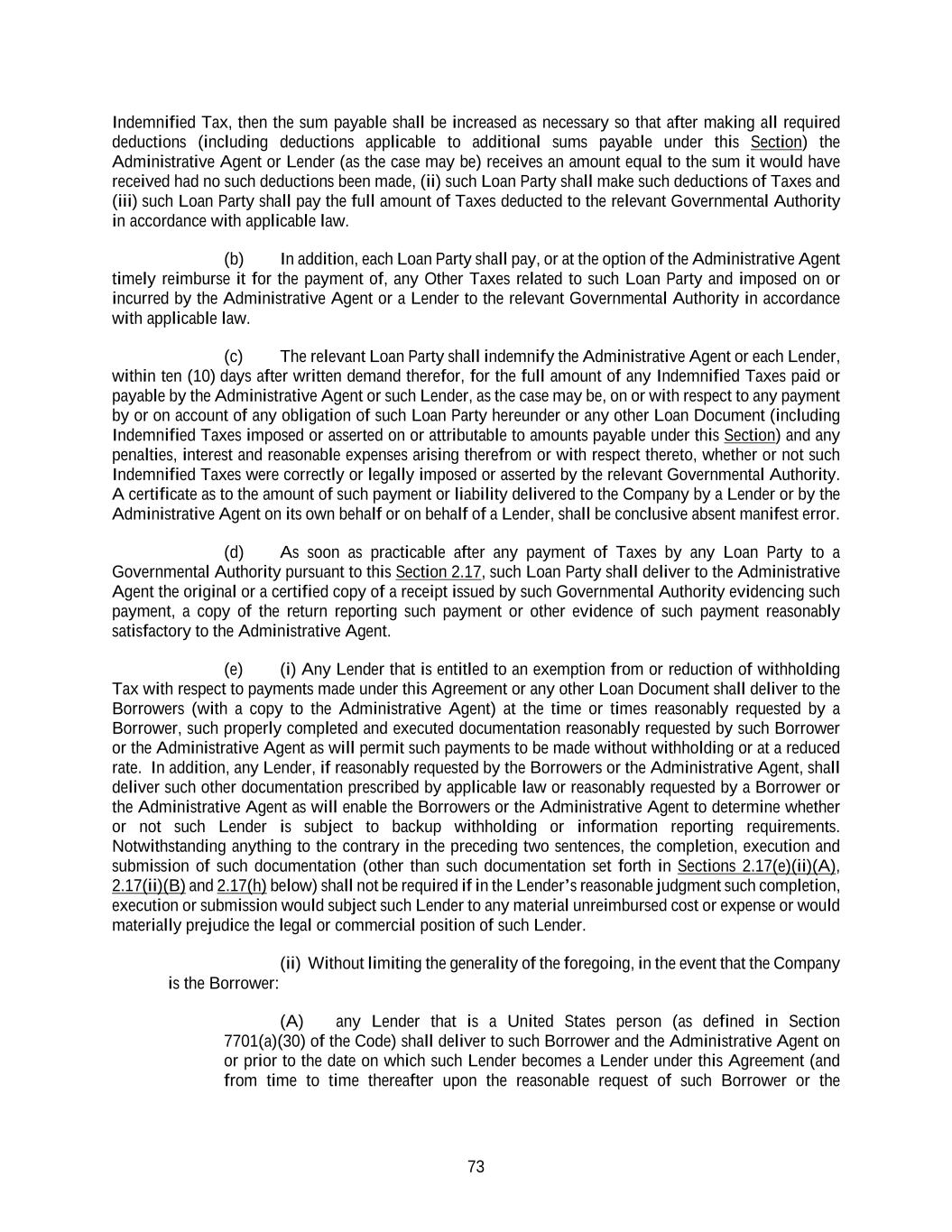 73 Indemnified Tax, then the sum payable shall be increased as necessary so that after making all required deductions (including deductions applicable to additional sums payable under this Section) the Administrative Agent or Lender (as the case may be) receives an amount equal to the sum it would have received had no such deductions been made, (ii) such Loan Party shall make such deductions of Taxes and (iii) such Loan Party shall pay the full amount of Taxes deducted to the relevant Governmental Authority in accordance with applicable law. (b) In addition, each Loan Party shall pay, or at the option of the Administrative Agent timely reimburse it for the payment of, any Other Taxes related to such Loan Party and imposed on or incurred by the Administrative Agent or a Lender to the relevant Governmental Authority in accordance with applicable law. (c) The relevant Loan Party shall indemnify the Administrative Agent or each Lender, within ten (10) days after written demand therefor, for the full amount of any Indemnified Taxes paid or payable by the Administrative Agent or such Lender, as the case may be, on or with respect to any payment by or on account of any obligation of such Loan Party hereunder or any other Loan Document (including Indemnified Taxes imposed or asserted on or attributable to amounts payable under this Section) and any penalties, interest and reasonable expenses arising therefrom or with respect thereto, whether or not such Indemnified Taxes were correctly or legally imposed or asserted by the relevant Governmental Authority. A certificate as to the amount of such payment or liability delivered to the Company by a Lender or by the Administrative Agent on its own behalf or on behalf of a Lender, shall be conclusive absent manifest error. (d) As soon as practicable after any payment of Taxes by any Loan Party to a Governmental Authority pursuant to this Section 2.17, such Loan Party shall deliver to the Administrative Agent the original or a certified copy of a receipt issued by such Governmental Authority evidencing such payment, a copy of the return reporting such payment or other evidence of such payment reasonably satisfactory to the Administrative Agent. (e) (i) Any Lender that is entitled to an exemption from or reduction of withholding Tax with respect to payments made under this Agreement or any other Loan Document shall deliver to the Borrowers (with a copy to the Administrative Agent) at the time or times reasonably requested by a Borrower, such properly completed and executed documentation reasonably requested by such Borrower or the Administrative Agent as will permit such payments to be made without withholding or at a reduced rate. In addition, any Lender, if reasonably requested by the Borrowers or the Administrative Agent, shall deliver such other documentation prescribed by applicable law or reasonably requested by a Borrower or the Administrative Agent as will enable the Borrowers or the Administrative Agent to determine whether or not such Lender is subject to backup withholding or information reporting requirements. Notwithstanding anything to the contrary in the preceding two sentences, the completion, execution and submission of such documentation (other than such documentation set forth in Sections 2.17(e)(ii)(A), 2.17(ii)(B) and 2.17(h) below) shall not be required if in the Lender’s reasonable judgment such completion, execution or submission would subject such Lender to any material unreimbursed cost or expense or would materially prejudice the legal or commercial position of such Lender. (ii) Without limiting the generality of the foregoing, in the event that the Company is the Borrower: (A) any Lender that is a United States person (as defined in Section 7701(a)(30) of the Code) shall deliver to such Borrower and the Administrative Agent on or prior to the date on which such Lender becomes a Lender under this Agreement (and from time to time thereafter upon the reasonable request of such Borrower or the