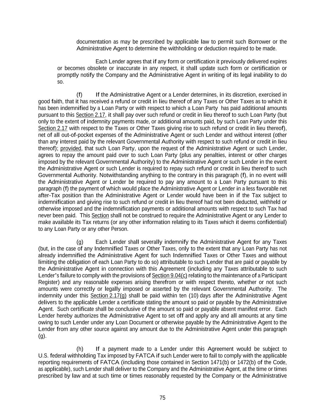 75 documentation as may be prescribed by applicable law to permit such Borrower or the Administrative Agent to determine the withholding or deduction required to be made. Each Lender agrees that if any form or certification it previously delivered expires or becomes obsolete or inaccurate in any respect, it shall update such form or certification or promptly notify the Company and the Administrative Agent in writing of its legal inability to do so. (f) If the Administrative Agent or a Lender determines, in its discretion, exercised in good faith, that it has received a refund or credit in lieu thereof of any Taxes or Other Taxes as to which it has been indemnified by a Loan Party or with respect to which a Loan Party has paid additional amounts pursuant to this Section 2.17, it shall pay over such refund or credit in lieu thereof to such Loan Party (but only to the extent of indemnity payments made, or additional amounts paid, by such Loan Party under this Section 2.17 with respect to the Taxes or Other Taxes giving rise to such refund or credit in lieu thereof), net of all out-of-pocket expenses of the Administrative Agent or such Lender and without interest (other than any interest paid by the relevant Governmental Authority with respect to such refund or credit in lieu thereof); provided, that such Loan Party, upon the request of the Administrative Agent or such Lender, agrees to repay the amount paid over to such Loan Party (plus any penalties, interest or other charges imposed by the relevant Governmental Authority) to the Administrative Agent or such Lender in the event the Administrative Agent or such Lender is required to repay such refund or credit in lieu thereof to such Governmental Authority. Notwithstanding anything to the contrary in this paragraph (f), in no event will the Administrative Agent or Lender be required to pay any amount to a Loan Party pursuant to this paragraph (f) the payment of which would place the Administrative Agent or Lender in a less favorable net after-Tax position than the Administrative Agent or Lender would have been in if the Tax subject to indemnification and giving rise to such refund or credit in lieu thereof had not been deducted, withheld or otherwise imposed and the indemnification payments or additional amounts with respect to such Tax had never been paid. This Section shall not be construed to require the Administrative Agent or any Lender to make available its Tax returns (or any other information relating to its Taxes which it deems confidential) to any Loan Party or any other Person. (g) Each Lender shall severally indemnify the Administrative Agent for any Taxes (but, in the case of any Indemnified Taxes or Other Taxes, only to the extent that any Loan Party has not already indemnified the Administrative Agent for such Indemnified Taxes or Other Taxes and without limiting the obligation of each Loan Party to do so) attributable to such Lender that are paid or payable by the Administrative Agent in connection with this Agreement (including any Taxes attributable to such Lender’s failure to comply with the provisions of Section 9.04(c) relating to the maintenance of a Participant Register) and any reasonable expenses arising therefrom or with respect thereto, whether or not such amounts were correctly or legally imposed or asserted by the relevant Governmental Authority. The indemnity under this Section 2.17(g) shall be paid within ten (10) days after the Administrative Agent delivers to the applicable Lender a certificate stating the amount so paid or payable by the Administrative Agent. Such certificate shall be conclusive of the amount so paid or payable absent manifest error. Each Lender hereby authorizes the Administrative Agent to set off and apply any and all amounts at any time owing to such Lender under any Loan Document or otherwise payable by the Administrative Agent to the Lender from any other source against any amount due to the Administrative Agent under this paragraph (g). (h) If a payment made to a Lender under this Agreement would be subject to U.S. federal withholding Tax imposed by FATCA if such Lender were to fail to comply with the applicable reporting requirements of FATCA (including those contained in Section 1471(b) or 1472(b) of the Code, as applicable), such Lender shall deliver to the Company and the Administrative Agent, at the time or times prescribed by law and at such time or times reasonably requested by the Company or the Administrative