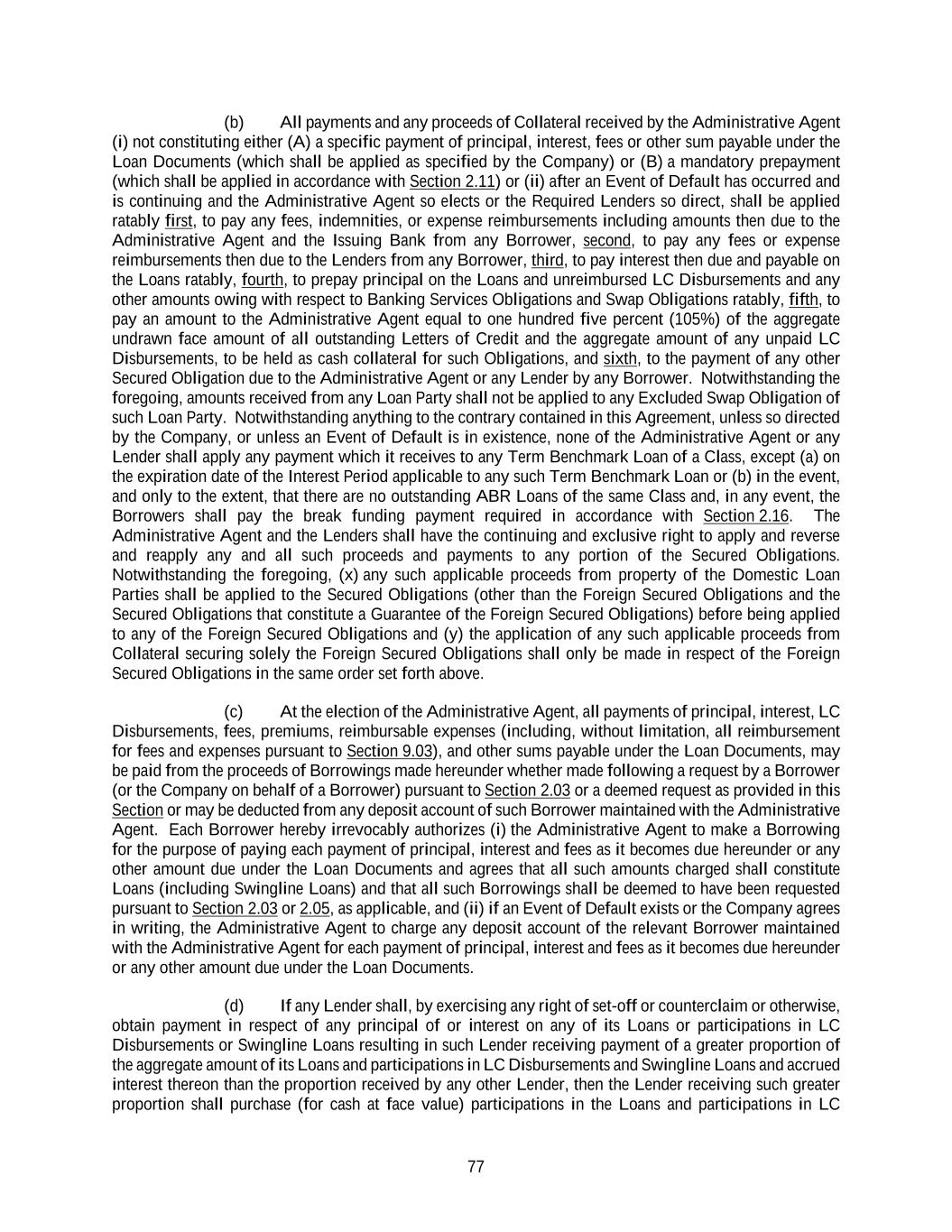 77 (b) All payments and any proceeds of Collateral received by the Administrative Agent (i) not constituting either (A) a specific payment of principal, interest, fees or other sum payable under the Loan Documents (which shall be applied as specified by the Company) or (B) a mandatory prepayment (which shall be applied in accordance with Section 2.11) or (ii) after an Event of Default has occurred and is continuing and the Administrative Agent so elects or the Required Lenders so direct, shall be applied ratably first, to pay any fees, indemnities, or expense reimbursements including amounts then due to the Administrative Agent and the Issuing Bank from any Borrower, second, to pay any fees or expense reimbursements then due to the Lenders from any Borrower, third, to pay interest then due and payable on the Loans ratably, fourth, to prepay principal on the Loans and unreimbursed LC Disbursements and any other amounts owing with respect to Banking Services Obligations and Swap Obligations ratably, fifth, to pay an amount to the Administrative Agent equal to one hundred five percent (105%) of the aggregate undrawn face amount of all outstanding Letters of Credit and the aggregate amount of any unpaid LC Disbursements, to be held as cash collateral for such Obligations, and sixth, to the payment of any other Secured Obligation due to the Administrative Agent or any Lender by any Borrower. Notwithstanding the foregoing, amounts received from any Loan Party shall not be applied to any Excluded Swap Obligation of such Loan Party. Notwithstanding anything to the contrary contained in this Agreement, unless so directed by the Company, or unless an Event of Default is in existence, none of the Administrative Agent or any Lender shall apply any payment which it receives to any Term Benchmark Loan of a Class, except (a) on the expiration date of the Interest Period applicable to any such Term Benchmark Loan or (b) in the event, and only to the extent, that there are no outstanding ABR Loans of the same Class and, in any event, the Borrowers shall pay the break funding payment required in accordance with Section 2.16. The Administrative Agent and the Lenders shall have the continuing and exclusive right to apply and reverse and reapply any and all such proceeds and payments to any portion of the Secured Obligations. Notwithstanding the foregoing, (x) any such applicable proceeds from property of the Domestic Loan Parties shall be applied to the Secured Obligations (other than the Foreign Secured Obligations and the Secured Obligations that constitute a Guarantee of the Foreign Secured Obligations) before being applied to any of the Foreign Secured Obligations and (y) the application of any such applicable proceeds from Collateral securing solely the Foreign Secured Obligations shall only be made in respect of the Foreign Secured Obligations in the same order set forth above. (c) At the election of the Administrative Agent, all payments of principal, interest, LC Disbursements, fees, premiums, reimbursable expenses (including, without limitation, all reimbursement for fees and expenses pursuant to Section 9.03), and other sums payable under the Loan Documents, may be paid from the proceeds of Borrowings made hereunder whether made following a request by a Borrower (or the Company on behalf of a Borrower) pursuant to Section 2.03 or a deemed request as provided in this Section or may be deducted from any deposit account of such Borrower maintained with the Administrative Agent. Each Borrower hereby irrevocably authorizes (i) the Administrative Agent to make a Borrowing for the purpose of paying each payment of principal, interest and fees as it becomes due hereunder or any other amount due under the Loan Documents and agrees that all such amounts charged shall constitute Loans (including Swingline Loans) and that all such Borrowings shall be deemed to have been requested pursuant to Section 2.03 or 2.05, as applicable, and (ii) if an Event of Default exists or the Company agrees in writing, the Administrative Agent to charge any deposit account of the relevant Borrower maintained with the Administrative Agent for each payment of principal, interest and fees as it becomes due hereunder or any other amount due under the Loan Documents. (d) If any Lender shall, by exercising any right of set-off or counterclaim or otherwise, obtain payment in respect of any principal of or interest on any of its Loans or participations in LC Disbursements or Swingline Loans resulting in such Lender receiving payment of a greater proportion of the aggregate amount of its Loans and participations in LC Disbursements and Swingline Loans and accrued interest thereon than the proportion received by any other Lender, then the Lender receiving such greater proportion shall purchase (for cash at face value) participations in the Loans and participations in LC