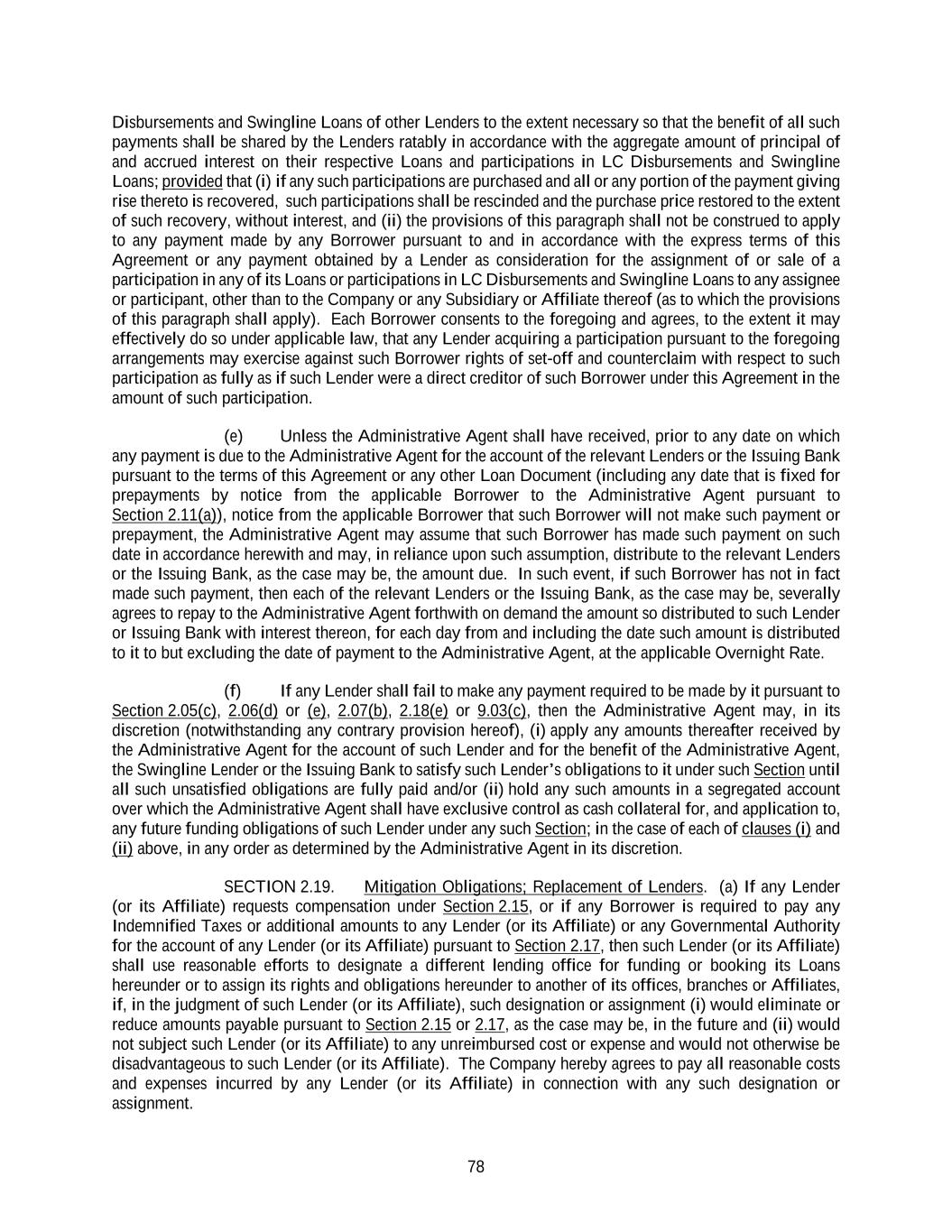 78 Disbursements and Swingline Loans of other Lenders to the extent necessary so that the benefit of all such payments shall be shared by the Lenders ratably in accordance with the aggregate amount of principal of and accrued interest on their respective Loans and participations in LC Disbursements and Swingline Loans; provided that (i) if any such participations are purchased and all or any portion of the payment giving rise thereto is recovered, such participations shall be rescinded and the purchase price restored to the extent of such recovery, without interest, and (ii) the provisions of this paragraph shall not be construed to apply to any payment made by any Borrower pursuant to and in accordance with the express terms of this Agreement or any payment obtained by a Lender as consideration for the assignment of or sale of a participation in any of its Loans or participations in LC Disbursements and Swingline Loans to any assignee or participant, other than to the Company or any Subsidiary or Affiliate thereof (as to which the provisions of this paragraph shall apply). Each Borrower consents to the foregoing and agrees, to the extent it may effectively do so under applicable law, that any Lender acquiring a participation pursuant to the foregoing arrangements may exercise against such Borrower rights of set-off and counterclaim with respect to such participation as fully as if such Lender were a direct creditor of such Borrower under this Agreement in the amount of such participation. (e) Unless the Administrative Agent shall have received, prior to any date on which any payment is due to the Administrative Agent for the account of the relevant Lenders or the Issuing Bank pursuant to the terms of this Agreement or any other Loan Document (including any date that is fixed for prepayments by notice from the applicable Borrower to the Administrative Agent pursuant to Section 2.11(a)), notice from the applicable Borrower that such Borrower will not make such payment or prepayment, the Administrative Agent may assume that such Borrower has made such payment on such date in accordance herewith and may, in reliance upon such assumption, distribute to the relevant Lenders or the Issuing Bank, as the case may be, the amount due. In such event, if such Borrower has not in fact made such payment, then each of the relevant Lenders or the Issuing Bank, as the case may be, severally agrees to repay to the Administrative Agent forthwith on demand the amount so distributed to such Lender or Issuing Bank with interest thereon, for each day from and including the date such amount is distributed to it to but excluding the date of payment to the Administrative Agent, at the applicable Overnight Rate. (f) If any Lender shall fail to make any payment required to be made by it pursuant to Section 2.05(c), 2.06(d) or (e), 2.07(b), 2.18(e) or 9.03(c), then the Administrative Agent may, in its discretion (notwithstanding any contrary provision hereof), (i) apply any amounts thereafter received by the Administrative Agent for the account of such Lender and for the benefit of the Administrative Agent, the Swingline Lender or the Issuing Bank to satisfy such Lender’s obligations to it under such Section until all such unsatisfied obligations are fully paid and/or (ii) hold any such amounts in a segregated account over which the Administrative Agent shall have exclusive control as cash collateral for, and application to, any future funding obligations of such Lender under any such Section; in the case of each of clauses (i) and (ii) above, in any order as determined by the Administrative Agent in its discretion. SECTION 2.19. Mitigation Obligations; Replacement of Lenders. (a) If any Lender (or its Affiliate) requests compensation under Section 2.15, or if any Borrower is required to pay any Indemnified Taxes or additional amounts to any Lender (or its Affiliate) or any Governmental Authority for the account of any Lender (or its Affiliate) pursuant to Section 2.17, then such Lender (or its Affiliate) shall use reasonable efforts to designate a different lending office for funding or booking its Loans hereunder or to assign its rights and obligations hereunder to another of its offices, branches or Affiliates, if, in the judgment of such Lender (or its Affiliate), such designation or assignment (i) would eliminate or reduce amounts payable pursuant to Section 2.15 or 2.17, as the case may be, in the future and (ii) would not subject such Lender (or its Affiliate) to any unreimbursed cost or expense and would not otherwise be disadvantageous to such Lender (or its Affiliate). The Company hereby agrees to pay all reasonable costs and expenses incurred by any Lender (or its Affiliate) in connection with any such designation or assignment.