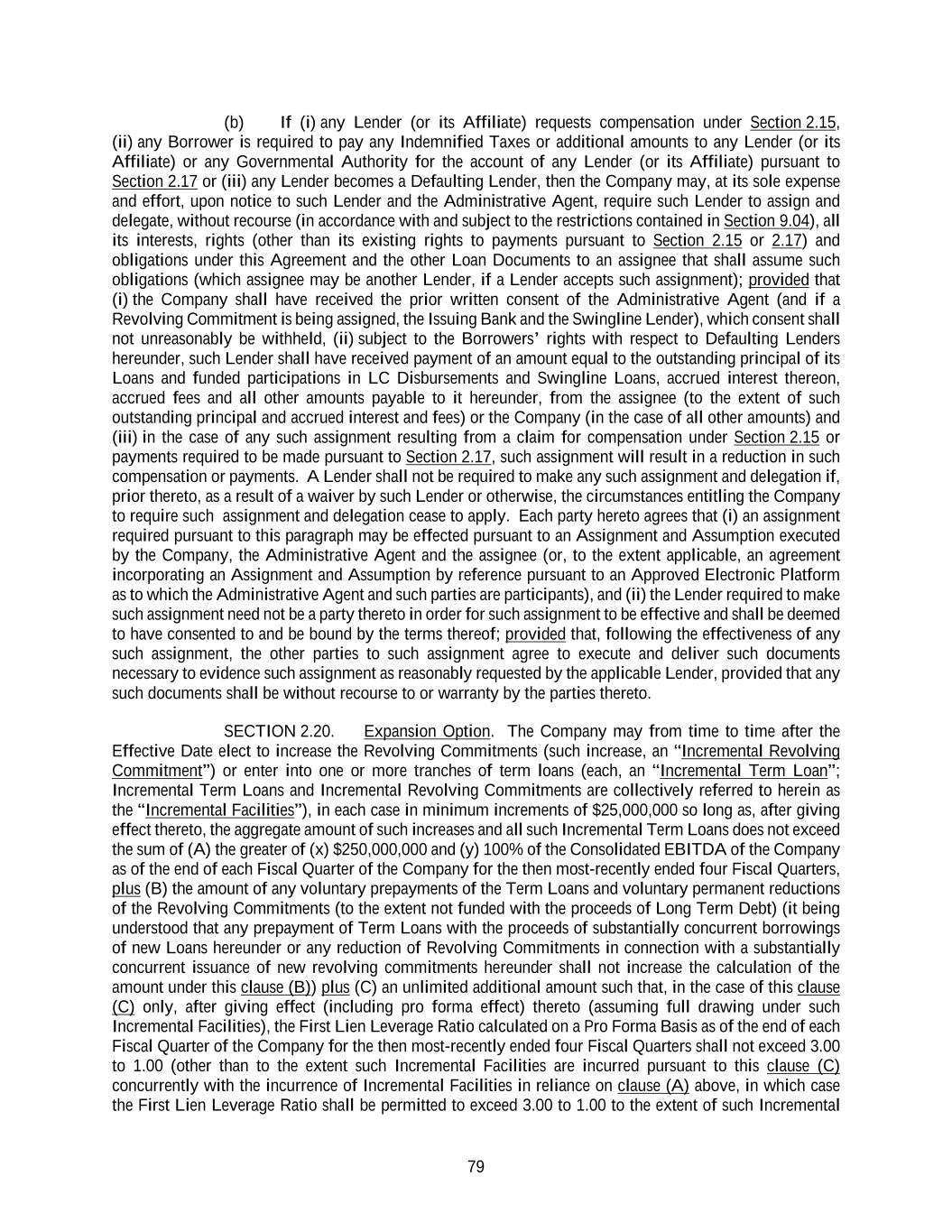 79 (b) If (i) any Lender (or its Affiliate) requests compensation under Section 2.15, (ii) any Borrower is required to pay any Indemnified Taxes or additional amounts to any Lender (or its Affiliate) or any Governmental Authority for the account of any Lender (or its Affiliate) pursuant to Section 2.17 or (iii) any Lender becomes a Defaulting Lender, then the Company may, at its sole expense and effort, upon notice to such Lender and the Administrative Agent, require such Lender to assign and delegate, without recourse (in accordance with and subject to the restrictions contained in Section 9.04), all its interests, rights (other than its existing rights to payments pursuant to Section 2.15 or 2.17) and obligations under this Agreement and the other Loan Documents to an assignee that shall assume such obligations (which assignee may be another Lender, if a Lender accepts such assignment); provided that (i) the Company shall have received the prior written consent of the Administrative Agent (and if a Revolving Commitment is being assigned, the Issuing Bank and the Swingline Lender), which consent shall not unreasonably be withheld, (ii) subject to the Borrowers’ rights with respect to Defaulting Lenders hereunder, such Lender shall have received payment of an amount equal to the outstanding principal of its Loans and funded participations in LC Disbursements and Swingline Loans, accrued interest thereon, accrued fees and all other amounts payable to it hereunder, from the assignee (to the extent of such outstanding principal and accrued interest and fees) or the Company (in the case of all other amounts) and (iii) in the case of any such assignment resulting from a claim for compensation under Section 2.15 or payments required to be made pursuant to Section 2.17, such assignment will result in a reduction in such compensation or payments. A Lender shall not be required to make any such assignment and delegation if, prior thereto, as a result of a waiver by such Lender or otherwise, the circumstances entitling the Company to require such assignment and delegation cease to apply. Each party hereto agrees that (i) an assignment required pursuant to this paragraph may be effected pursuant to an Assignment and Assumption executed by the Company, the Administrative Agent and the assignee (or, to the extent applicable, an agreement incorporating an Assignment and Assumption by reference pursuant to an Approved Electronic Platform as to which the Administrative Agent and such parties are participants), and (ii) the Lender required to make such assignment need not be a party thereto in order for such assignment to be effective and shall be deemed to have consented to and be bound by the terms thereof; provided that, following the effectiveness of any such assignment, the other parties to such assignment agree to execute and deliver such documents necessary to evidence such assignment as reasonably requested by the applicable Lender, provided that any such documents shall be without recourse to or warranty by the parties thereto. SECTION 2.20. Expansion Option. The Company may from time to time after the Effective Date elect to increase the Revolving Commitments (such increase, an “Incremental Revolving Commitment”) or enter into one or more tranches of term loans (each, an “Incremental Term Loan”; Incremental Term Loans and Incremental Revolving Commitments are collectively referred to herein as the “Incremental Facilities”), in each case in minimum increments of $25,000,000 so long as, after giving effect thereto, the aggregate amount of such increases and all such Incremental Term Loans does not exceed the sum of (A) the greater of (x) $250,000,000 and (y) 100% of the Consolidated EBITDA of the Company as of the end of each Fiscal Quarter of the Company for the then most-recently ended four Fiscal Quarters, plus (B) the amount of any voluntary prepayments of the Term Loans and voluntary permanent reductions of the Revolving Commitments (to the extent not funded with the proceeds of Long Term Debt) (it being understood that any prepayment of Term Loans with the proceeds of substantially concurrent borrowings of new Loans hereunder or any reduction of Revolving Commitments in connection with a substantially concurrent issuance of new revolving commitments hereunder shall not increase the calculation of the amount under this clause (B)) plus (C) an unlimited additional amount such that, in the case of this clause (C) only, after giving effect (including pro forma effect) thereto (assuming full drawing under such Incremental Facilities), the First Lien Leverage Ratio calculated on a Pro Forma Basis as of the end of each Fiscal Quarter of the Company for the then most-recently ended four Fiscal Quarters shall not exceed 3.00 to 1.00 (other than to the extent such Incremental Facilities are incurred pursuant to this clause (C) concurrently with the incurrence of Incremental Facilities in reliance on clause (A) above, in which case the First Lien Leverage Ratio shall be permitted to exceed 3.00 to 1.00 to the extent of such Incremental