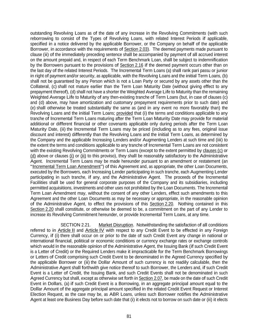 81 outstanding Revolving Loans as of the date of any increase in the Revolving Commitments (with such reborrowing to consist of the Types of Revolving Loans, with related Interest Periods if applicable, specified in a notice delivered by the applicable Borrower, or the Company on behalf of the applicable Borrower, in accordance with the requirements of Section 2.03). The deemed payments made pursuant to clause (ii) of the immediately preceding sentence shall be accompanied by payment of all accrued interest on the amount prepaid and, in respect of each Term Benchmark Loan, shall be subject to indemnification by the Borrowers pursuant to the provisions of Section 2.16 if the deemed payment occurs other than on the last day of the related Interest Periods. The Incremental Term Loans (a) shall rank pari passu or junior in right of payment and/or security, as applicable, with the Revolving Loans and the initial Term Loans, (b) shall not be guaranteed by any Person which is not a Loan Party or secured by any assets other than the Collateral, (c) shall not mature earlier than the Term Loan Maturity Date (without giving effect to any prepayment thereof), (d) shall not have a shorter the Weighted Average Life to Maturity than the remaining Weighted Average Life to Maturity of any then-existing tranche of Term Loans (but, in case of clauses (c) and (d) above, may have amortization and customary prepayment requirements prior to such date) and (e) shall otherwise be treated substantially the same as (and in any event no more favorably than) the Revolving Loans and the initial Term Loans; provided that (i) the terms and conditions applicable to any tranche of Incremental Term Loans maturing after the Term Loan Maturity Date may provide for material additional or different financial or other covenants applicable only during periods after the Term Loan Maturity Date, (ii) the Incremental Term Loans may be priced (including as to any fees, original issue discount and interest) differently than the Revolving Loans and the initial Term Loans, as determined by the Company and the applicable Increasing Lenders and/or Augmenting Lenders at such time and (iii) to the extent the terms and conditions applicable to any tranche of Incremental Term Loans are not consistent with the existing Revolving Commitments or Term Loans (except to the extent permitted by clauses (c) or (d) above or clauses (i) or (ii) to this proviso), they shall be reasonably satisfactory to the Administrative Agent. Incremental Term Loans may be made hereunder pursuant to an amendment or restatement (an “Incremental Term Loan Amendment”) of this Agreement and, as appropriate, the other Loan Documents, executed by the Borrowers, each Increasing Lender participating in such tranche, each Augmenting Lender participating in such tranche, if any, and the Administrative Agent. The proceeds of the Incremental Facilities shall be used for general corporate purposes of the Company and its subsidiaries, including permitted acquisitions, investments and other uses not prohibited by the Loan Documents. The Incremental Term Loan Amendment may, without the consent of any other Lenders, effect such amendments to this Agreement and the other Loan Documents as may be necessary or appropriate, in the reasonable opinion of the Administrative Agent, to effect the provisions of this Section 2.20. Nothing contained in this Section 2.20 shall constitute, or otherwise be deemed to be, a commitment on the part of any Lender to increase its Revolving Commitment hereunder, or provide Incremental Term Loans, at any time. SECTION 2.21. Market Disruption. Notwithstanding the satisfaction of all conditions referred to in Article II and Article IV with respect to any Credit Event to be effected in any Foreign Currency, if (i) there shall occur on or prior to the date of such Credit Event any change in national or international financial, political or economic conditions or currency exchange rates or exchange controls which would in the reasonable opinion of the Administrative Agent, the Issuing Bank (if such Credit Event is a Letter of Credit) or the Required Lenders make it impracticable for the Term Benchmark Borrowings or Letters of Credit comprising such Credit Event to be denominated in the Agreed Currency specified by the applicable Borrower or (ii) the Dollar Amount of such currency is not readily calculable, then the Administrative Agent shall forthwith give notice thereof to such Borrower, the Lenders and, if such Credit Event is a Letter of Credit, the Issuing Bank, and such Credit Events shall not be denominated in such Agreed Currency but shall, except as otherwise set forth in Section 2.07, be made on the date of such Credit Event in Dollars, (a) if such Credit Event is a Borrowing, in an aggregate principal amount equal to the Dollar Amount of the aggregate principal amount specified in the related Credit Event Request or Interest Election Request, as the case may be, as ABR Loans, unless such Borrower notifies the Administrative Agent at least one Business Day before such date that (i) it elects not to borrow on such date or (ii) it elects