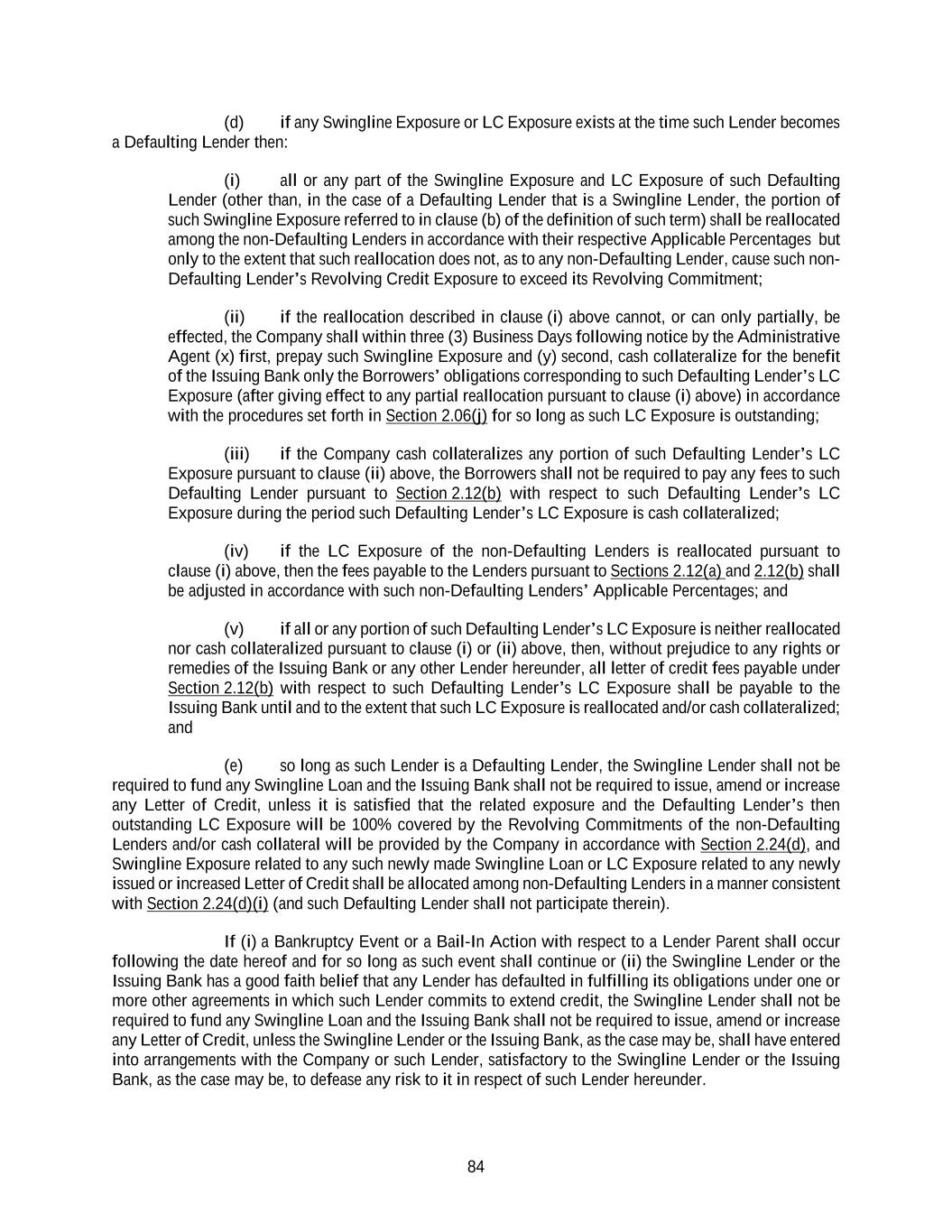 84 (d) if any Swingline Exposure or LC Exposure exists at the time such Lender becomes a Defaulting Lender then: (i) all or any part of the Swingline Exposure and LC Exposure of such Defaulting Lender (other than, in the case of a Defaulting Lender that is a Swingline Lender, the portion of such Swingline Exposure referred to in clause (b) of the definition of such term) shall be reallocated among the non-Defaulting Lenders in accordance with their respective Applicable Percentages but only to the extent that such reallocation does not, as to any non-Defaulting Lender, cause such non- Defaulting Lender’s Revolving Credit Exposure to exceed its Revolving Commitment; (ii) if the reallocation described in clause (i) above cannot, or can only partially, be effected, the Company shall within three (3) Business Days following notice by the Administrative Agent (x) first, prepay such Swingline Exposure and (y) second, cash collateralize for the benefit of the Issuing Bank only the Borrowers’ obligations corresponding to such Defaulting Lender’s LC Exposure (after giving effect to any partial reallocation pursuant to clause (i) above) in accordance with the procedures set forth in Section 2.06(j) for so long as such LC Exposure is outstanding; (iii) if the Company cash collateralizes any portion of such Defaulting Lender’s LC Exposure pursuant to clause (ii) above, the Borrowers shall not be required to pay any fees to such Defaulting Lender pursuant to Section 2.12(b) with respect to such Defaulting Lender’s LC Exposure during the period such Defaulting Lender’s LC Exposure is cash collateralized; (iv) if the LC Exposure of the non-Defaulting Lenders is reallocated pursuant to clause (i) above, then the fees payable to the Lenders pursuant to Sections 2.12(a) and 2.12(b) shall be adjusted in accordance with such non-Defaulting Lenders’ Applicable Percentages; and (v) if all or any portion of such Defaulting Lender’s LC Exposure is neither reallocated nor cash collateralized pursuant to clause (i) or (ii) above, then, without prejudice to any rights or remedies of the Issuing Bank or any other Lender hereunder, all letter of credit fees payable under Section 2.12(b) with respect to such Defaulting Lender’s LC Exposure shall be payable to the Issuing Bank until and to the extent that such LC Exposure is reallocated and/or cash collateralized; and (e) so long as such Lender is a Defaulting Lender, the Swingline Lender shall not be required to fund any Swingline Loan and the Issuing Bank shall not be required to issue, amend or increase any Letter of Credit, unless it is satisfied that the related exposure and the Defaulting Lender’s then outstanding LC Exposure will be 100% covered by the Revolving Commitments of the non-Defaulting Lenders and/or cash collateral will be provided by the Company in accordance with Section 2.24(d), and Swingline Exposure related to any such newly made Swingline Loan or LC Exposure related to any newly issued or increased Letter of Credit shall be allocated among non-Defaulting Lenders in a manner consistent with Section 2.24(d)(i) (and such Defaulting Lender shall not participate therein). If (i) a Bankruptcy Event or a Bail-In Action with respect to a Lender Parent shall occur following the date hereof and for so long as such event shall continue or (ii) the Swingline Lender or the Issuing Bank has a good faith belief that any Lender has defaulted in fulfilling its obligations under one or more other agreements in which such Lender commits to extend credit, the Swingline Lender shall not be required to fund any Swingline Loan and the Issuing Bank shall not be required to issue, amend or increase any Letter of Credit, unless the Swingline Lender or the Issuing Bank, as the case may be, shall have entered into arrangements with the Company or such Lender, satisfactory to the Swingline Lender or the Issuing Bank, as the case may be, to defease any risk to it in respect of such Lender hereunder.