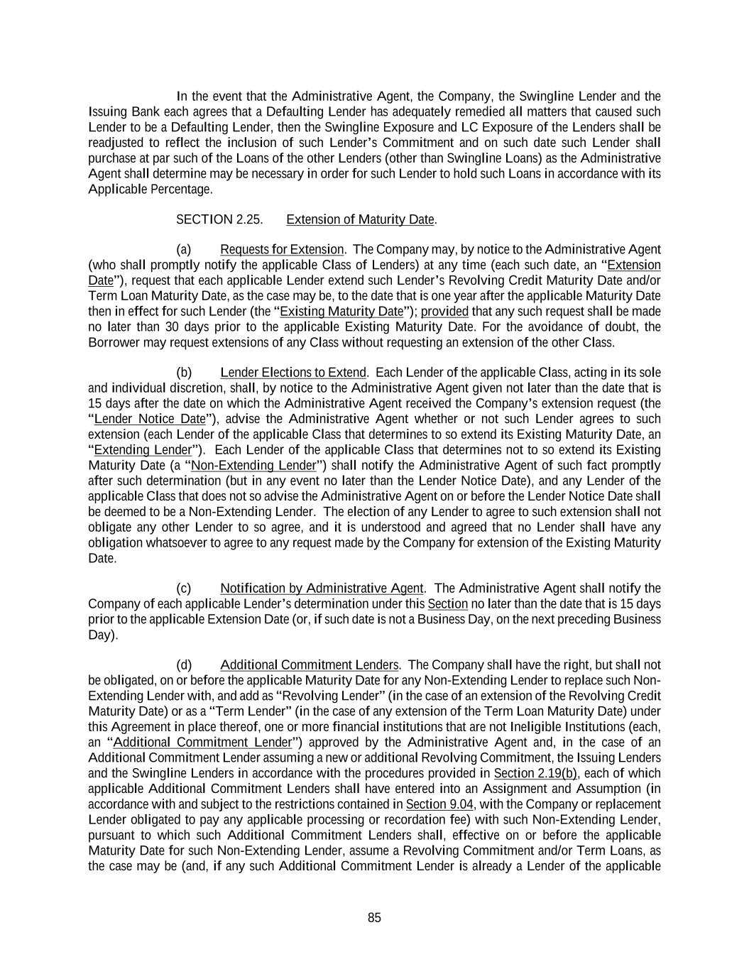 85 In the event that the Administrative Agent, the Company, the Swingline Lender and the Issuing Bank each agrees that a Defaulting Lender has adequately remedied all matters that caused such Lender to be a Defaulting Lender, then the Swingline Exposure and LC Exposure of the Lenders shall be readjusted to reflect the inclusion of such Lender’s Commitment and on such date such Lender shall purchase at par such of the Loans of the other Lenders (other than Swingline Loans) as the Administrative Agent shall determine may be necessary in order for such Lender to hold such Loans in accordance with its Applicable Percentage. SECTION 2.25. Extension of Maturity Date. (a) Requests for Extension. The Company may, by notice to the Administrative Agent (who shall promptly notify the applicable Class of Lenders) at any time (each such date, an “Extension Date”), request that each applicable Lender extend such Lender’s Revolving Credit Maturity Date and/or Term Loan Maturity Date, as the case may be, to the date that is one year after the applicable Maturity Date then in effect for such Lender (the “Existing Maturity Date”); provided that any such request shall be made no later than 30 days prior to the applicable Existing Maturity Date. For the avoidance of doubt, the Borrower may request extensions of any Class without requesting an extension of the other Class. (b) Lender Elections to Extend. Each Lender of the applicable Class, acting in its sole and individual discretion, shall, by notice to the Administrative Agent given not later than the date that is 15 days after the date on which the Administrative Agent received the Company’s extension request (the “Lender Notice Date”), advise the Administrative Agent whether or not such Lender agrees to such extension (each Lender of the applicable Class that determines to so extend its Existing Maturity Date, an “Extending Lender”). Each Lender of the applicable Class that determines not to so extend its Existing Maturity Date (a “Non-Extending Lender”) shall notify the Administrative Agent of such fact promptly after such determination (but in any event no later than the Lender Notice Date), and any Lender of the applicable Class that does not so advise the Administrative Agent on or before the Lender Notice Date shall be deemed to be a Non-Extending Lender. The election of any Lender to agree to such extension shall not obligate any other Lender to so agree, and it is understood and agreed that no Lender shall have any obligation whatsoever to agree to any request made by the Company for extension of the Existing Maturity Date. (c) Notification by Administrative Agent. The Administrative Agent shall notify the Company of each applicable Lender’s determination under this Section no later than the date that is 15 days prior to the applicable Extension Date (or, if such date is not a Business Day, on the next preceding Business Day). (d) Additional Commitment Lenders. The Company shall have the right, but shall not be obligated, on or before the applicable Maturity Date for any Non-Extending Lender to replace such Non- Extending Lender with, and add as “Revolving Lender” (in the case of an extension of the Revolving Credit Maturity Date) or as a “Term Lender” (in the case of any extension of the Term Loan Maturity Date) under this Agreement in place thereof, one or more financial institutions that are not Ineligible Institutions (each, an “Additional Commitment Lender”) approved by the Administrative Agent and, in the case of an Additional Commitment Lender assuming a new or additional Revolving Commitment, the Issuing Lenders and the Swingline Lenders in accordance with the procedures provided in Section 2.19(b), each of which applicable Additional Commitment Lenders shall have entered into an Assignment and Assumption (in accordance with and subject to the restrictions contained in Section 9.04, with the Company or replacement Lender obligated to pay any applicable processing or recordation fee) with such Non-Extending Lender, pursuant to which such Additional Commitment Lenders shall, effective on or before the applicable Maturity Date for such Non-Extending Lender, assume a Revolving Commitment and/or Term Loans, as the case may be (and, if any such Additional Commitment Lender is already a Lender of the applicable
