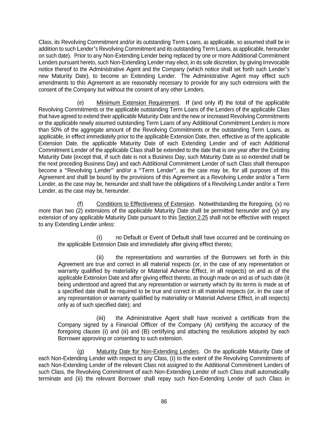 86 Class, its Revolving Commitment and/or its outstanding Term Loans, as applicable, so assumed shall be in addition to such Lender’s Revolving Commitment and its outstanding Term Loans, as applicable, hereunder on such date). Prior to any Non-Extending Lender being replaced by one or more Additional Commitment Lenders pursuant hereto, such Non-Extending Lender may elect, in its sole discretion, by giving irrevocable notice thereof to the Administrative Agent and the Company (which notice shall set forth such Lender’s new Maturity Date), to become an Extending Lender. The Administrative Agent may effect such amendments to this Agreement as are reasonably necessary to provide for any such extensions with the consent of the Company but without the consent of any other Lenders. (e) Minimum Extension Requirement. If (and only if) the total of the applicable Revolving Commitments or the applicable outstanding Term Loans of the Lenders of the applicable Class that have agreed to extend their applicable Maturity Date and the new or increased Revolving Commitments or the applicable newly assumed outstanding Term Loans of any Additional Commitment Lenders is more than 50% of the aggregate amount of the Revolving Commitments or the outstanding Term Loans, as applicable, in effect immediately prior to the applicable Extension Date, then, effective as of the applicable Extension Date, the applicable Maturity Date of each Extending Lender and of each Additional Commitment Lender of the applicable Class shall be extended to the date that is one year after the Existing Maturity Date (except that, if such date is not a Business Day, such Maturity Date as so extended shall be the next preceding Business Day) and each Additional Commitment Lender of such Class shall thereupon become a “Revolving Lender” and/or a “Term Lender”, as the case may be, for all purposes of this Agreement and shall be bound by the provisions of this Agreement as a Revolving Lender and/or a Term Lender, as the case may be, hereunder and shall have the obligations of a Revolving Lender and/or a Term Lender, as the case may be, hereunder. (f) Conditions to Effectiveness of Extension. Notwithstanding the foregoing, (x) no more than two (2) extensions of the applicable Maturity Date shall be permitted hereunder and (y) any extension of any applicable Maturity Date pursuant to this Section 2.25 shall not be effective with respect to any Extending Lender unless: (i) no Default or Event of Default shall have occurred and be continuing on the applicable Extension Date and immediately after giving effect thereto; (ii) the representations and warranties of the Borrowers set forth in this Agreement are true and correct in all material respects (or, in the case of any representation or warranty qualified by materiality or Material Adverse Effect, in all respects) on and as of the applicable Extension Date and after giving effect thereto, as though made on and as of such date (it being understood and agreed that any representation or warranty which by its terms is made as of a specified date shall be required to be true and correct in all material respects (or, in the case of any representation or warranty qualified by materiality or Material Adverse Effect, in all respects) only as of such specified date); and (iii) the Administrative Agent shall have received a certificate from the Company signed by a Financial Officer of the Company (A) certifying the accuracy of the foregoing clauses (i) and (ii) and (B) certifying and attaching the resolutions adopted by each Borrower approving or consenting to such extension. (g) Maturity Date for Non-Extending Lenders. On the applicable Maturity Date of each Non-Extending Lender with respect to any Class, (i) to the extent of the Revolving Commitments of each Non-Extending Lender of the relevant Class not assigned to the Additional Commitment Lenders of such Class, the Revolving Commitment of each Non-Extending Lender of such Class shall automatically terminate and (ii) the relevant Borrower shall repay such Non-Extending Lender of such Class in