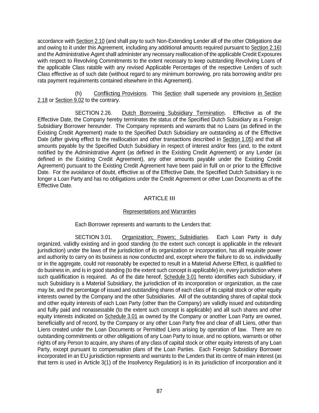 87 accordance with Section 2.10 (and shall pay to such Non-Extending Lender all of the other Obligations due and owing to it under this Agreement, including any additional amounts required pursuant to Section 2.16) and the Administrative Agent shall administer any necessary reallocation of the applicable Credit Exposures with respect to Revolving Commitments to the extent necessary to keep outstanding Revolving Loans of the applicable Class ratable with any revised Applicable Percentages of the respective Lenders of such Class effective as of such date (without regard to any minimum borrowing, pro rata borrowing and/or pro rata payment requirements contained elsewhere in this Agreement). (h) Conflicting Provisions. This Section shall supersede any provisions in Section 2.18 or Section 9.02 to the contrary. SECTION 2.26. Dutch Borrowing Subsidiary Termination. Effective as of the Effective Date, the Company hereby terminates the status of the Specified Dutch Subsidiary as a Foreign Subsidiary Borrower hereunder. The Company represents and warrants that no Loans (as defined in the Existing Credit Agreement) made to the Specified Dutch Subsidiary are outstanding as of the Effective Date (after giving effect to the reallocation and other transactions described in Section 1.05) and that all amounts payable by the Specified Dutch Subsidiary in respect of interest and/or fees (and, to the extent notified by the Administrative Agent (as defined in the Existing Credit Agreement) or any Lender (as defined in the Existing Credit Agreement), any other amounts payable under the Existing Credit Agreement) pursuant to the Existing Credit Agreement have been paid in full on or prior to the Effective Date. For the avoidance of doubt, effective as of the Effective Date, the Specified Dutch Subsidiary is no longer a Loan Party and has no obligations under the Credit Agreement or other Loan Documents as of the Effective Date. ARTICLE III Representations and Warranties Each Borrower represents and warrants to the Lenders that: SECTION 3.01. Organization; Powers; Subsidiaries. Each Loan Party is duly organized, validly existing and in good standing (to the extent such concept is applicable in the relevant jurisdiction) under the laws of the jurisdiction of its organization or incorporation, has all requisite power and authority to carry on its business as now conducted and, except where the failure to do so, individually or in the aggregate, could not reasonably be expected to result in a Material Adverse Effect, is qualified to do business in, and is in good standing (to the extent such concept is applicable) in, every jurisdiction where such qualification is required. As of the date hereof, Schedule 3.01 hereto identifies each Subsidiary, if such Subsidiary is a Material Subsidiary, the jurisdiction of its incorporation or organization, as the case may be, and the percentage of issued and outstanding shares of each class of its capital stock or other equity interests owned by the Company and the other Subsidiaries. All of the outstanding shares of capital stock and other equity interests of each Loan Party (other than the Company) are validly issued and outstanding and fully paid and nonassessable (to the extent such concept is applicable) and all such shares and other equity interests indicated on Schedule 3.01 as owned by the Company or another Loan Party are owned, beneficially and of record, by the Company or any other Loan Party free and clear of all Liens, other than Liens created under the Loan Documents or Permitted Liens arising by operation of law. There are no outstanding commitments or other obligations of any Loan Party to issue, and no options, warrants or other rights of any Person to acquire, any shares of any class of capital stock or other equity interests of any Loan Party, except pursuant to compensation plans of the Loan Parties. Each Foreign Subsidiary Borrower incorporated in an EU jurisdiction represents and warrants to the Lenders that its centre of main interest (as that term is used in Article 3(1) of the Insolvency Regulation) is in its jurisdiction of incorporation and it