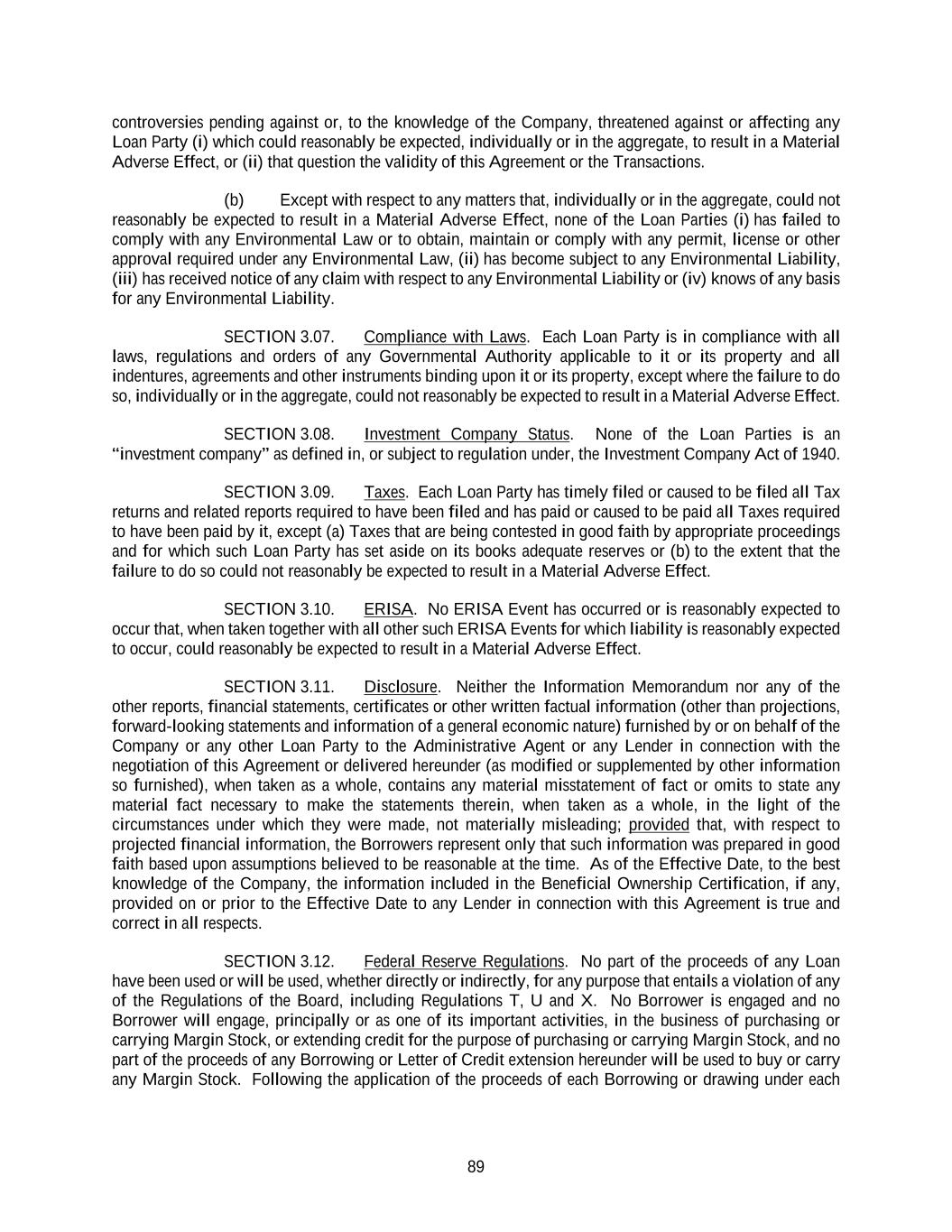 89 controversies pending against or, to the knowledge of the Company, threatened against or affecting any Loan Party (i) which could reasonably be expected, individually or in the aggregate, to result in a Material Adverse Effect, or (ii) that question the validity of this Agreement or the Transactions. (b) Except with respect to any matters that, individually or in the aggregate, could not reasonably be expected to result in a Material Adverse Effect, none of the Loan Parties (i) has failed to comply with any Environmental Law or to obtain, maintain or comply with any permit, license or other approval required under any Environmental Law, (ii) has become subject to any Environmental Liability, (iii) has received notice of any claim with respect to any Environmental Liability or (iv) knows of any basis for any Environmental Liability. SECTION 3.07. Compliance with Laws. Each Loan Party is in compliance with all laws, regulations and orders of any Governmental Authority applicable to it or its property and all indentures, agreements and other instruments binding upon it or its property, except where the failure to do so, individually or in the aggregate, could not reasonably be expected to result in a Material Adverse Effect. SECTION 3.08. Investment Company Status. None of the Loan Parties is an “investment company” as defined in, or subject to regulation under, the Investment Company Act of 1940. SECTION 3.09. Taxes. Each Loan Party has timely filed or caused to be filed all Tax returns and related reports required to have been filed and has paid or caused to be paid all Taxes required to have been paid by it, except (a) Taxes that are being contested in good faith by appropriate proceedings and for which such Loan Party has set aside on its books adequate reserves or (b) to the extent that the failure to do so could not reasonably be expected to result in a Material Adverse Effect. SECTION 3.10. ERISA. No ERISA Event has occurred or is reasonably expected to occur that, when taken together with all other such ERISA Events for which liability is reasonably expected to occur, could reasonably be expected to result in a Material Adverse Effect. SECTION 3.11. Disclosure. Neither the Information Memorandum nor any of the other reports, financial statements, certificates or other written factual information (other than projections, forward-looking statements and information of a general economic nature) furnished by or on behalf of the Company or any other Loan Party to the Administrative Agent or any Lender in connection with the negotiation of this Agreement or delivered hereunder (as modified or supplemented by other information so furnished), when taken as a whole, contains any material misstatement of fact or omits to state any material fact necessary to make the statements therein, when taken as a whole, in the light of the circumstances under which they were made, not materially misleading; provided that, with respect to projected financial information, the Borrowers represent only that such information was prepared in good faith based upon assumptions believed to be reasonable at the time. As of the Effective Date, to the best knowledge of the Company, the information included in the Beneficial Ownership Certification, if any, provided on or prior to the Effective Date to any Lender in connection with this Agreement is true and correct in all respects. SECTION 3.12. Federal Reserve Regulations. No part of the proceeds of any Loan have been used or will be used, whether directly or indirectly, for any purpose that entails a violation of any of the Regulations of the Board, including Regulations T, U and X. No Borrower is engaged and no Borrower will engage, principally or as one of its important activities, in the business of purchasing or carrying Margin Stock, or extending credit for the purpose of purchasing or carrying Margin Stock, and no part of the proceeds of any Borrowing or Letter of Credit extension hereunder will be used to buy or carry any Margin Stock. Following the application of the proceeds of each Borrowing or drawing under each