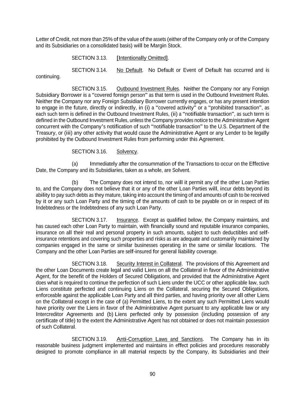 90 Letter of Credit, not more than 25% of the value of the assets (either of the Company only or of the Company and its Subsidiaries on a consolidated basis) will be Margin Stock. SECTION 3.13. [Intentionally Omitted]. SECTION 3.14. No Default. No Default or Event of Default has occurred and is continuing. SECTION 3.15. Outbound Investment Rules. Neither the Company nor any Foreign Subsidiary Borrower is a “covered foreign person” as that term is used in the Outbound Investment Rules. Neither the Company nor any Foreign Subsidiary Borrower currently engages, or has any present intention to engage in the future, directly or indirectly, in (i) a “covered activity” or a “prohibited transaction”, as each such term is defined in the Outbound Investment Rules, (ii) a “notifiable transaction”, as such term is defined in the Outbound Investment Rules, unless the Company provides notice to the Administrative Agent concurrent with the Company’s notification of such “notifiable transaction” to the U.S. Department of the Treasury, or (iii) any other activity that would cause the Administrative Agent or any Lender to be legally prohibited by the Outbound Investment Rules from performing under this Agreement. SECTION 3.16. Solvency. (a) Immediately after the consummation of the Transactions to occur on the Effective Date, the Company and its Subsidiaries, taken as a whole, are Solvent. (b) The Company does not intend to, nor will it permit any of the other Loan Parties to, and the Company does not believe that it or any of the other Loan Parties will, incur debts beyond its ability to pay such debts as they mature, taking into account the timing of and amounts of cash to be received by it or any such Loan Party and the timing of the amounts of cash to be payable on or in respect of its Indebtedness or the Indebtedness of any such Loan Party. SECTION 3.17. Insurance. Except as qualified below, the Company maintains, and has caused each other Loan Party to maintain, with financially sound and reputable insurance companies, insurance on all their real and personal property in such amounts, subject to such deductibles and self- insurance retentions and covering such properties and risks as are adequate and customarily maintained by companies engaged in the same or similar businesses operating in the same or similar locations. The Company and the other Loan Parties are self-insured for general liability coverage. SECTION 3.18. Security Interest in Collateral. The provisions of this Agreement and the other Loan Documents create legal and valid Liens on all the Collateral in favor of the Administrative Agent, for the benefit of the Holders of Secured Obligations, and provided that the Administrative Agent does what is required to continue the perfection of such Liens under the UCC or other applicable law, such Liens constitute perfected and continuing Liens on the Collateral, securing the Secured Obligations, enforceable against the applicable Loan Party and all third parties, and having priority over all other Liens on the Collateral except in the case of (a) Permitted Liens, to the extent any such Permitted Liens would have priority over the Liens in favor of the Administrative Agent pursuant to any applicable law or any Intercreditor Agreements and (b) Liens perfected only by possession (including possession of any certificate of title) to the extent the Administrative Agent has not obtained or does not maintain possession of such Collateral. SECTION 3.19. Anti-Corruption Laws and Sanctions. The Company has in its reasonable business judgment implemented and maintains in effect policies and procedures reasonably designed to promote compliance in all material respects by the Company, its Subsidiaries and their