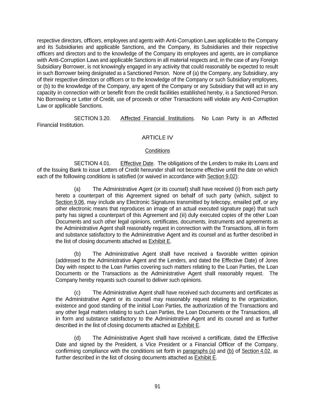 91 respective directors, officers, employees and agents with Anti-Corruption Laws applicable to the Company and its Subsidiaries and applicable Sanctions, and the Company, its Subsidiaries and their respective officers and directors and to the knowledge of the Company its employees and agents, are in compliance with Anti-Corruption Laws and applicable Sanctions in all material respects and, in the case of any Foreign Subsidiary Borrower, is not knowingly engaged in any activity that could reasonably be expected to result in such Borrower being designated as a Sanctioned Person. None of (a) the Company, any Subsidiary, any of their respective directors or officers or to the knowledge of the Company or such Subsidiary employees, or (b) to the knowledge of the Company, any agent of the Company or any Subsidiary that will act in any capacity in connection with or benefit from the credit facilities established hereby, is a Sanctioned Person. No Borrowing or Letter of Credit, use of proceeds or other Transactions will violate any Anti-Corruption Law or applicable Sanctions. SECTION 3.20. Affected Financial Institutions. No Loan Party is an Affected Financial Institution. ARTICLE IV Conditions SECTION 4.01. Effective Date. The obligations of the Lenders to make its Loans and of the Issuing Bank to issue Letters of Credit hereunder shall not become effective until the date on which each of the following conditions is satisfied (or waived in accordance with Section 9.02): (a) The Administrative Agent (or its counsel) shall have received (i) from each party hereto a counterpart of this Agreement signed on behalf of such party (which, subject to Section 9.06, may include any Electronic Signatures transmitted by telecopy, emailed pdf, or any other electronic means that reproduces an image of an actual executed signature page) that such party has signed a counterpart of this Agreement and (ii) duly executed copies of the other Loan Documents and such other legal opinions, certificates, documents, instruments and agreements as the Administrative Agent shall reasonably request in connection with the Transactions, all in form and substance satisfactory to the Administrative Agent and its counsel and as further described in the list of closing documents attached as Exhibit E. (b) The Administrative Agent shall have received a favorable written opinion (addressed to the Administrative Agent and the Lenders, and dated the Effective Date) of Jones Day with respect to the Loan Parties covering such matters relating to the Loan Parties, the Loan Documents or the Transactions as the Administrative Agent shall reasonably request. The Company hereby requests such counsel to deliver such opinions. (c) The Administrative Agent shall have received such documents and certificates as the Administrative Agent or its counsel may reasonably request relating to the organization, existence and good standing of the initial Loan Parties, the authorization of the Transactions and any other legal matters relating to such Loan Parties, the Loan Documents or the Transactions, all in form and substance satisfactory to the Administrative Agent and its counsel and as further described in the list of closing documents attached as Exhibit E. (d) The Administrative Agent shall have received a certificate, dated the Effective Date and signed by the President, a Vice President or a Financial Officer of the Company, confirming compliance with the conditions set forth in paragraphs (a) and (b) of Section 4.02, as further described in the list of closing documents attached as Exhibit E.
