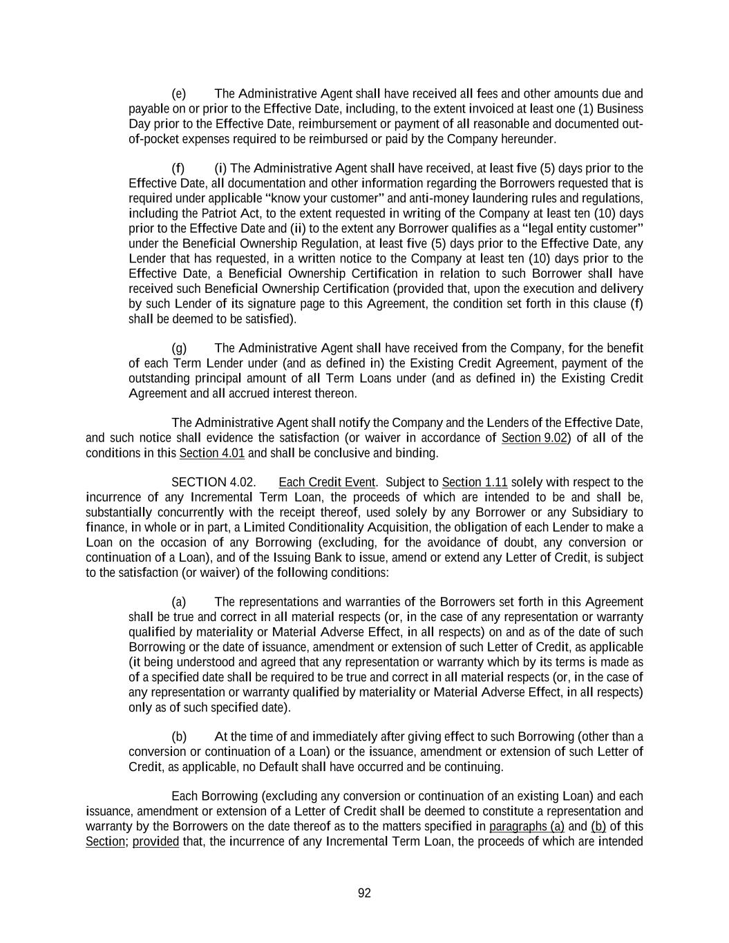 92 (e) The Administrative Agent shall have received all fees and other amounts due and payable on or prior to the Effective Date, including, to the extent invoiced at least one (1) Business Day prior to the Effective Date, reimbursement or payment of all reasonable and documented out- of-pocket expenses required to be reimbursed or paid by the Company hereunder. (f) (i) The Administrative Agent shall have received, at least five (5) days prior to the Effective Date, all documentation and other information regarding the Borrowers requested that is required under applicable “know your customer” and anti-money laundering rules and regulations, including the Patriot Act, to the extent requested in writing of the Company at least ten (10) days prior to the Effective Date and (ii) to the extent any Borrower qualifies as a “legal entity customer” under the Beneficial Ownership Regulation, at least five (5) days prior to the Effective Date, any Lender that has requested, in a written notice to the Company at least ten (10) days prior to the Effective Date, a Beneficial Ownership Certification in relation to such Borrower shall have received such Beneficial Ownership Certification (provided that, upon the execution and delivery by such Lender of its signature page to this Agreement, the condition set forth in this clause (f) shall be deemed to be satisfied). (g) The Administrative Agent shall have received from the Company, for the benefit of each Term Lender under (and as defined in) the Existing Credit Agreement, payment of the outstanding principal amount of all Term Loans under (and as defined in) the Existing Credit Agreement and all accrued interest thereon. The Administrative Agent shall notify the Company and the Lenders of the Effective Date, and such notice shall evidence the satisfaction (or waiver in accordance of Section 9.02) of all of the conditions in this Section 4.01 and shall be conclusive and binding. SECTION 4.02. Each Credit Event. Subject to Section 1.11 solely with respect to the incurrence of any Incremental Term Loan, the proceeds of which are intended to be and shall be, substantially concurrently with the receipt thereof, used solely by any Borrower or any Subsidiary to finance, in whole or in part, a Limited Conditionality Acquisition, the obligation of each Lender to make a Loan on the occasion of any Borrowing (excluding, for the avoidance of doubt, any conversion or continuation of a Loan), and of the Issuing Bank to issue, amend or extend any Letter of Credit, is subject to the satisfaction (or waiver) of the following conditions: (a) The representations and warranties of the Borrowers set forth in this Agreement shall be true and correct in all material respects (or, in the case of any representation or warranty qualified by materiality or Material Adverse Effect, in all respects) on and as of the date of such Borrowing or the date of issuance, amendment or extension of such Letter of Credit, as applicable (it being understood and agreed that any representation or warranty which by its terms is made as of a specified date shall be required to be true and correct in all material respects (or, in the case of any representation or warranty qualified by materiality or Material Adverse Effect, in all respects) only as of such specified date). (b) At the time of and immediately after giving effect to such Borrowing (other than a conversion or continuation of a Loan) or the issuance, amendment or extension of such Letter of Credit, as applicable, no Default shall have occurred and be continuing. Each Borrowing (excluding any conversion or continuation of an existing Loan) and each issuance, amendment or extension of a Letter of Credit shall be deemed to constitute a representation and warranty by the Borrowers on the date thereof as to the matters specified in paragraphs (a) and (b) of this Section; provided that, the incurrence of any Incremental Term Loan, the proceeds of which are intended