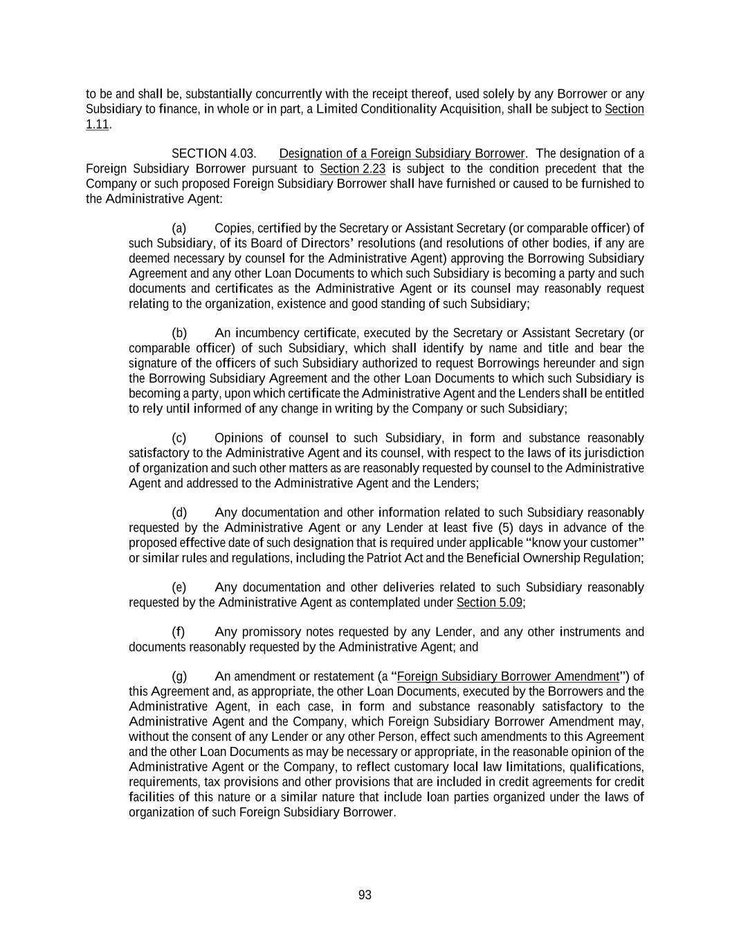 93 to be and shall be, substantially concurrently with the receipt thereof, used solely by any Borrower or any Subsidiary to finance, in whole or in part, a Limited Conditionality Acquisition, shall be subject to Section 1.11. SECTION 4.03. Designation of a Foreign Subsidiary Borrower. The designation of a Foreign Subsidiary Borrower pursuant to Section 2.23 is subject to the condition precedent that the Company or such proposed Foreign Subsidiary Borrower shall have furnished or caused to be furnished to the Administrative Agent: (a) Copies, certified by the Secretary or Assistant Secretary (or comparable officer) of such Subsidiary, of its Board of Directors’ resolutions (and resolutions of other bodies, if any are deemed necessary by counsel for the Administrative Agent) approving the Borrowing Subsidiary Agreement and any other Loan Documents to which such Subsidiary is becoming a party and such documents and certificates as the Administrative Agent or its counsel may reasonably request relating to the organization, existence and good standing of such Subsidiary; (b) An incumbency certificate, executed by the Secretary or Assistant Secretary (or comparable officer) of such Subsidiary, which shall identify by name and title and bear the signature of the officers of such Subsidiary authorized to request Borrowings hereunder and sign the Borrowing Subsidiary Agreement and the other Loan Documents to which such Subsidiary is becoming a party, upon which certificate the Administrative Agent and the Lenders shall be entitled to rely until informed of any change in writing by the Company or such Subsidiary; (c) Opinions of counsel to such Subsidiary, in form and substance reasonably satisfactory to the Administrative Agent and its counsel, with respect to the laws of its jurisdiction of organization and such other matters as are reasonably requested by counsel to the Administrative Agent and addressed to the Administrative Agent and the Lenders; (d) Any documentation and other information related to such Subsidiary reasonably requested by the Administrative Agent or any Lender at least five (5) days in advance of the proposed effective date of such designation that is required under applicable “know your customer” or similar rules and regulations, including the Patriot Act and the Beneficial Ownership Regulation; (e) Any documentation and other deliveries related to such Subsidiary reasonably requested by the Administrative Agent as contemplated under Section 5.09; (f) Any promissory notes requested by any Lender, and any other instruments and documents reasonably requested by the Administrative Agent; and (g) An amendment or restatement (a “Foreign Subsidiary Borrower Amendment”) of this Agreement and, as appropriate, the other Loan Documents, executed by the Borrowers and the Administrative Agent, in each case, in form and substance reasonably satisfactory to the Administrative Agent and the Company, which Foreign Subsidiary Borrower Amendment may, without the consent of any Lender or any other Person, effect such amendments to this Agreement and the other Loan Documents as may be necessary or appropriate, in the reasonable opinion of the Administrative Agent or the Company, to reflect customary local law limitations, qualifications, requirements, tax provisions and other provisions that are included in credit agreements for credit facilities of this nature or a similar nature that include loan parties organized under the laws of organization of such Foreign Subsidiary Borrower.
