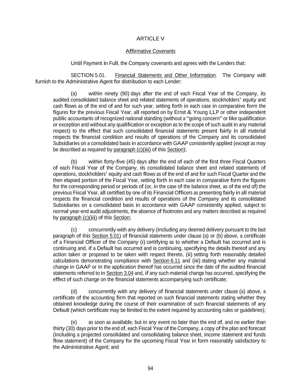 94 ARTICLE V Affirmative Covenants Until Payment in Full, the Company covenants and agrees with the Lenders that: SECTION 5.01. Financial Statements and Other Information. The Company will furnish to the Administrative Agent for distribution to each Lender: (a) within ninety (90) days after the end of each Fiscal Year of the Company, its audited consolidated balance sheet and related statements of operations, stockholders’ equity and cash flows as of the end of and for such year, setting forth in each case in comparative form the figures for the previous Fiscal Year, all reported on by Ernst & Young LLP or other independent public accountants of recognized national standing (without a “going concern” or like qualification or exception and without any qualification or exception as to the scope of such audit in any material respect) to the effect that such consolidated financial statements present fairly in all material respects the financial condition and results of operations of the Company and its consolidated Subsidiaries on a consolidated basis in accordance with GAAP consistently applied (except as may be described as required by paragraph (c)(iii) of this Section); (b) within forty-five (45) days after the end of each of the first three Fiscal Quarters of each Fiscal Year of the Company, its consolidated balance sheet and related statements of operations, stockholders’ equity and cash flows as of the end of and for such Fiscal Quarter and the then elapsed portion of the Fiscal Year, setting forth in each case in comparative form the figures for the corresponding period or periods of (or, in the case of the balance sheet, as of the end of) the previous Fiscal Year, all certified by one of its Financial Officers as presenting fairly in all material respects the financial condition and results of operations of the Company and its consolidated Subsidiaries on a consolidated basis in accordance with GAAP consistently applied, subject to normal year-end audit adjustments, the absence of footnotes and any matters described as required by paragraph (c)(iii) of this Section; (c) concurrently with any delivery (including any deemed delivery pursuant to the last paragraph of this Section 5.01) of financial statements under clause (a) or (b) above, a certificate of a Financial Officer of the Company (i) certifying as to whether a Default has occurred and is continuing and, if a Default has occurred and is continuing, specifying the details thereof and any action taken or proposed to be taken with respect thereto, (ii) setting forth reasonably detailed calculations demonstrating compliance with Section 6.11 and (iii) stating whether any material change in GAAP or in the application thereof has occurred since the date of the audited financial statements referred to in Section 3.04 and, if any such material change has occurred, specifying the effect of such change on the financial statements accompanying such certificate; (d) concurrently with any delivery of financial statements under clause (a) above, a certificate of the accounting firm that reported on such financial statements stating whether they obtained knowledge during the course of their examination of such financial statements of any Default (which certificate may be limited to the extent required by accounting rules or guidelines); (e) as soon as available, but in any event no later than the end of, and no earlier than thirty (30) days prior to the end of, each Fiscal Year of the Company, a copy of the plan and forecast (including a projected consolidated and consolidating balance sheet, income statement and funds flow statement) of the Company for the upcoming Fiscal Year in form reasonably satisfactory to the Administrative Agent; and