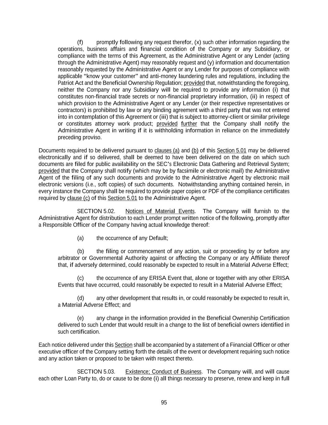 95 (f) promptly following any request therefor, (x) such other information regarding the operations, business affairs and financial condition of the Company or any Subsidiary, or compliance with the terms of this Agreement, as the Administrative Agent or any Lender (acting through the Administrative Agent) may reasonably request and (y) information and documentation reasonably requested by the Administrative Agent or any Lender for purposes of compliance with applicable “know your customer” and anti-money laundering rules and regulations, including the Patriot Act and the Beneficial Ownership Regulation; provided that, notwithstanding the foregoing, neither the Company nor any Subsidiary will be required to provide any information (i) that constitutes non-financial trade secrets or non-financial proprietary information, (ii) in respect of which provision to the Administrative Agent or any Lender (or their respective representatives or contractors) is prohibited by law or any binding agreement with a third party that was not entered into in contemplation of this Agreement or (iii) that is subject to attorney-client or similar privilege or constitutes attorney work product; provided further that the Company shall notify the Administrative Agent in writing if it is withholding information in reliance on the immediately preceding proviso. Documents required to be delivered pursuant to clauses (a) and (b) of this Section 5.01 may be delivered electronically and if so delivered, shall be deemed to have been delivered on the date on which such documents are filed for public availability on the SEC’s Electronic Data Gathering and Retrieval System; provided that the Company shall notify (which may be by facsimile or electronic mail) the Administrative Agent of the filing of any such documents and provide to the Administrative Agent by electronic mail electronic versions (i.e., soft copies) of such documents. Notwithstanding anything contained herein, in every instance the Company shall be required to provide paper copies or PDF of the compliance certificates required by clause (c) of this Section 5.01 to the Administrative Agent. SECTION 5.02. Notices of Material Events. The Company will furnish to the Administrative Agent for distribution to each Lender prompt written notice of the following, promptly after a Responsible Officer of the Company having actual knowledge thereof: (a) the occurrence of any Default; (b) the filing or commencement of any action, suit or proceeding by or before any arbitrator or Governmental Authority against or affecting the Company or any Affiliate thereof that, if adversely determined, could reasonably be expected to result in a Material Adverse Effect; (c) the occurrence of any ERISA Event that, alone or together with any other ERISA Events that have occurred, could reasonably be expected to result in a Material Adverse Effect; (d) any other development that results in, or could reasonably be expected to result in, a Material Adverse Effect; and (e) any change in the information provided in the Beneficial Ownership Certification delivered to such Lender that would result in a change to the list of beneficial owners identified in such certification. Each notice delivered under this Section shall be accompanied by a statement of a Financial Officer or other executive officer of the Company setting forth the details of the event or development requiring such notice and any action taken or proposed to be taken with respect thereto. SECTION 5.03. Existence; Conduct of Business. The Company will, and will cause each other Loan Party to, do or cause to be done (i) all things necessary to preserve, renew and keep in full
