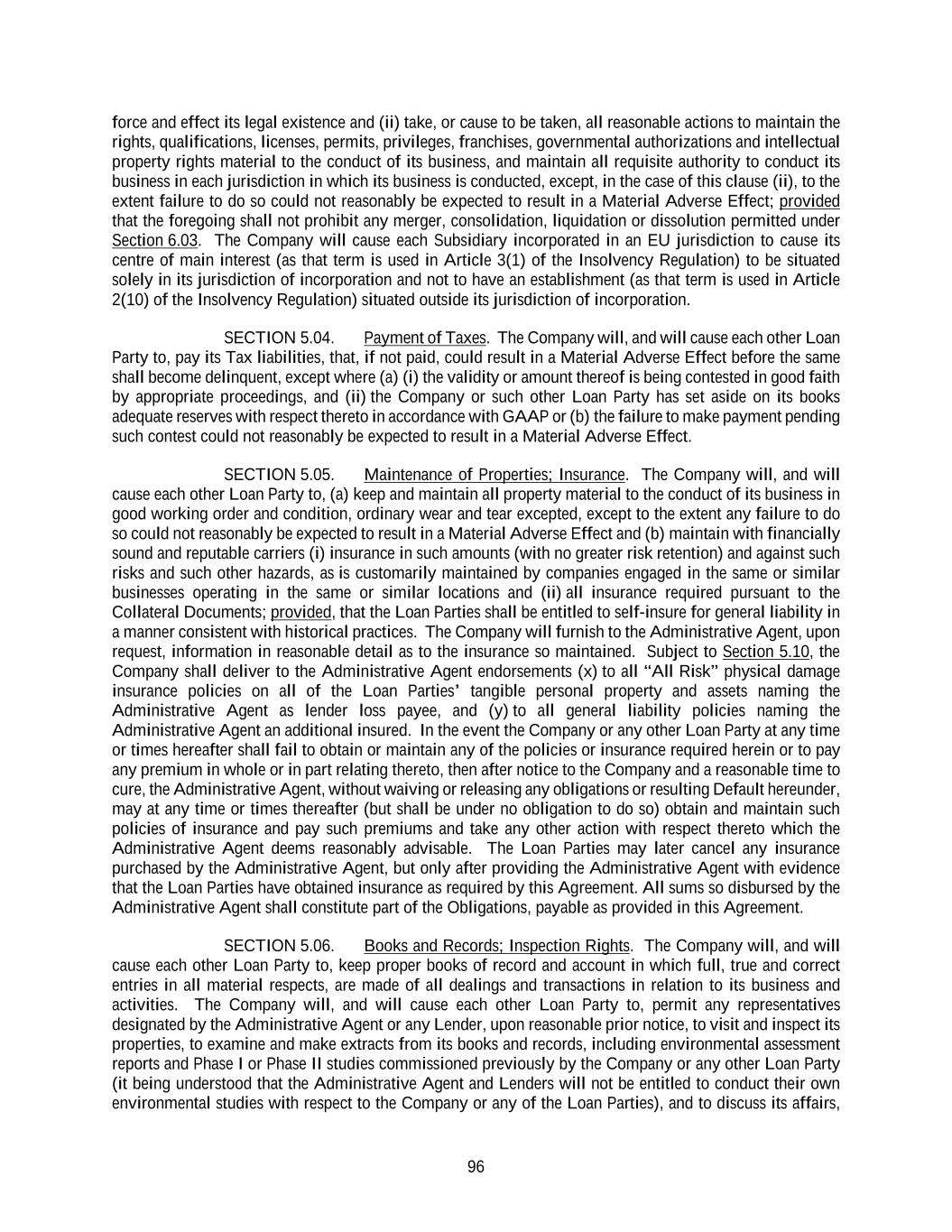 96 force and effect its legal existence and (ii) take, or cause to be taken, all reasonable actions to maintain the rights, qualifications, licenses, permits, privileges, franchises, governmental authorizations and intellectual property rights material to the conduct of its business, and maintain all requisite authority to conduct its business in each jurisdiction in which its business is conducted, except, in the case of this clause (ii), to the extent failure to do so could not reasonably be expected to result in a Material Adverse Effect; provided that the foregoing shall not prohibit any merger, consolidation, liquidation or dissolution permitted under Section 6.03. The Company will cause each Subsidiary incorporated in an EU jurisdiction to cause its centre of main interest (as that term is used in Article 3(1) of the Insolvency Regulation) to be situated solely in its jurisdiction of incorporation and not to have an establishment (as that term is used in Article 2(10) of the Insolvency Regulation) situated outside its jurisdiction of incorporation. SECTION 5.04. Payment of Taxes. The Company will, and will cause each other Loan Party to, pay its Tax liabilities, that, if not paid, could result in a Material Adverse Effect before the same shall become delinquent, except where (a) (i) the validity or amount thereof is being contested in good faith by appropriate proceedings, and (ii) the Company or such other Loan Party has set aside on its books adequate reserves with respect thereto in accordance with GAAP or (b) the failure to make payment pending such contest could not reasonably be expected to result in a Material Adverse Effect. SECTION 5.05. Maintenance of Properties; Insurance. The Company will, and will cause each other Loan Party to, (a) keep and maintain all property material to the conduct of its business in good working order and condition, ordinary wear and tear excepted, except to the extent any failure to do so could not reasonably be expected to result in a Material Adverse Effect and (b) maintain with financially sound and reputable carriers (i) insurance in such amounts (with no greater risk retention) and against such risks and such other hazards, as is customarily maintained by companies engaged in the same or similar businesses operating in the same or similar locations and (ii) all insurance required pursuant to the Collateral Documents; provided, that the Loan Parties shall be entitled to self-insure for general liability in a manner consistent with historical practices. The Company will furnish to the Administrative Agent, upon request, information in reasonable detail as to the insurance so maintained. Subject to Section 5.10, the Company shall deliver to the Administrative Agent endorsements (x) to all “All Risk” physical damage insurance policies on all of the Loan Parties’ tangible personal property and assets naming the Administrative Agent as lender loss payee, and (y) to all general liability policies naming the Administrative Agent an additional insured. In the event the Company or any other Loan Party at any time or times hereafter shall fail to obtain or maintain any of the policies or insurance required herein or to pay any premium in whole or in part relating thereto, then after notice to the Company and a reasonable time to cure, the Administrative Agent, without waiving or releasing any obligations or resulting Default hereunder, may at any time or times thereafter (but shall be under no obligation to do so) obtain and maintain such policies of insurance and pay such premiums and take any other action with respect thereto which the Administrative Agent deems reasonably advisable. The Loan Parties may later cancel any insurance purchased by the Administrative Agent, but only after providing the Administrative Agent with evidence that the Loan Parties have obtained insurance as required by this Agreement. All sums so disbursed by the Administrative Agent shall constitute part of the Obligations, payable as provided in this Agreement. SECTION 5.06. Books and Records; Inspection Rights. The Company will, and will cause each other Loan Party to, keep proper books of record and account in which full, true and correct entries in all material respects, are made of all dealings and transactions in relation to its business and activities. The Company will, and will cause each other Loan Party to, permit any representatives designated by the Administrative Agent or any Lender, upon reasonable prior notice, to visit and inspect its properties, to examine and make extracts from its books and records, including environmental assessment reports and Phase I or Phase II studies commissioned previously by the Company or any other Loan Party (it being understood that the Administrative Agent and Lenders will not be entitled to conduct their own environmental studies with respect to the Company or any of the Loan Parties), and to discuss its affairs,