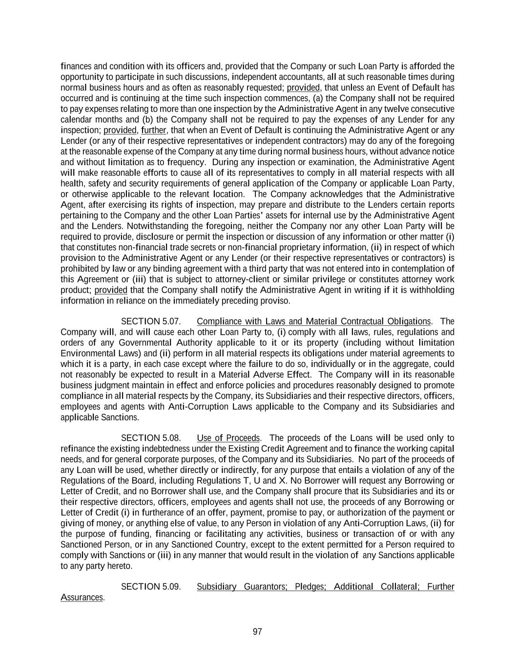 97 finances and condition with its officers and, provided that the Company or such Loan Party is afforded the opportunity to participate in such discussions, independent accountants, all at such reasonable times during normal business hours and as often as reasonably requested; provided, that unless an Event of Default has occurred and is continuing at the time such inspection commences, (a) the Company shall not be required to pay expenses relating to more than one inspection by the Administrative Agent in any twelve consecutive calendar months and (b) the Company shall not be required to pay the expenses of any Lender for any inspection; provided, further, that when an Event of Default is continuing the Administrative Agent or any Lender (or any of their respective representatives or independent contractors) may do any of the foregoing at the reasonable expense of the Company at any time during normal business hours, without advance notice and without limitation as to frequency. During any inspection or examination, the Administrative Agent will make reasonable efforts to cause all of its representatives to comply in all material respects with all health, safety and security requirements of general application of the Company or applicable Loan Party, or otherwise applicable to the relevant location. The Company acknowledges that the Administrative Agent, after exercising its rights of inspection, may prepare and distribute to the Lenders certain reports pertaining to the Company and the other Loan Parties’ assets for internal use by the Administrative Agent and the Lenders. Notwithstanding the foregoing, neither the Company nor any other Loan Party will be required to provide, disclosure or permit the inspection or discussion of any information or other matter (i) that constitutes non-financial trade secrets or non-financial proprietary information, (ii) in respect of which provision to the Administrative Agent or any Lender (or their respective representatives or contractors) is prohibited by law or any binding agreement with a third party that was not entered into in contemplation of this Agreement or (iii) that is subject to attorney-client or similar privilege or constitutes attorney work product; provided that the Company shall notify the Administrative Agent in writing if it is withholding information in reliance on the immediately preceding proviso. SECTION 5.07. Compliance with Laws and Material Contractual Obligations. The Company will, and will cause each other Loan Party to, (i) comply with all laws, rules, regulations and orders of any Governmental Authority applicable to it or its property (including without limitation Environmental Laws) and (ii) perform in all material respects its obligations under material agreements to which it is a party, in each case except where the failure to do so, individually or in the aggregate, could not reasonably be expected to result in a Material Adverse Effect. The Company will in its reasonable business judgment maintain in effect and enforce policies and procedures reasonably designed to promote compliance in all material respects by the Company, its Subsidiaries and their respective directors, officers, employees and agents with Anti-Corruption Laws applicable to the Company and its Subsidiaries and applicable Sanctions. SECTION 5.08. Use of Proceeds. The proceeds of the Loans will be used only to refinance the existing indebtedness under the Existing Credit Agreement and to finance the working capital needs, and for general corporate purposes, of the Company and its Subsidiaries. No part of the proceeds of any Loan will be used, whether directly or indirectly, for any purpose that entails a violation of any of the Regulations of the Board, including Regulations T, U and X. No Borrower will request any Borrowing or Letter of Credit, and no Borrower shall use, and the Company shall procure that its Subsidiaries and its or their respective directors, officers, employees and agents shall not use, the proceeds of any Borrowing or Letter of Credit (i) in furtherance of an offer, payment, promise to pay, or authorization of the payment or giving of money, or anything else of value, to any Person in violation of any Anti-Corruption Laws, (ii) for the purpose of funding, financing or facilitating any activities, business or transaction of or with any Sanctioned Person, or in any Sanctioned Country, except to the extent permitted for a Person required to comply with Sanctions or (iii) in any manner that would result in the violation of any Sanctions applicable to any party hereto. SECTION 5.09. Subsidiary Guarantors; Pledges; Additional Collateral; Further Assurances.
