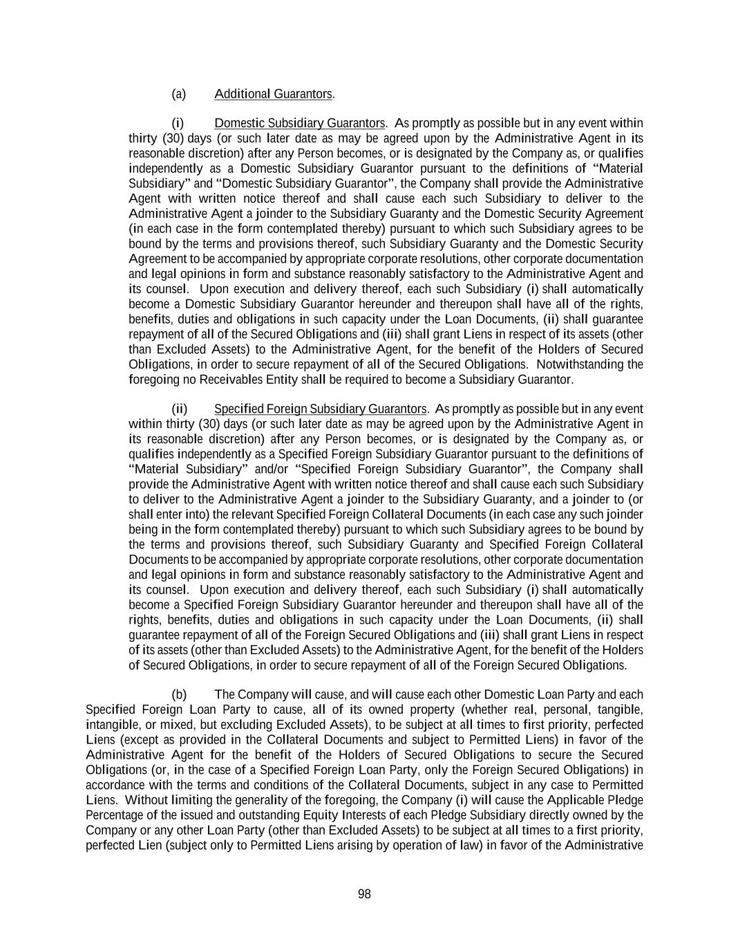 98 (a) Additional Guarantors. (i) Domestic Subsidiary Guarantors. As promptly as possible but in any event within thirty (30) days (or such later date as may be agreed upon by the Administrative Agent in its reasonable discretion) after any Person becomes, or is designated by the Company as, or qualifies independently as a Domestic Subsidiary Guarantor pursuant to the definitions of “Material Subsidiary” and “Domestic Subsidiary Guarantor”, the Company shall provide the Administrative Agent with written notice thereof and shall cause each such Subsidiary to deliver to the Administrative Agent a joinder to the Subsidiary Guaranty and the Domestic Security Agreement (in each case in the form contemplated thereby) pursuant to which such Subsidiary agrees to be bound by the terms and provisions thereof, such Subsidiary Guaranty and the Domestic Security Agreement to be accompanied by appropriate corporate resolutions, other corporate documentation and legal opinions in form and substance reasonably satisfactory to the Administrative Agent and its counsel. Upon execution and delivery thereof, each such Subsidiary (i) shall automatically become a Domestic Subsidiary Guarantor hereunder and thereupon shall have all of the rights, benefits, duties and obligations in such capacity under the Loan Documents, (ii) shall guarantee repayment of all of the Secured Obligations and (iii) shall grant Liens in respect of its assets (other than Excluded Assets) to the Administrative Agent, for the benefit of the Holders of Secured Obligations, in order to secure repayment of all of the Secured Obligations. Notwithstanding the foregoing no Receivables Entity shall be required to become a Subsidiary Guarantor. (ii) Specified Foreign Subsidiary Guarantors. As promptly as possible but in any event within thirty (30) days (or such later date as may be agreed upon by the Administrative Agent in its reasonable discretion) after any Person becomes, or is designated by the Company as, or qualifies independently as a Specified Foreign Subsidiary Guarantor pursuant to the definitions of “Material Subsidiary” and/or “Specified Foreign Subsidiary Guarantor”, the Company shall provide the Administrative Agent with written notice thereof and shall cause each such Subsidiary to deliver to the Administrative Agent a joinder to the Subsidiary Guaranty, and a joinder to (or shall enter into) the relevant Specified Foreign Collateral Documents (in each case any such joinder being in the form contemplated thereby) pursuant to which such Subsidiary agrees to be bound by the terms and provisions thereof, such Subsidiary Guaranty and Specified Foreign Collateral Documents to be accompanied by appropriate corporate resolutions, other corporate documentation and legal opinions in form and substance reasonably satisfactory to the Administrative Agent and its counsel. Upon execution and delivery thereof, each such Subsidiary (i) shall automatically become a Specified Foreign Subsidiary Guarantor hereunder and thereupon shall have all of the rights, benefits, duties and obligations in such capacity under the Loan Documents, (ii) shall guarantee repayment of all of the Foreign Secured Obligations and (iii) shall grant Liens in respect of its assets (other than Excluded Assets) to the Administrative Agent, for the benefit of the Holders of Secured Obligations, in order to secure repayment of all of the Foreign Secured Obligations. (b) The Company will cause, and will cause each other Domestic Loan Party and each Specified Foreign Loan Party to cause, all of its owned property (whether real, personal, tangible, intangible, or mixed, but excluding Excluded Assets), to be subject at all times to first priority, perfected Liens (except as provided in the Collateral Documents and subject to Permitted Liens) in favor of the Administrative Agent for the benefit of the Holders of Secured Obligations to secure the Secured Obligations (or, in the case of a Specified Foreign Loan Party, only the Foreign Secured Obligations) in accordance with the terms and conditions of the Collateral Documents, subject in any case to Permitted Liens. Without limiting the generality of the foregoing, the Company (i) will cause the Applicable Pledge Percentage of the issued and outstanding Equity Interests of each Pledge Subsidiary directly owned by the Company or any other Loan Party (other than Excluded Assets) to be subject at all times to a first priority, perfected Lien (subject only to Permitted Liens arising by operation of law) in favor of the Administrative