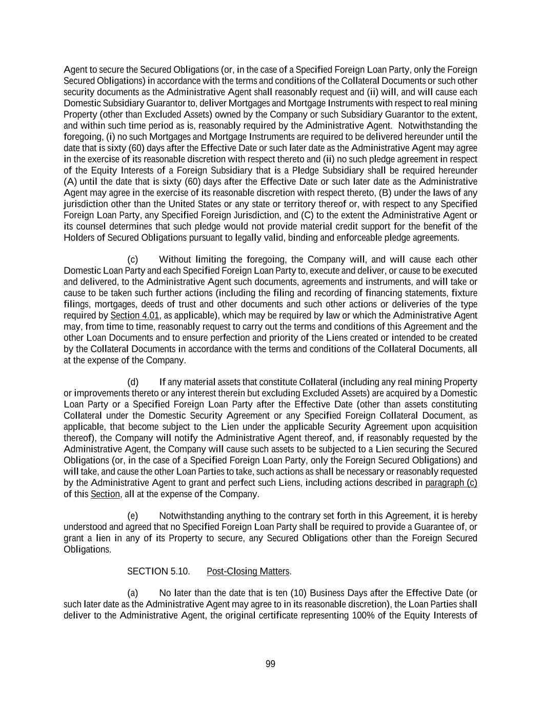 99 Agent to secure the Secured Obligations (or, in the case of a Specified Foreign Loan Party, only the Foreign Secured Obligations) in accordance with the terms and conditions of the Collateral Documents or such other security documents as the Administrative Agent shall reasonably request and (ii) will, and will cause each Domestic Subsidiary Guarantor to, deliver Mortgages and Mortgage Instruments with respect to real mining Property (other than Excluded Assets) owned by the Company or such Subsidiary Guarantor to the extent, and within such time period as is, reasonably required by the Administrative Agent. Notwithstanding the foregoing, (i) no such Mortgages and Mortgage Instruments are required to be delivered hereunder until the date that is sixty (60) days after the Effective Date or such later date as the Administrative Agent may agree in the exercise of its reasonable discretion with respect thereto and (ii) no such pledge agreement in respect of the Equity Interests of a Foreign Subsidiary that is a Pledge Subsidiary shall be required hereunder (A) until the date that is sixty (60) days after the Effective Date or such later date as the Administrative Agent may agree in the exercise of its reasonable discretion with respect thereto, (B) under the laws of any jurisdiction other than the United States or any state or territory thereof or, with respect to any Specified Foreign Loan Party, any Specified Foreign Jurisdiction, and (C) to the extent the Administrative Agent or its counsel determines that such pledge would not provide material credit support for the benefit of the Holders of Secured Obligations pursuant to legally valid, binding and enforceable pledge agreements. (c) Without limiting the foregoing, the Company will, and will cause each other Domestic Loan Party and each Specified Foreign Loan Party to, execute and deliver, or cause to be executed and delivered, to the Administrative Agent such documents, agreements and instruments, and will take or cause to be taken such further actions (including the filing and recording of financing statements, fixture filings, mortgages, deeds of trust and other documents and such other actions or deliveries of the type required by Section 4.01, as applicable), which may be required by law or which the Administrative Agent may, from time to time, reasonably request to carry out the terms and conditions of this Agreement and the other Loan Documents and to ensure perfection and priority of the Liens created or intended to be created by the Collateral Documents in accordance with the terms and conditions of the Collateral Documents, all at the expense of the Company. (d) If any material assets that constitute Collateral (including any real mining Property or improvements thereto or any interest therein but excluding Excluded Assets) are acquired by a Domestic Loan Party or a Specified Foreign Loan Party after the Effective Date (other than assets constituting Collateral under the Domestic Security Agreement or any Specified Foreign Collateral Document, as applicable, that become subject to the Lien under the applicable Security Agreement upon acquisition thereof), the Company will notify the Administrative Agent thereof, and, if reasonably requested by the Administrative Agent, the Company will cause such assets to be subjected to a Lien securing the Secured Obligations (or, in the case of a Specified Foreign Loan Party, only the Foreign Secured Obligations) and will take, and cause the other Loan Parties to take, such actions as shall be necessary or reasonably requested by the Administrative Agent to grant and perfect such Liens, including actions described in paragraph (c) of this Section, all at the expense of the Company. (e) Notwithstanding anything to the contrary set forth in this Agreement, it is hereby understood and agreed that no Specified Foreign Loan Party shall be required to provide a Guarantee of, or grant a lien in any of its Property to secure, any Secured Obligations other than the Foreign Secured Obligations. SECTION 5.10. Post-Closing Matters. (a) No later than the date that is ten (10) Business Days after the Effective Date (or such later date as the Administrative Agent may agree to in its reasonable discretion), the Loan Parties shall deliver to the Administrative Agent, the original certificate representing 100% of the Equity Interests of