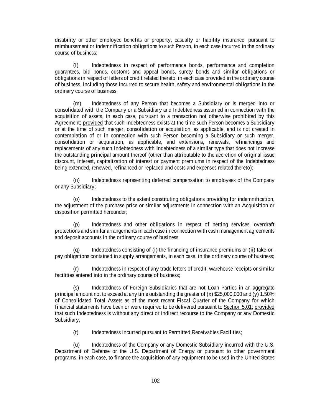 102 disability or other employee benefits or property, casualty or liability insurance, pursuant to reimbursement or indemnification obligations to such Person, in each case incurred in the ordinary course of business; (l) Indebtedness in respect of performance bonds, performance and completion guarantees, bid bonds, customs and appeal bonds, surety bonds and similar obligations or obligations in respect of letters of credit related thereto, in each case provided in the ordinary course of business, including those incurred to secure health, safety and environmental obligations in the ordinary course of business; (m) Indebtedness of any Person that becomes a Subsidiary or is merged into or consolidated with the Company or a Subsidiary and Indebtedness assumed in connection with the acquisition of assets, in each case, pursuant to a transaction not otherwise prohibited by this Agreement; provided that such Indebtedness exists at the time such Person becomes a Subsidiary or at the time of such merger, consolidation or acquisition, as applicable, and is not created in contemplation of or in connection with such Person becoming a Subsidiary or such merger, consolidation or acquisition, as applicable, and extensions, renewals, refinancings and replacements of any such Indebtedness with Indebtedness of a similar type that does not increase the outstanding principal amount thereof (other than attributable to the accretion of original issue discount, interest, capitalization of interest or payment premiums in respect of the Indebtedness being extended, renewed, refinanced or replaced and costs and expenses related thereto); (n) Indebtedness representing deferred compensation to employees of the Company or any Subsidiary; (o) Indebtedness to the extent constituting obligations providing for indemnification, the adjustment of the purchase price or similar adjustments in connection with an Acquisition or disposition permitted hereunder; (p) Indebtedness and other obligations in respect of netting services, overdraft protections and similar arrangements in each case in connection with cash management agreements and deposit accounts in the ordinary course of business; (q) Indebtedness consisting of (i) the financing of insurance premiums or (ii) take-or- pay obligations contained in supply arrangements, in each case, in the ordinary course of business; (r) Indebtedness in respect of any trade letters of credit, warehouse receipts or similar facilities entered into in the ordinary course of business; (s) Indebtedness of Foreign Subsidiaries that are not Loan Parties in an aggregate principal amount not to exceed at any time outstanding the greater of (x) $25,000,000 and (y) 1.50% of Consolidated Total Assets as of the most recent Fiscal Quarter of the Company for which financial statements have been or were required to be delivered pursuant to Section 5.01; provided that such Indebtedness is without any direct or indirect recourse to the Company or any Domestic Subsidiary; (t) Indebtedness incurred pursuant to Permitted Receivables Facilities; (u) Indebtedness of the Company or any Domestic Subsidiary incurred with the U.S. Department of Defense or the U.S. Department of Energy or pursuant to other government programs, in each case, to finance the acquisition of any equipment to be used in the United States
