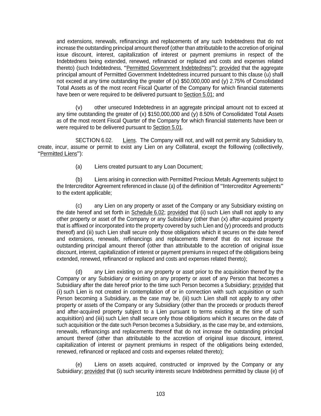 103 and extensions, renewals, refinancings and replacements of any such Indebtedness that do not increase the outstanding principal amount thereof (other than attributable to the accretion of original issue discount, interest, capitalization of interest or payment premiums in respect of the Indebtedness being extended, renewed, refinanced or replaced and costs and expenses related thereto) (such Indebtedness, “Permitted Government Indebtedness”); provided that the aggregate principal amount of Permitted Government Indebtedness incurred pursuant to this clause (u) shall not exceed at any time outstanding the greater of (x) $50,000,000 and (y) 2.75% of Consolidated Total Assets as of the most recent Fiscal Quarter of the Company for which financial statements have been or were required to be delivered pursuant to Section 5.01; and (v) other unsecured Indebtedness in an aggregate principal amount not to exceed at any time outstanding the greater of (x) $150,000,000 and (y) 8.50% of Consolidated Total Assets as of the most recent Fiscal Quarter of the Company for which financial statements have been or were required to be delivered pursuant to Section 5.01. SECTION 6.02. Liens. The Company will not, and will not permit any Subsidiary to, create, incur, assume or permit to exist any Lien on any Collateral, except the following (collectively, “Permitted Liens”): (a) Liens created pursuant to any Loan Document; (b) Liens arising in connection with Permitted Precious Metals Agreements subject to the Intercreditor Agreement referenced in clause (a) of the definition of “Intercreditor Agreements” to the extent applicable; (c) any Lien on any property or asset of the Company or any Subsidiary existing on the date hereof and set forth in Schedule 6.02; provided that (i) such Lien shall not apply to any other property or asset of the Company or any Subsidiary (other than (x) after-acquired property that is affixed or incorporated into the property covered by such Lien and (y) proceeds and products thereof) and (ii) such Lien shall secure only those obligations which it secures on the date hereof and extensions, renewals, refinancings and replacements thereof that do not increase the outstanding principal amount thereof (other than attributable to the accretion of original issue discount, interest, capitalization of interest or payment premiums in respect of the obligations being extended, renewed, refinanced or replaced and costs and expenses related thereto); (d) any Lien existing on any property or asset prior to the acquisition thereof by the Company or any Subsidiary or existing on any property or asset of any Person that becomes a Subsidiary after the date hereof prior to the time such Person becomes a Subsidiary; provided that (i) such Lien is not created in contemplation of or in connection with such acquisition or such Person becoming a Subsidiary, as the case may be, (ii) such Lien shall not apply to any other property or assets of the Company or any Subsidiary (other than the proceeds or products thereof and after-acquired property subject to a Lien pursuant to terms existing at the time of such acquisition) and (iii) such Lien shall secure only those obligations which it secures on the date of such acquisition or the date such Person becomes a Subsidiary, as the case may be, and extensions, renewals, refinancings and replacements thereof that do not increase the outstanding principal amount thereof (other than attributable to the accretion of original issue discount, interest, capitalization of interest or payment premiums in respect of the obligations being extended, renewed, refinanced or replaced and costs and expenses related thereto); (e) Liens on assets acquired, constructed or improved by the Company or any Subsidiary; provided that (i) such security interests secure Indebtedness permitted by clause (e) of