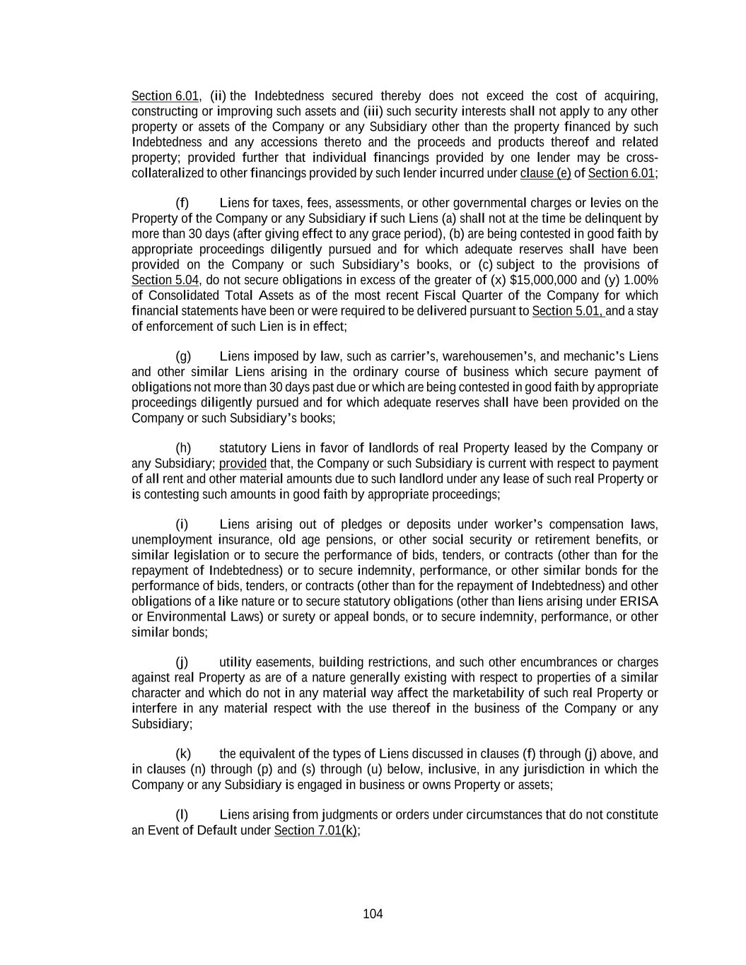 104 Section 6.01, (ii) the Indebtedness secured thereby does not exceed the cost of acquiring, constructing or improving such assets and (iii) such security interests shall not apply to any other property or assets of the Company or any Subsidiary other than the property financed by such Indebtedness and any accessions thereto and the proceeds and products thereof and related property; provided further that individual financings provided by one lender may be cross- collateralized to other financings provided by such lender incurred under clause (e) of Section 6.01; (f) Liens for taxes, fees, assessments, or other governmental charges or levies on the Property of the Company or any Subsidiary if such Liens (a) shall not at the time be delinquent by more than 30 days (after giving effect to any grace period), (b) are being contested in good faith by appropriate proceedings diligently pursued and for which adequate reserves shall have been provided on the Company or such Subsidiary’s books, or (c) subject to the provisions of Section 5.04, do not secure obligations in excess of the greater of (x) $15,000,000 and (y) 1.00% of Consolidated Total Assets as of the most recent Fiscal Quarter of the Company for which financial statements have been or were required to be delivered pursuant to Section 5.01, and a stay of enforcement of such Lien is in effect; (g) Liens imposed by law, such as carrier’s, warehousemen’s, and mechanic’s Liens and other similar Liens arising in the ordinary course of business which secure payment of obligations not more than 30 days past due or which are being contested in good faith by appropriate proceedings diligently pursued and for which adequate reserves shall have been provided on the Company or such Subsidiary’s books; (h) statutory Liens in favor of landlords of real Property leased by the Company or any Subsidiary; provided that, the Company or such Subsidiary is current with respect to payment of all rent and other material amounts due to such landlord under any lease of such real Property or is contesting such amounts in good faith by appropriate proceedings; (i) Liens arising out of pledges or deposits under worker’s compensation laws, unemployment insurance, old age pensions, or other social security or retirement benefits, or similar legislation or to secure the performance of bids, tenders, or contracts (other than for the repayment of Indebtedness) or to secure indemnity, performance, or other similar bonds for the performance of bids, tenders, or contracts (other than for the repayment of Indebtedness) and other obligations of a like nature or to secure statutory obligations (other than liens arising under ERISA or Environmental Laws) or surety or appeal bonds, or to secure indemnity, performance, or other similar bonds; (j) utility easements, building restrictions, and such other encumbrances or charges against real Property as are of a nature generally existing with respect to properties of a similar character and which do not in any material way affect the marketability of such real Property or interfere in any material respect with the use thereof in the business of the Company or any Subsidiary; (k) the equivalent of the types of Liens discussed in clauses (f) through (j) above, and in clauses (n) through (p) and (s) through (u) below, inclusive, in any jurisdiction in which the Company or any Subsidiary is engaged in business or owns Property or assets; (l) Liens arising from judgments or orders under circumstances that do not constitute an Event of Default under Section 7.01(k);