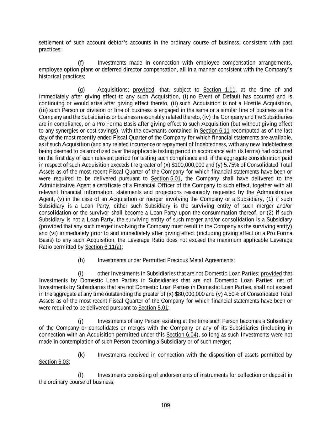 109 settlement of such account debtor’s accounts in the ordinary course of business, consistent with past practices; (f) Investments made in connection with employee compensation arrangements, employee option plans or deferred director compensation, all in a manner consistent with the Company’s historical practices; (g) Acquisitions; provided, that, subject to Section 1.11, at the time of and immediately after giving effect to any such Acquisition, (i) no Event of Default has occurred and is continuing or would arise after giving effect thereto, (ii) such Acquisition is not a Hostile Acquisition, (iii) such Person or division or line of business is engaged in the same or a similar line of business as the Company and the Subsidiaries or business reasonably related thereto, (iv) the Company and the Subsidiaries are in compliance, on a Pro Forma Basis after giving effect to such Acquisition (but without giving effect to any synergies or cost savings), with the covenants contained in Section 6.11 recomputed as of the last day of the most recently ended Fiscal Quarter of the Company for which financial statements are available, as if such Acquisition (and any related incurrence or repayment of Indebtedness, with any new Indebtedness being deemed to be amortized over the applicable testing period in accordance with its terms) had occurred on the first day of each relevant period for testing such compliance and, if the aggregate consideration paid in respect of such Acquisition exceeds the greater of (x) $100,000,000 and (y) 5.75% of Consolidated Total Assets as of the most recent Fiscal Quarter of the Company for which financial statements have been or were required to be delivered pursuant to Section 5.01, the Company shall have delivered to the Administrative Agent a certificate of a Financial Officer of the Company to such effect, together with all relevant financial information, statements and projections reasonably requested by the Administrative Agent, (v) in the case of an Acquisition or merger involving the Company or a Subsidiary, (1) if such Subsidiary is a Loan Party, either such Subsidiary is the surviving entity of such merger and/or consolidation or the survivor shall become a Loan Party upon the consummation thereof, or (2) if such Subsidiary is not a Loan Party, the surviving entity of such merger and/or consolidation is a Subsidiary (provided that any such merger involving the Company must result in the Company as the surviving entity) and (vi) immediately prior to and immediately after giving effect (including giving effect on a Pro Forma Basis) to any such Acquisition, the Leverage Ratio does not exceed the maximum applicable Leverage Ratio permitted by Section 6.11(a); (h) Investments under Permitted Precious Metal Agreements; (i) other Investments in Subsidiaries that are not Domestic Loan Parties; provided that Investments by Domestic Loan Parties in Subsidiaries that are not Domestic Loan Parties, net of Investments by Subsidiaries that are not Domestic Loan Parties in Domestic Loan Parties, shall not exceed in the aggregate at any time outstanding the greater of (x) $80,000,000 and (y) 4.50% of Consolidated Total Assets as of the most recent Fiscal Quarter of the Company for which financial statements have been or were required to be delivered pursuant to Section 5.01; (j) Investments of any Person existing at the time such Person becomes a Subsidiary of the Company or consolidates or merges with the Company or any of its Subsidiaries (including in connection with an Acquisition permitted under this Section 6.04), so long as such Investments were not made in contemplation of such Person becoming a Subsidiary or of such merger; (k) Investments received in connection with the disposition of assets permitted by Section 6.03; (l) Investments consisting of endorsements of instruments for collection or deposit in the ordinary course of business;