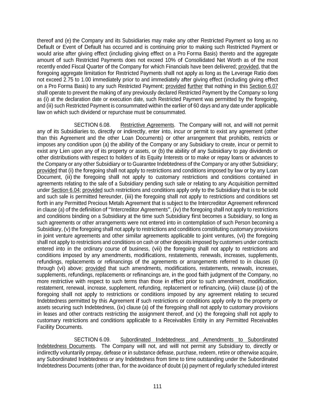 111 thereof and (e) the Company and its Subsidiaries may make any other Restricted Payment so long as no Default or Event of Default has occurred and is continuing prior to making such Restricted Payment or would arise after giving effect (including giving effect on a Pro Forma Basis) thereto and the aggregate amount of such Restricted Payments does not exceed 10% of Consolidated Net Worth as of the most recently ended Fiscal Quarter of the Company for which Financials have been delivered; provided, that the foregoing aggregate limitation for Restricted Payments shall not apply as long as the Leverage Ratio does not exceed 2.75 to 1.00 immediately prior to and immediately after giving effect (including giving effect on a Pro Forma Basis) to any such Restricted Payment; provided further that nothing in this Section 6.07 shall operate to prevent the making of any previously declared Restricted Payment by the Company so long as (i) at the declaration date or execution date, such Restricted Payment was permitted by the foregoing, and (ii) such Restricted Payment is consummated within the earlier of 60 days and any date under applicable law on which such dividend or repurchase must be consummated. SECTION 6.08. Restrictive Agreements. The Company will not, and will not permit any of its Subsidiaries to, directly or indirectly, enter into, incur or permit to exist any agreement (other than this Agreement and the other Loan Documents) or other arrangement that prohibits, restricts or imposes any condition upon (a) the ability of the Company or any Subsidiary to create, incur or permit to exist any Lien upon any of its property or assets, or (b) the ability of any Subsidiary to pay dividends or other distributions with respect to holders of its Equity Interests or to make or repay loans or advances to the Company or any other Subsidiary or to Guarantee Indebtedness of the Company or any other Subsidiary; provided that (i) the foregoing shall not apply to restrictions and conditions imposed by law or by any Loan Document, (ii) the foregoing shall not apply to customary restrictions and conditions contained in agreements relating to the sale of a Subsidiary pending such sale or relating to any Acquisition permitted under Section 6.04; provided such restrictions and conditions apply only to the Subsidiary that is to be sold and such sale is permitted hereunder, (iii) the foregoing shall not apply to restrictions and conditions set forth in any Permitted Precious Metals Agreement that is subject to the Intercreditor Agreement referenced in clause (a) of the definition of “Intercreditor Agreements”, (iv) the foregoing shall not apply to restrictions and conditions binding on a Subsidiary at the time such Subsidiary first becomes a Subsidiary, so long as such agreements or other arrangements were not entered into in contemplation of such Person becoming a Subsidiary, (v) the foregoing shall not apply to restrictions and conditions constituting customary provisions in joint venture agreements and other similar agreements applicable to joint ventures, (vi) the foregoing shall not apply to restrictions and conditions on cash or other deposits imposed by customers under contracts entered into in the ordinary course of business, (vii) the foregoing shall not apply to restrictions and conditions imposed by any amendments, modifications, restatements, renewals, increases, supplements, refundings, replacements or refinancings of the agreements or arrangements referred to in clauses (i) through (vi) above; provided that such amendments, modifications, restatements, renewals, increases, supplements, refundings, replacements or refinancings are, in the good faith judgment of the Company, no more restrictive with respect to such terms than those in effect prior to such amendment, modification, restatement, renewal, increase, supplement, refunding, replacement or refinancing, (viii) clause (a) of the foregoing shall not apply to restrictions or conditions imposed by any agreement relating to secured Indebtedness permitted by this Agreement if such restrictions or conditions apply only to the property or assets securing such Indebtedness, (ix) clause (a) of the foregoing shall not apply to customary provisions in leases and other contracts restricting the assignment thereof, and (x) the foregoing shall not apply to customary restrictions and conditions applicable to a Receivables Entity in any Permitted Receivables Facility Documents. SECTION 6.09. Subordinated Indebtedness and Amendments to Subordinated Indebtedness Documents. The Company will not, and will not permit any Subsidiary to, directly or indirectly voluntarily prepay, defease or in substance defease, purchase, redeem, retire or otherwise acquire, any Subordinated Indebtedness or any Indebtedness from time to time outstanding under the Subordinated Indebtedness Documents (other than, for the avoidance of doubt (a) payment of regularly scheduled interest