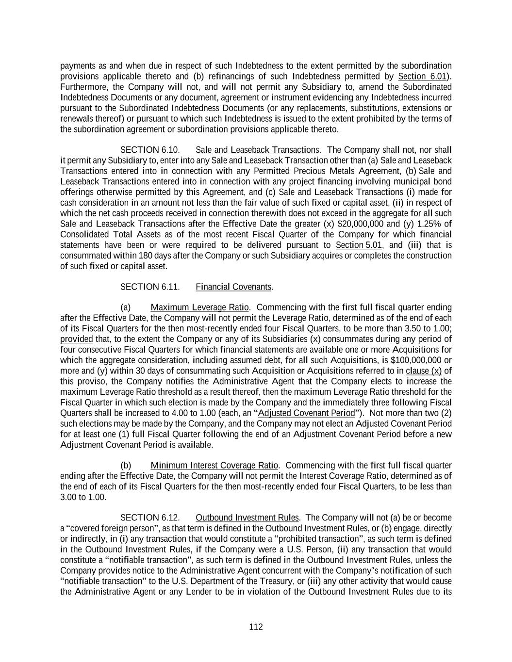 112 payments as and when due in respect of such Indebtedness to the extent permitted by the subordination provisions applicable thereto and (b) refinancings of such Indebtedness permitted by Section 6.01). Furthermore, the Company will not, and will not permit any Subsidiary to, amend the Subordinated Indebtedness Documents or any document, agreement or instrument evidencing any Indebtedness incurred pursuant to the Subordinated Indebtedness Documents (or any replacements, substitutions, extensions or renewals thereof) or pursuant to which such Indebtedness is issued to the extent prohibited by the terms of the subordination agreement or subordination provisions applicable thereto. SECTION 6.10. Sale and Leaseback Transactions. The Company shall not, nor shall it permit any Subsidiary to, enter into any Sale and Leaseback Transaction other than (a) Sale and Leaseback Transactions entered into in connection with any Permitted Precious Metals Agreement, (b) Sale and Leaseback Transactions entered into in connection with any project financing involving municipal bond offerings otherwise permitted by this Agreement, and (c) Sale and Leaseback Transactions (i) made for cash consideration in an amount not less than the fair value of such fixed or capital asset, (ii) in respect of which the net cash proceeds received in connection therewith does not exceed in the aggregate for all such Sale and Leaseback Transactions after the Effective Date the greater (x) $20,000,000 and (y) 1.25% of Consolidated Total Assets as of the most recent Fiscal Quarter of the Company for which financial statements have been or were required to be delivered pursuant to Section 5.01, and (iii) that is consummated within 180 days after the Company or such Subsidiary acquires or completes the construction of such fixed or capital asset. SECTION 6.11. Financial Covenants. (a) Maximum Leverage Ratio. Commencing with the first full fiscal quarter ending after the Effective Date, the Company will not permit the Leverage Ratio, determined as of the end of each of its Fiscal Quarters for the then most-recently ended four Fiscal Quarters, to be more than 3.50 to 1.00; provided that, to the extent the Company or any of its Subsidiaries (x) consummates during any period of four consecutive Fiscal Quarters for which financial statements are available one or more Acquisitions for which the aggregate consideration, including assumed debt, for all such Acquisitions, is $100,000,000 or more and (y) within 30 days of consummating such Acquisition or Acquisitions referred to in clause (x) of this proviso, the Company notifies the Administrative Agent that the Company elects to increase the maximum Leverage Ratio threshold as a result thereof, then the maximum Leverage Ratio threshold for the Fiscal Quarter in which such election is made by the Company and the immediately three following Fiscal Quarters shall be increased to 4.00 to 1.00 (each, an “Adjusted Covenant Period”). Not more than two (2) such elections may be made by the Company, and the Company may not elect an Adjusted Covenant Period for at least one (1) full Fiscal Quarter following the end of an Adjustment Covenant Period before a new Adjustment Covenant Period is available. (b) Minimum Interest Coverage Ratio. Commencing with the first full fiscal quarter ending after the Effective Date, the Company will not permit the Interest Coverage Ratio, determined as of the end of each of its Fiscal Quarters for the then most-recently ended four Fiscal Quarters, to be less than 3.00 to 1.00. SECTION 6.12. Outbound Investment Rules. The Company will not (a) be or become a “covered foreign person”, as that term is defined in the Outbound Investment Rules, or (b) engage, directly or indirectly, in (i) any transaction that would constitute a “prohibited transaction”, as such term is defined in the Outbound Investment Rules, if the Company were a U.S. Person, (ii) any transaction that would constitute a “notifiable transaction”, as such term is defined in the Outbound Investment Rules, unless the Company provides notice to the Administrative Agent concurrent with the Company’s notification of such “notifiable transaction” to the U.S. Department of the Treasury, or (iii) any other activity that would cause the Administrative Agent or any Lender to be in violation of the Outbound Investment Rules due to its
