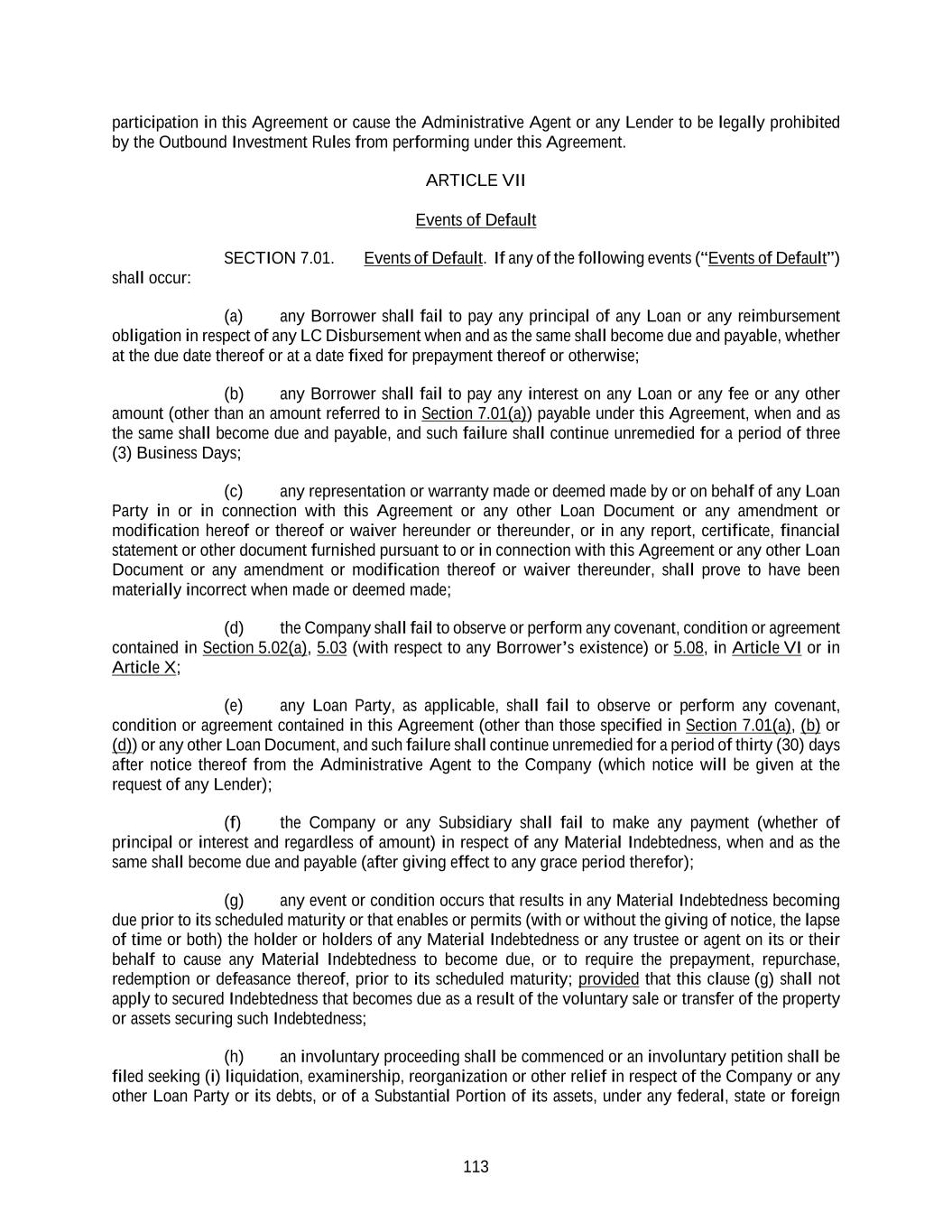 113 participation in this Agreement or cause the Administrative Agent or any Lender to be legally prohibited by the Outbound Investment Rules from performing under this Agreement. ARTICLE VII Events of Default SECTION 7.01. Events of Default. If any of the following events (“Events of Default”) shall occur: (a) any Borrower shall fail to pay any principal of any Loan or any reimbursement obligation in respect of any LC Disbursement when and as the same shall become due and payable, whether at the due date thereof or at a date fixed for prepayment thereof or otherwise; (b) any Borrower shall fail to pay any interest on any Loan or any fee or any other amount (other than an amount referred to in Section 7.01(a)) payable under this Agreement, when and as the same shall become due and payable, and such failure shall continue unremedied for a period of three (3) Business Days; (c) any representation or warranty made or deemed made by or on behalf of any Loan Party in or in connection with this Agreement or any other Loan Document or any amendment or modification hereof or thereof or waiver hereunder or thereunder, or in any report, certificate, financial statement or other document furnished pursuant to or in connection with this Agreement or any other Loan Document or any amendment or modification thereof or waiver thereunder, shall prove to have been materially incorrect when made or deemed made; (d) the Company shall fail to observe or perform any covenant, condition or agreement contained in Section 5.02(a), 5.03 (with respect to any Borrower’s existence) or 5.08, in Article VI or in Article X; (e) any Loan Party, as applicable, shall fail to observe or perform any covenant, condition or agreement contained in this Agreement (other than those specified in Section 7.01(a), (b) or (d)) or any other Loan Document, and such failure shall continue unremedied for a period of thirty (30) days after notice thereof from the Administrative Agent to the Company (which notice will be given at the request of any Lender); (f) the Company or any Subsidiary shall fail to make any payment (whether of principal or interest and regardless of amount) in respect of any Material Indebtedness, when and as the same shall become due and payable (after giving effect to any grace period therefor); (g) any event or condition occurs that results in any Material Indebtedness becoming due prior to its scheduled maturity or that enables or permits (with or without the giving of notice, the lapse of time or both) the holder or holders of any Material Indebtedness or any trustee or agent on its or their behalf to cause any Material Indebtedness to become due, or to require the prepayment, repurchase, redemption or defeasance thereof, prior to its scheduled maturity; provided that this clause (g) shall not apply to secured Indebtedness that becomes due as a result of the voluntary sale or transfer of the property or assets securing such Indebtedness; (h) an involuntary proceeding shall be commenced or an involuntary petition shall be filed seeking (i) liquidation, examinership, reorganization or other relief in respect of the Company or any other Loan Party or its debts, or of a Substantial Portion of its assets, under any federal, state or foreign
