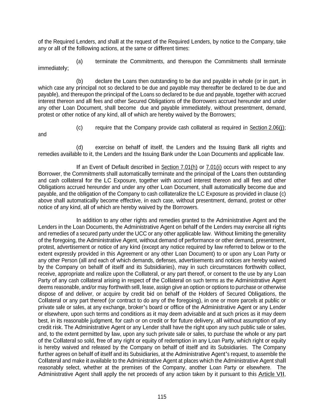 115 of the Required Lenders, and shall at the request of the Required Lenders, by notice to the Company, take any or all of the following actions, at the same or different times: (a) terminate the Commitments, and thereupon the Commitments shall terminate immediately; (b) declare the Loans then outstanding to be due and payable in whole (or in part, in which case any principal not so declared to be due and payable may thereafter be declared to be due and payable), and thereupon the principal of the Loans so declared to be due and payable, together with accrued interest thereon and all fees and other Secured Obligations of the Borrowers accrued hereunder and under any other Loan Document, shall become due and payable immediately, without presentment, demand, protest or other notice of any kind, all of which are hereby waived by the Borrowers; (c) require that the Company provide cash collateral as required in Section 2.06(j); and (d) exercise on behalf of itself, the Lenders and the Issuing Bank all rights and remedies available to it, the Lenders and the Issuing Bank under the Loan Documents and applicable law. If an Event of Default described in Section 7.01(h) or 7.01(i) occurs with respect to any Borrower, the Commitments shall automatically terminate and the principal of the Loans then outstanding and cash collateral for the LC Exposure, together with accrued interest thereon and all fees and other Obligations accrued hereunder and under any other Loan Document, shall automatically become due and payable, and the obligation of the Company to cash collateralize the LC Exposure as provided in clause (c) above shall automatically become effective, in each case, without presentment, demand, protest or other notice of any kind, all of which are hereby waived by the Borrowers. In addition to any other rights and remedies granted to the Administrative Agent and the Lenders in the Loan Documents, the Administrative Agent on behalf of the Lenders may exercise all rights and remedies of a secured party under the UCC or any other applicable law. Without limiting the generality of the foregoing, the Administrative Agent, without demand of performance or other demand, presentment, protest, advertisement or notice of any kind (except any notice required by law referred to below or to the extent expressly provided in this Agreement or any other Loan Document) to or upon any Loan Party or any other Person (all and each of which demands, defenses, advertisements and notices are hereby waived by the Company on behalf of itself and its Subsidiaries), may in such circumstances forthwith collect, receive, appropriate and realize upon the Collateral, or any part thereof, or consent to the use by any Loan Party of any cash collateral arising in respect of the Collateral on such terms as the Administrative Agent deems reasonable, and/or may forthwith sell, lease, assign give an option or options to purchase or otherwise dispose of and deliver, or acquire by credit bid on behalf of the Holders of Secured Obligations, the Collateral or any part thereof (or contract to do any of the foregoing), in one or more parcels at public or private sale or sales, at any exchange, broker’s board or office of the Administrative Agent or any Lender or elsewhere, upon such terms and conditions as it may deem advisable and at such prices as it may deem best, in its reasonable judgment, for cash or on credit or for future delivery, all without assumption of any credit risk. The Administrative Agent or any Lender shall have the right upon any such public sale or sales, and, to the extent permitted by law, upon any such private sale or sales, to purchase the whole or any part of the Collateral so sold, free of any right or equity of redemption in any Loan Party, which right or equity is hereby waived and released by the Company on behalf of itself and its Subsidiaries. The Company further agrees on behalf of itself and its Subsidiaries, at the Administrative Agent’s request, to assemble the Collateral and make it available to the Administrative Agent at places which the Administrative Agent shall reasonably select, whether at the premises of the Company, another Loan Party or elsewhere. The Administrative Agent shall apply the net proceeds of any action taken by it pursuant to this Article VII,