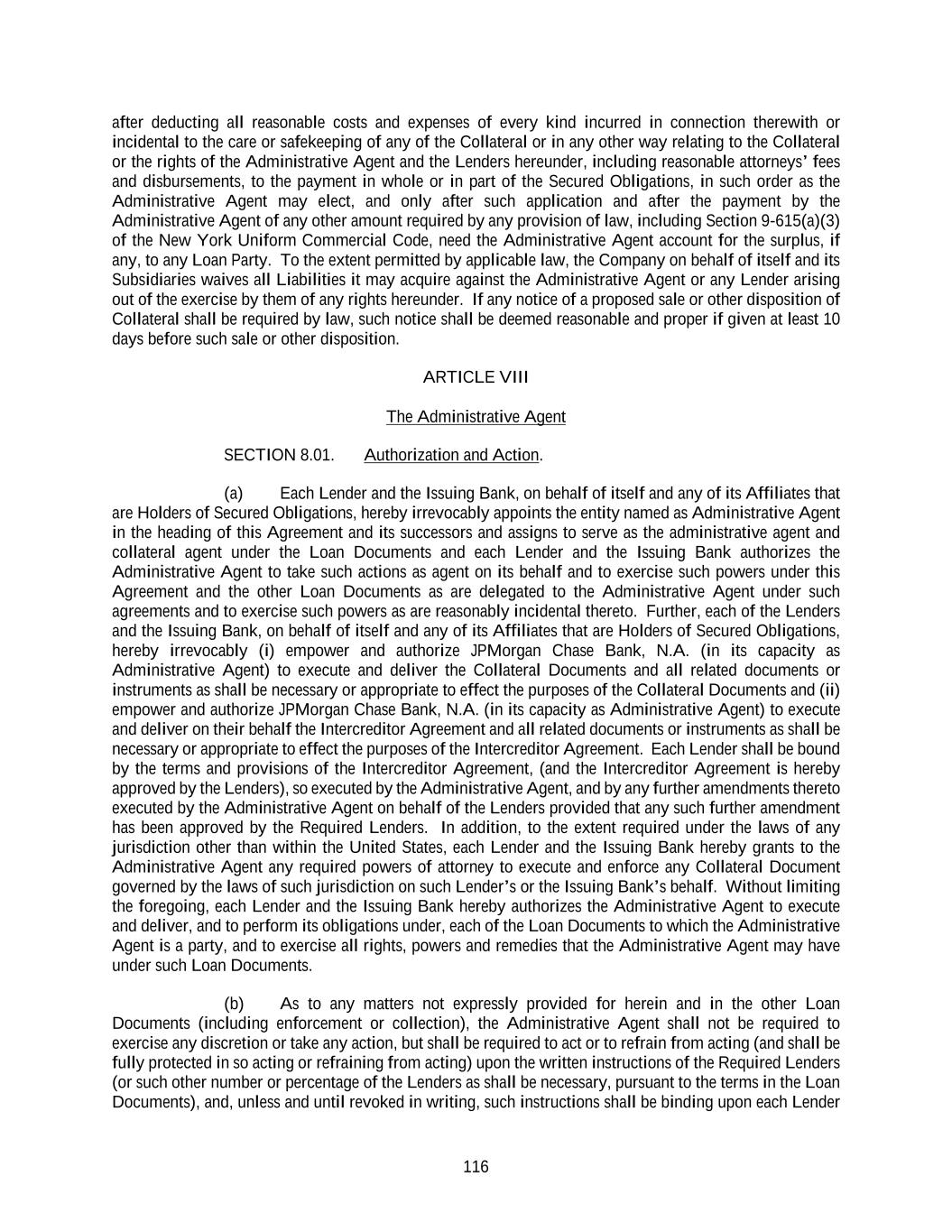 116 after deducting all reasonable costs and expenses of every kind incurred in connection therewith or incidental to the care or safekeeping of any of the Collateral or in any other way relating to the Collateral or the rights of the Administrative Agent and the Lenders hereunder, including reasonable attorneys’ fees and disbursements, to the payment in whole or in part of the Secured Obligations, in such order as the Administrative Agent may elect, and only after such application and after the payment by the Administrative Agent of any other amount required by any provision of law, including Section 9-615(a)(3) of the New York Uniform Commercial Code, need the Administrative Agent account for the surplus, if any, to any Loan Party. To the extent permitted by applicable law, the Company on behalf of itself and its Subsidiaries waives all Liabilities it may acquire against the Administrative Agent or any Lender arising out of the exercise by them of any rights hereunder. If any notice of a proposed sale or other disposition of Collateral shall be required by law, such notice shall be deemed reasonable and proper if given at least 10 days before such sale or other disposition. ARTICLE VIII The Administrative Agent SECTION 8.01. Authorization and Action. (a) Each Lender and the Issuing Bank, on behalf of itself and any of its Affiliates that are Holders of Secured Obligations, hereby irrevocably appoints the entity named as Administrative Agent in the heading of this Agreement and its successors and assigns to serve as the administrative agent and collateral agent under the Loan Documents and each Lender and the Issuing Bank authorizes the Administrative Agent to take such actions as agent on its behalf and to exercise such powers under this Agreement and the other Loan Documents as are delegated to the Administrative Agent under such agreements and to exercise such powers as are reasonably incidental thereto. Further, each of the Lenders and the Issuing Bank, on behalf of itself and any of its Affiliates that are Holders of Secured Obligations, hereby irrevocably (i) empower and authorize JPMorgan Chase Bank, N.A. (in its capacity as Administrative Agent) to execute and deliver the Collateral Documents and all related documents or instruments as shall be necessary or appropriate to effect the purposes of the Collateral Documents and (ii) empower and authorize JPMorgan Chase Bank, N.A. (in its capacity as Administrative Agent) to execute and deliver on their behalf the Intercreditor Agreement and all related documents or instruments as shall be necessary or appropriate to effect the purposes of the Intercreditor Agreement. Each Lender shall be bound by the terms and provisions of the Intercreditor Agreement, (and the Intercreditor Agreement is hereby approved by the Lenders), so executed by the Administrative Agent, and by any further amendments thereto executed by the Administrative Agent on behalf of the Lenders provided that any such further amendment has been approved by the Required Lenders. In addition, to the extent required under the laws of any jurisdiction other than within the United States, each Lender and the Issuing Bank hereby grants to the Administrative Agent any required powers of attorney to execute and enforce any Collateral Document governed by the laws of such jurisdiction on such Lender’s or the Issuing Bank’s behalf. Without limiting the foregoing, each Lender and the Issuing Bank hereby authorizes the Administrative Agent to execute and deliver, and to perform its obligations under, each of the Loan Documents to which the Administrative Agent is a party, and to exercise all rights, powers and remedies that the Administrative Agent may have under such Loan Documents. (b) As to any matters not expressly provided for herein and in the other Loan Documents (including enforcement or collection), the Administrative Agent shall not be required to exercise any discretion or take any action, but shall be required to act or to refrain from acting (and shall be fully protected in so acting or refraining from acting) upon the written instructions of the Required Lenders (or such other number or percentage of the Lenders as shall be necessary, pursuant to the terms in the Loan Documents), and, unless and until revoked in writing, such instructions shall be binding upon each Lender