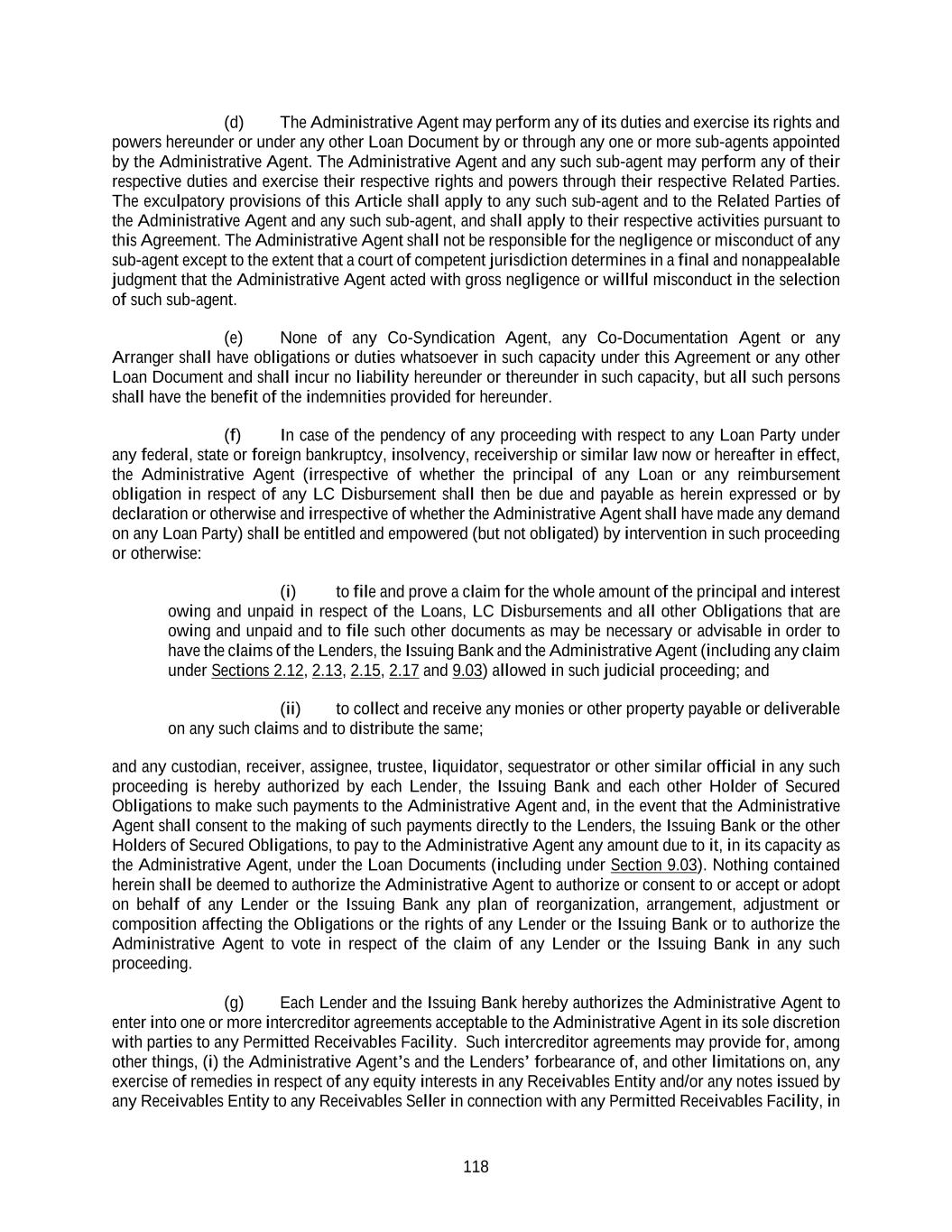 118 (d) The Administrative Agent may perform any of its duties and exercise its rights and powers hereunder or under any other Loan Document by or through any one or more sub-agents appointed by the Administrative Agent. The Administrative Agent and any such sub-agent may perform any of their respective duties and exercise their respective rights and powers through their respective Related Parties. The exculpatory provisions of this Article shall apply to any such sub-agent and to the Related Parties of the Administrative Agent and any such sub-agent, and shall apply to their respective activities pursuant to this Agreement. The Administrative Agent shall not be responsible for the negligence or misconduct of any sub-agent except to the extent that a court of competent jurisdiction determines in a final and nonappealable judgment that the Administrative Agent acted with gross negligence or willful misconduct in the selection of such sub-agent. (e) None of any Co-Syndication Agent, any Co-Documentation Agent or any Arranger shall have obligations or duties whatsoever in such capacity under this Agreement or any other Loan Document and shall incur no liability hereunder or thereunder in such capacity, but all such persons shall have the benefit of the indemnities provided for hereunder. (f) In case of the pendency of any proceeding with respect to any Loan Party under any federal, state or foreign bankruptcy, insolvency, receivership or similar law now or hereafter in effect, the Administrative Agent (irrespective of whether the principal of any Loan or any reimbursement obligation in respect of any LC Disbursement shall then be due and payable as herein expressed or by declaration or otherwise and irrespective of whether the Administrative Agent shall have made any demand on any Loan Party) shall be entitled and empowered (but not obligated) by intervention in such proceeding or otherwise: (i) to file and prove a claim for the whole amount of the principal and interest owing and unpaid in respect of the Loans, LC Disbursements and all other Obligations that are owing and unpaid and to file such other documents as may be necessary or advisable in order to have the claims of the Lenders, the Issuing Bank and the Administrative Agent (including any claim under Sections 2.12, 2.13, 2.15, 2.17 and 9.03) allowed in such judicial proceeding; and (ii) to collect and receive any monies or other property payable or deliverable on any such claims and to distribute the same; and any custodian, receiver, assignee, trustee, liquidator, sequestrator or other similar official in any such proceeding is hereby authorized by each Lender, the Issuing Bank and each other Holder of Secured Obligations to make such payments to the Administrative Agent and, in the event that the Administrative Agent shall consent to the making of such payments directly to the Lenders, the Issuing Bank or the other Holders of Secured Obligations, to pay to the Administrative Agent any amount due to it, in its capacity as the Administrative Agent, under the Loan Documents (including under Section 9.03). Nothing contained herein shall be deemed to authorize the Administrative Agent to authorize or consent to or accept or adopt on behalf of any Lender or the Issuing Bank any plan of reorganization, arrangement, adjustment or composition affecting the Obligations or the rights of any Lender or the Issuing Bank or to authorize the Administrative Agent to vote in respect of the claim of any Lender or the Issuing Bank in any such proceeding. (g) Each Lender and the Issuing Bank hereby authorizes the Administrative Agent to enter into one or more intercreditor agreements acceptable to the Administrative Agent in its sole discretion with parties to any Permitted Receivables Facility. Such intercreditor agreements may provide for, among other things, (i) the Administrative Agent’s and the Lenders’ forbearance of, and other limitations on, any exercise of remedies in respect of any equity interests in any Receivables Entity and/or any notes issued by any Receivables Entity to any Receivables Seller in connection with any Permitted Receivables Facility, in