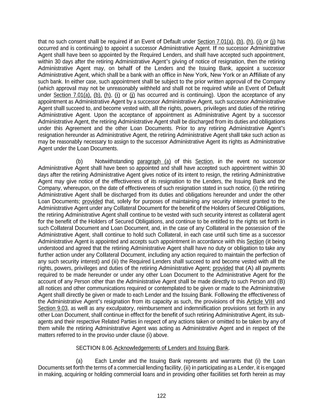 122 that no such consent shall be required if an Event of Default under Section 7.01(a), (b), (h), (i) or (j) has occurred and is continuing) to appoint a successor Administrative Agent. If no successor Administrative Agent shall have been so appointed by the Required Lenders, and shall have accepted such appointment, within 30 days after the retiring Administrative Agent’s giving of notice of resignation, then the retiring Administrative Agent may, on behalf of the Lenders and the Issuing Bank, appoint a successor Administrative Agent, which shall be a bank with an office in New York, New York or an Affiliate of any such bank. In either case, such appointment shall be subject to the prior written approval of the Company (which approval may not be unreasonably withheld and shall not be required while an Event of Default under Section 7.01(a), (b), (h), (i) or (j) has occurred and is continuing). Upon the acceptance of any appointment as Administrative Agent by a successor Administrative Agent, such successor Administrative Agent shall succeed to, and become vested with, all the rights, powers, privileges and duties of the retiring Administrative Agent. Upon the acceptance of appointment as Administrative Agent by a successor Administrative Agent, the retiring Administrative Agent shall be discharged from its duties and obligations under this Agreement and the other Loan Documents. Prior to any retiring Administrative Agent’s resignation hereunder as Administrative Agent, the retiring Administrative Agent shall take such action as may be reasonably necessary to assign to the successor Administrative Agent its rights as Administrative Agent under the Loan Documents. (b) Notwithstanding paragraph (a) of this Section, in the event no successor Administrative Agent shall have been so appointed and shall have accepted such appointment within 30 days after the retiring Administrative Agent gives notice of its intent to resign, the retiring Administrative Agent may give notice of the effectiveness of its resignation to the Lenders, the Issuing Bank and the Company, whereupon, on the date of effectiveness of such resignation stated in such notice, (i) the retiring Administrative Agent shall be discharged from its duties and obligations hereunder and under the other Loan Documents; provided that, solely for purposes of maintaining any security interest granted to the Administrative Agent under any Collateral Document for the benefit of the Holders of Secured Obligations, the retiring Administrative Agent shall continue to be vested with such security interest as collateral agent for the benefit of the Holders of Secured Obligations, and continue to be entitled to the rights set forth in such Collateral Document and Loan Document, and, in the case of any Collateral in the possession of the Administrative Agent, shall continue to hold such Collateral, in each case until such time as a successor Administrative Agent is appointed and accepts such appointment in accordance with this Section (it being understood and agreed that the retiring Administrative Agent shall have no duty or obligation to take any further action under any Collateral Document, including any action required to maintain the perfection of any such security interest) and (ii) the Required Lenders shall succeed to and become vested with all the rights, powers, privileges and duties of the retiring Administrative Agent; provided that (A) all payments required to be made hereunder or under any other Loan Document to the Administrative Agent for the account of any Person other than the Administrative Agent shall be made directly to such Person and (B) all notices and other communications required or contemplated to be given or made to the Administrative Agent shall directly be given or made to each Lender and the Issuing Bank. Following the effectiveness of the Administrative Agent’s resignation from its capacity as such, the provisions of this Article VIII and Section 9.03, as well as any exculpatory, reimbursement and indemnification provisions set forth in any other Loan Document, shall continue in effect for the benefit of such retiring Administrative Agent, its sub- agents and their respective Related Parties in respect of any actions taken or omitted to be taken by any of them while the retiring Administrative Agent was acting as Administrative Agent and in respect of the matters referred to in the proviso under clause (i) above. SECTION 8.06. Acknowledgements of Lenders and Issuing Bank. (a) Each Lender and the Issuing Bank represents and warrants that (i) the Loan Documents set forth the terms of a commercial lending facility, (ii) in participating as a Lender, it is engaged in making, acquiring or holding commercial loans and in providing other facilities set forth herein as may