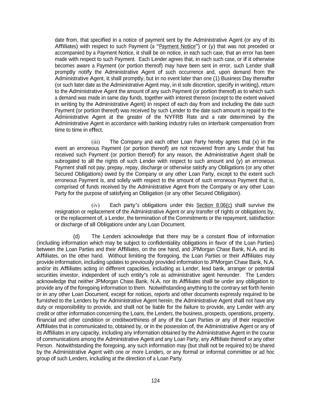 124 date from, that specified in a notice of payment sent by the Administrative Agent (or any of its Affiliates) with respect to such Payment (a “Payment Notice”) or (y) that was not preceded or accompanied by a Payment Notice, it shall be on notice, in each such case, that an error has been made with respect to such Payment. Each Lender agrees that, in each such case, or if it otherwise becomes aware a Payment (or portion thereof) may have been sent in error, such Lender shall promptly notify the Administrative Agent of such occurrence and, upon demand from the Administrative Agent, it shall promptly, but in no event later than one (1) Business Day thereafter (or such later date as the Administrative Agent may, in it sole discretion, specify in writing), return to the Administrative Agent the amount of any such Payment (or portion thereof) as to which such a demand was made in same day funds, together with interest thereon (except to the extent waived in writing by the Administrative Agent) in respect of each day from and including the date such Payment (or portion thereof) was received by such Lender to the date such amount is repaid to the Administrative Agent at the greater of the NYFRB Rate and a rate determined by the Administrative Agent in accordance with banking industry rules on interbank compensation from time to time in effect. The Company and each other Loan Party hereby agrees that (x) in the event an erroneous Payment (or portion thereof) are not recovered from any Lender that has received such Payment (or portion thereof) for any reason, the Administrative Agent shall be subrogated to all the rights of such Lender with respect to such amount and (y) an erroneous Payment shall not pay, prepay, repay, discharge or otherwise satisfy any Obligations (or any other Secured Obligations) owed by the Company or any other Loan Party, except to the extent such erroneous Payment is, and solely with respect to the amount of such erroneous Payment that is, comprised of funds received by the Administrative Agent from the Company or any other Loan Party for the purpose of satisfying an Obligation (or any other Secured Obligation). Each party’s obligations under this Section 8.06(c) shall survive the resignation or replacement of the Administrative Agent or any transfer of rights or obligations by, or the replacement of, a Lender, the termination of the Commitments or the repayment, satisfaction or discharge of all Obligations under any Loan Document. (d) The Lenders acknowledge that there may be a constant flow of information (including information which may be subject to confidentiality obligations in favor of the Loan Parties) between the Loan Parties and their Affiliates, on the one hand, and JPMorgan Chase Bank, N.A. and its Affiliates, on the other hand. Without limiting the foregoing, the Loan Parties or their Affiliates may provide information, including updates to previously provided information to JPMorgan Chase Bank, N.A. and/or its Affiliates acting in different capacities, including as Lender, lead bank, arranger or potential securities investor, independent of such entity’s role as administrative agent hereunder. The Lenders acknowledge that neither JPMorgan Chase Bank, N.A. nor its Affiliates shall be under any obligation to provide any of the foregoing information to them. Notwithstanding anything to the contrary set forth herein or in any other Loan Document, except for notices, reports and other documents expressly required to be furnished to the Lenders by the Administrative Agent herein, the Administrative Agent shall not have any duty or responsibility to provide, and shall not be liable for the failure to provide, any Lender with any credit or other information concerning the Loans, the Lenders, the business, prospects, operations, property, financial and other condition or creditworthiness of any of the Loan Parties or any of their respective Affiliates that is communicated to, obtained by, or in the possession of, the Administrative Agent or any of its Affiliates in any capacity, including any information obtained by the Administrative Agent in the course of communications among the Administrative Agent and any Loan Party, any Affiliate thereof or any other Person. Notwithstanding the foregoing, any such information may (but shall not be required to) be shared by the Administrative Agent with one or more Lenders, or any formal or informal committee or ad hoc group of such Lenders, including at the direction of a Loan Party.