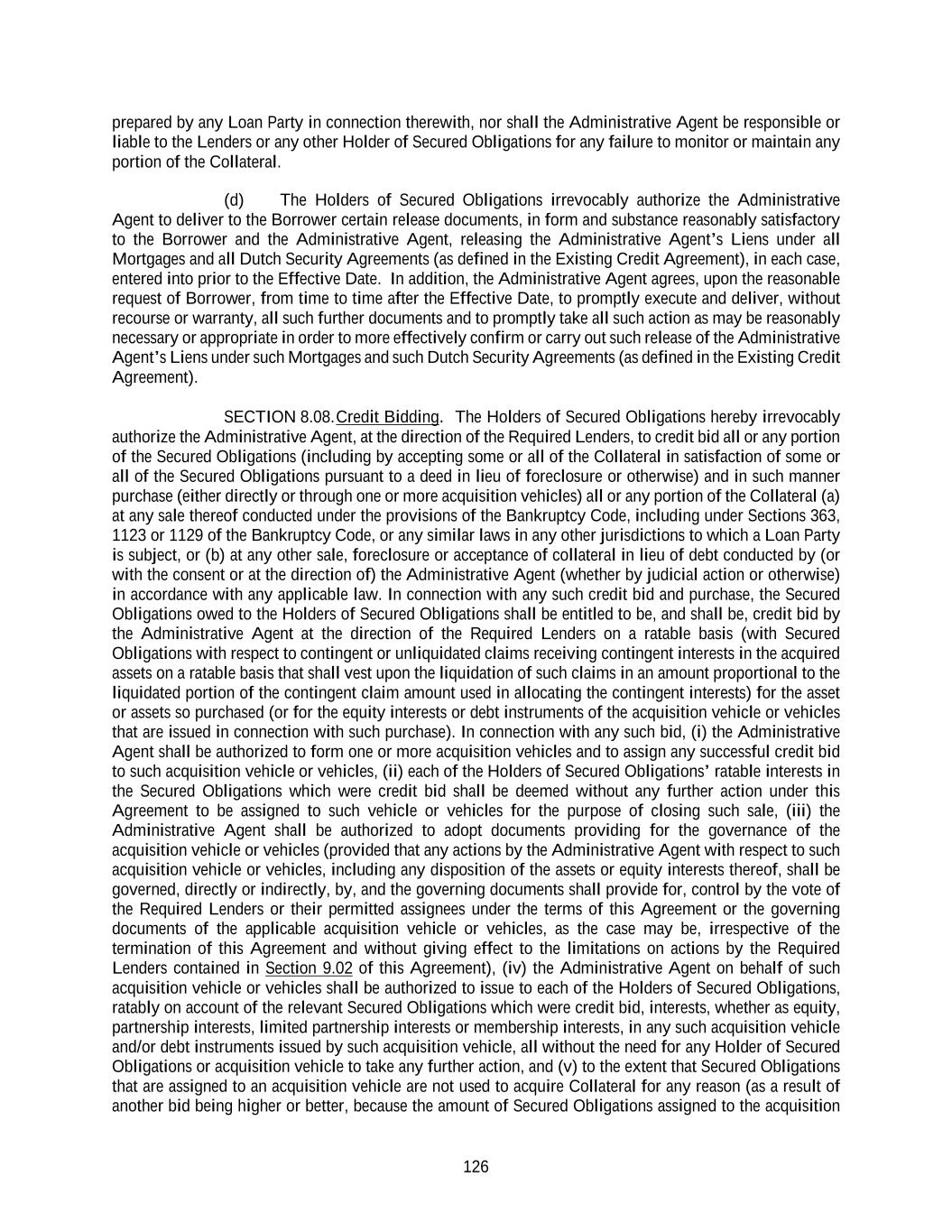 126 prepared by any Loan Party in connection therewith, nor shall the Administrative Agent be responsible or liable to the Lenders or any other Holder of Secured Obligations for any failure to monitor or maintain any portion of the Collateral. (d) The Holders of Secured Obligations irrevocably authorize the Administrative Agent to deliver to the Borrower certain release documents, in form and substance reasonably satisfactory to the Borrower and the Administrative Agent, releasing the Administrative Agent’s Liens under all Mortgages and all Dutch Security Agreements (as defined in the Existing Credit Agreement), in each case, entered into prior to the Effective Date. In addition, the Administrative Agent agrees, upon the reasonable request of Borrower, from time to time after the Effective Date, to promptly execute and deliver, without recourse or warranty, all such further documents and to promptly take all such action as may be reasonably necessary or appropriate in order to more effectively confirm or carry out such release of the Administrative Agent’s Liens under such Mortgages and such Dutch Security Agreements (as defined in the Existing Credit Agreement). SECTION 8.08. Credit Bidding. The Holders of Secured Obligations hereby irrevocably authorize the Administrative Agent, at the direction of the Required Lenders, to credit bid all or any portion of the Secured Obligations (including by accepting some or all of the Collateral in satisfaction of some or all of the Secured Obligations pursuant to a deed in lieu of foreclosure or otherwise) and in such manner purchase (either directly or through one or more acquisition vehicles) all or any portion of the Collateral (a) at any sale thereof conducted under the provisions of the Bankruptcy Code, including under Sections 363, 1123 or 1129 of the Bankruptcy Code, or any similar laws in any other jurisdictions to which a Loan Party is subject, or (b) at any other sale, foreclosure or acceptance of collateral in lieu of debt conducted by (or with the consent or at the direction of) the Administrative Agent (whether by judicial action or otherwise) in accordance with any applicable law. In connection with any such credit bid and purchase, the Secured Obligations owed to the Holders of Secured Obligations shall be entitled to be, and shall be, credit bid by the Administrative Agent at the direction of the Required Lenders on a ratable basis (with Secured Obligations with respect to contingent or unliquidated claims receiving contingent interests in the acquired assets on a ratable basis that shall vest upon the liquidation of such claims in an amount proportional to the liquidated portion of the contingent claim amount used in allocating the contingent interests) for the asset or assets so purchased (or for the equity interests or debt instruments of the acquisition vehicle or vehicles that are issued in connection with such purchase). In connection with any such bid, (i) the Administrative Agent shall be authorized to form one or more acquisition vehicles and to assign any successful credit bid to such acquisition vehicle or vehicles, (ii) each of the Holders of Secured Obligations’ ratable interests in the Secured Obligations which were credit bid shall be deemed without any further action under this Agreement to be assigned to such vehicle or vehicles for the purpose of closing such sale, (iii) the Administrative Agent shall be authorized to adopt documents providing for the governance of the acquisition vehicle or vehicles (provided that any actions by the Administrative Agent with respect to such acquisition vehicle or vehicles, including any disposition of the assets or equity interests thereof, shall be governed, directly or indirectly, by, and the governing documents shall provide for, control by the vote of the Required Lenders or their permitted assignees under the terms of this Agreement or the governing documents of the applicable acquisition vehicle or vehicles, as the case may be, irrespective of the termination of this Agreement and without giving effect to the limitations on actions by the Required Lenders contained in Section 9.02 of this Agreement), (iv) the Administrative Agent on behalf of such acquisition vehicle or vehicles shall be authorized to issue to each of the Holders of Secured Obligations, ratably on account of the relevant Secured Obligations which were credit bid, interests, whether as equity, partnership interests, limited partnership interests or membership interests, in any such acquisition vehicle and/or debt instruments issued by such acquisition vehicle, all without the need for any Holder of Secured Obligations or acquisition vehicle to take any further action, and (v) to the extent that Secured Obligations that are assigned to an acquisition vehicle are not used to acquire Collateral for any reason (as a result of another bid being higher or better, because the amount of Secured Obligations assigned to the acquisition