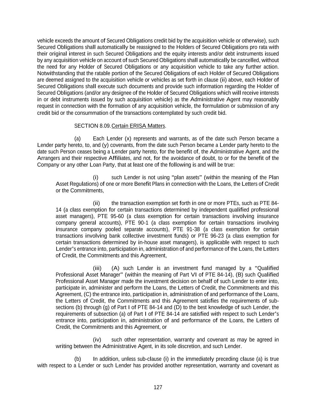 127 vehicle exceeds the amount of Secured Obligations credit bid by the acquisition vehicle or otherwise), such Secured Obligations shall automatically be reassigned to the Holders of Secured Obligations pro rata with their original interest in such Secured Obligations and the equity interests and/or debt instruments issued by any acquisition vehicle on account of such Secured Obligations shall automatically be cancelled, without the need for any Holder of Secured Obligations or any acquisition vehicle to take any further action. Notwithstanding that the ratable portion of the Secured Obligations of each Holder of Secured Obligations are deemed assigned to the acquisition vehicle or vehicles as set forth in clause (ii) above, each Holder of Secured Obligations shall execute such documents and provide such information regarding the Holder of Secured Obligations (and/or any designee of the Holder of Secured Obligations which will receive interests in or debt instruments issued by such acquisition vehicle) as the Administrative Agent may reasonably request in connection with the formation of any acquisition vehicle, the formulation or submission of any credit bid or the consummation of the transactions contemplated by such credit bid. SECTION 8.09. Certain ERISA Matters. (a) Each Lender (x) represents and warrants, as of the date such Person became a Lender party hereto, to, and (y) covenants, from the date such Person became a Lender party hereto to the date such Person ceases being a Lender party hereto, for the benefit of, the Administrative Agent, and the Arrangers and their respective Affiliates, and not, for the avoidance of doubt, to or for the benefit of the Company or any other Loan Party, that at least one of the following is and will be true: (i) such Lender is not using “plan assets” (within the meaning of the Plan Asset Regulations) of one or more Benefit Plans in connection with the Loans, the Letters of Credit or the Commitments, (ii) the transaction exemption set forth in one or more PTEs, such as PTE 84- 14 (a class exemption for certain transactions determined by independent qualified professional asset managers), PTE 95-60 (a class exemption for certain transactions involving insurance company general accounts), PTE 90-1 (a class exemption for certain transactions involving insurance company pooled separate accounts), PTE 91-38 (a class exemption for certain transactions involving bank collective investment funds) or PTE 96-23 (a class exemption for certain transactions determined by in-house asset managers), is applicable with respect to such Lender’s entrance into, participation in, administration of and performance of the Loans, the Letters of Credit, the Commitments and this Agreement, (iii) (A) such Lender is an investment fund managed by a “Qualified Professional Asset Manager” (within the meaning of Part VI of PTE 84-14), (B) such Qualified Professional Asset Manager made the investment decision on behalf of such Lender to enter into, participate in, administer and perform the Loans, the Letters of Credit, the Commitments and this Agreement, (C) the entrance into, participation in, administration of and performance of the Loans, the Letters of Credit, the Commitments and this Agreement satisfies the requirements of sub- sections (b) through (g) of Part I of PTE 84-14 and (D) to the best knowledge of such Lender, the requirements of subsection (a) of Part I of PTE 84-14 are satisfied with respect to such Lender’s entrance into, participation in, administration of and performance of the Loans, the Letters of Credit, the Commitments and this Agreement, or (iv) such other representation, warranty and covenant as may be agreed in writing between the Administrative Agent, in its sole discretion, and such Lender. (b) In addition, unless sub-clause (i) in the immediately preceding clause (a) is true with respect to a Lender or such Lender has provided another representation, warranty and covenant as