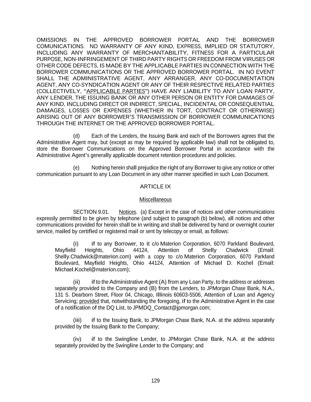 129 OMISSIONS IN THE APPROVED BORROWER PORTAL AND THE BORROWER COMUNICATIONS. NO WARRANTY OF ANY KIND, EXPRESS, IMPLIED OR STATUTORY, INCLUDING ANY WARRANTY OF MERCHANTABILITY, FITNESS FOR A PARTICULAR PURPOSE, NON-INFRINGEMENT OF THIRD PARTY RIGHTS OR FREEDOM FROM VIRUSES OR OTHER CODE DEFECTS, IS MADE BY THE APPLICABLE PARTIES IN CONNECTION WITH THE BORROWER COMMUNICATIONS OR THE APPROVED BORROWER PORTAL. IN NO EVENT SHALL THE ADMINISTRATIVE AGENT, ANY ARRANGER, ANY CO-DOCUMENTATION AGENT, ANY CO-SYNDICATION AGENT OR ANY OF THEIR RESPECTIVE RELATED PARTIES (COLLECTIVELY, “APPLICABLE PARTIES”) HAVE ANY LIABILITY TO ANY LOAN PARTY, ANY LENDER, THE ISSUING BANK OR ANY OTHER PERSON OR ENTITY FOR DAMAGES OF ANY KIND, INCLUDING DIRECT OR INDIRECT, SPECIAL, INCIDENTAL OR CONSEQUENTIAL DAMAGES, LOSSES OR EXPENSES (WHETHER IN TORT, CONTRACT OR OTHERWISE) ARISING OUT OF ANY BORROWER’S TRANSMISSION OF BORROWER COMMUNICATIONS THROUGH THE INTERNET OR THE APPROVED BORROWER PORTAL. (d) Each of the Lenders, the Issuing Bank and each of the Borrowers agrees that the Administrative Agent may, but (except as may be required by applicable law) shall not be obligated to, store the Borrower Communications on the Approved Borrower Portal in accordance with the Administrative Agent’s generally applicable document retention procedures and policies. (e) Nothing herein shall prejudice the right of any Borrower to give any notice or other communication pursuant to any Loan Document in any other manner specified in such Loan Document. ARTICLE IX Miscellaneous SECTION 9.01. Notices. (a) Except in the case of notices and other communications expressly permitted to be given by telephone (and subject to paragraph (b) below), all notices and other communications provided for herein shall be in writing and shall be delivered by hand or overnight courier service, mailed by certified or registered mail or sent by telecopy or email, as follows: (i) if to any Borrower, to it c/o Materion Corporation, 6070 Parkland Boulevard, Mayfield Heights, Ohio 44124, Attention of Shelly Chadwick (Email: Shelly.Chadwick@materion.com) with a copy to c/o Materion Corporation, 6070 Parkland Boulevard, Mayfield Heights, Ohio 44124, Attention of Michael D. Kochel (Email: Michael.Kochel@materion.com); (ii) if to the Administrative Agent (A) from any Loan Party, to the address or addresses separately provided to the Company and (B) from the Lenders, to JPMorgan Chase Bank, N.A., 131 S. Dearborn Street, Floor 04, Chicago, Illinois 60603-5506, Attention of Loan and Agency Servicing; provided that, notwithstanding the foregoing, if to the Administrative Agent in the case of a notification of the DQ List, to JPMDQ_Contact@jpmorgan.com; (iii) if to the Issuing Bank, to JPMorgan Chase Bank, N.A. at the address separately provided by the Issuing Bank to the Company; (iv) if to the Swingline Lender, to JPMorgan Chase Bank, N.A. at the address separately provided by the Swingline Lender to the Company; and