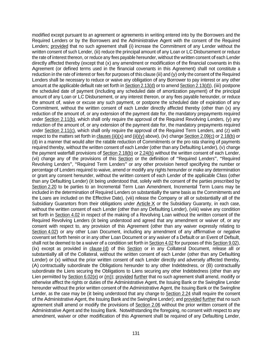 131 modified except pursuant to an agreement or agreements in writing entered into by the Borrowers and the Required Lenders or by the Borrowers and the Administrative Agent with the consent of the Required Lenders; provided that no such agreement shall (i) increase the Commitment of any Lender without the written consent of such Lender, (ii) reduce the principal amount of any Loan or LC Disbursement or reduce the rate of interest thereon, or reduce any fees payable hereunder, without the written consent of each Lender directly affected thereby (except that (x) any amendment or modification of the financial covenants in this Agreement (or defined terms used in the financial covenants in this Agreement) shall not constitute a reduction in the rate of interest or fees for purposes of this clause (ii) and (y) only the consent of the Required Lenders shall be necessary to reduce or waive any obligation of any Borrower to pay interest or any other amount at the applicable default rate set forth in Section 2.13(d) or to amend Section 2.13(d)), (iii) postpone the scheduled date of payment (including any scheduled date of amortization payment) of the principal amount of any Loan or LC Disbursement, or any interest thereon, or any fees payable hereunder, or reduce the amount of, waive or excuse any such payment, or postpone the scheduled date of expiration of any Commitment, without the written consent of each Lender directly affected thereby (other than (x) any reduction of the amount of, or any extension of the payment date for, the mandatory prepayments required under Section 2.11(b), which shall only require the approval of the Required Revolving Lenders, (y) any reduction of the amount of, or any extension of the payment date for, the mandatory prepayments required under Section 2.11(c), which shall only require the approval of the Required Term Lenders, and (z) with respect to the matters set forth in clauses (ii)(x) and (ii)(y) above), (iv) change Section 2.09(c) or 2.18(b) or (d) in a manner that would alter the ratable reduction of Commitments or the pro rata sharing of payments required thereby, without the written consent of each Lender (other than any Defaulting Lender), (v) change the payment waterfall provisions of Section 2.18(b) or 2.24(b) without the written consent of each Lender, (vi) change any of the provisions of this Section or the definition of “Required Lenders”, “Required Revolving Lenders”, “Required Term Lenders” or any other provision hereof specifying the number or percentage of Lenders required to waive, amend or modify any rights hereunder or make any determination or grant any consent hereunder, without the written consent of each Lender of the applicable Class (other than any Defaulting Lender) (it being understood that, solely with the consent of the parties prescribed by Section 2.20 to be parties to an Incremental Term Loan Amendment, Incremental Term Loans may be included in the determination of Required Lenders on substantially the same basis as the Commitments and the Loans are included on the Effective Date), (vii) release the Company or all or substantially all of the Subsidiary Guarantors from their obligations under Article X or the Subsidiary Guaranty, in each case, without the written consent of each Lender (other than any Defaulting Lender), (viii) waive any condition set forth in Section 4.02 in respect of the making of a Revolving Loan without the written consent of the Required Revolving Lenders (it being understood and agreed that any amendment or waiver of, or any consent with respect to, any provision of this Agreement (other than any waiver expressly relating to Section 4.02) or any other Loan Document, including any amendment of any affirmative or negative covenant set forth herein or in any other Loan Document or any waiver of a Default or an Event of Default, shall not be deemed to be a waiver of a condition set forth in Section 4.02 for purposes of this Section 9.02), (ix) except as provided in clause (d) of this Section or in any Collateral Document, release all or substantially all of the Collateral, without the written consent of each Lender (other than any Defaulting Lender) or (x) without the prior written consent of each Lender directly and adversely affected thereby, (A) contractually subordinate the Obligations hereunder to any other Indebtedness, or (B) contractually subordinate the Liens securing the Obligations to Liens securing any other Indebtedness (other than any Lien permitted by Section 6.02(e) or (m)); provided further that no such agreement shall amend, modify or otherwise affect the rights or duties of the Administrative Agent, the Issuing Bank or the Swingline Lender hereunder without the prior written consent of the Administrative Agent, the Issuing Bank or the Swingline Lender, as the case may be (it being understood that any change to Section 2.24 shall require the consent of the Administrative Agent, the Issuing Bank and the Swingline Lender); and provided further that no such agreement shall amend or modify the provisions of Section 2.06 without the prior written consent of the Administrative Agent and the Issuing Bank. Notwithstanding the foregoing, no consent with respect to any amendment, waiver or other modification of this Agreement shall be required of any Defaulting Lender,